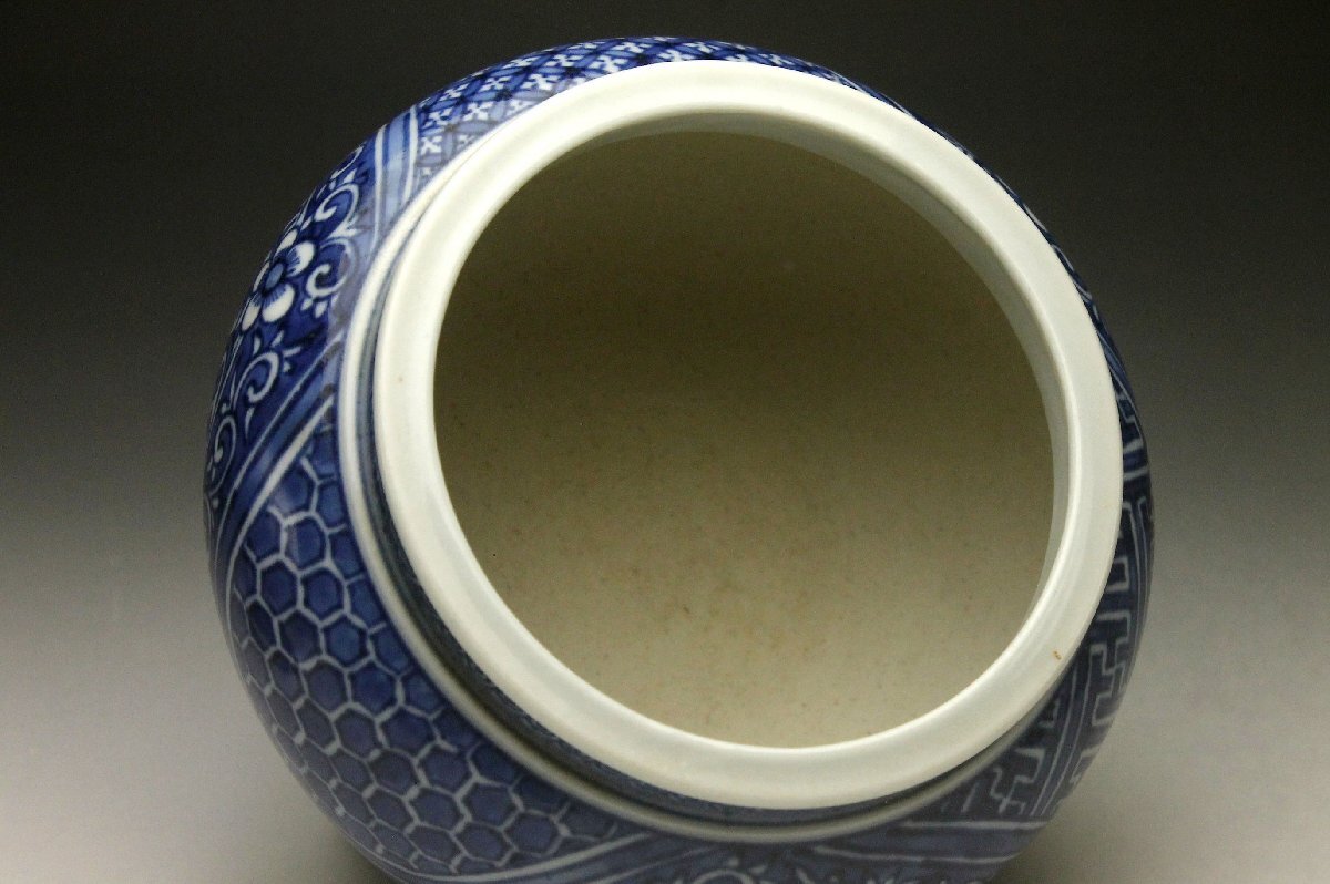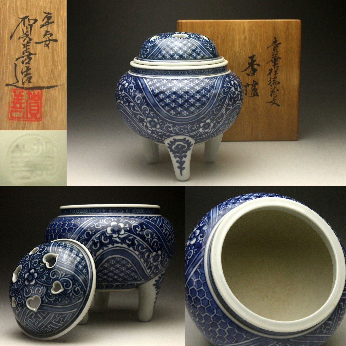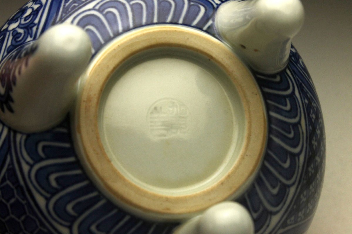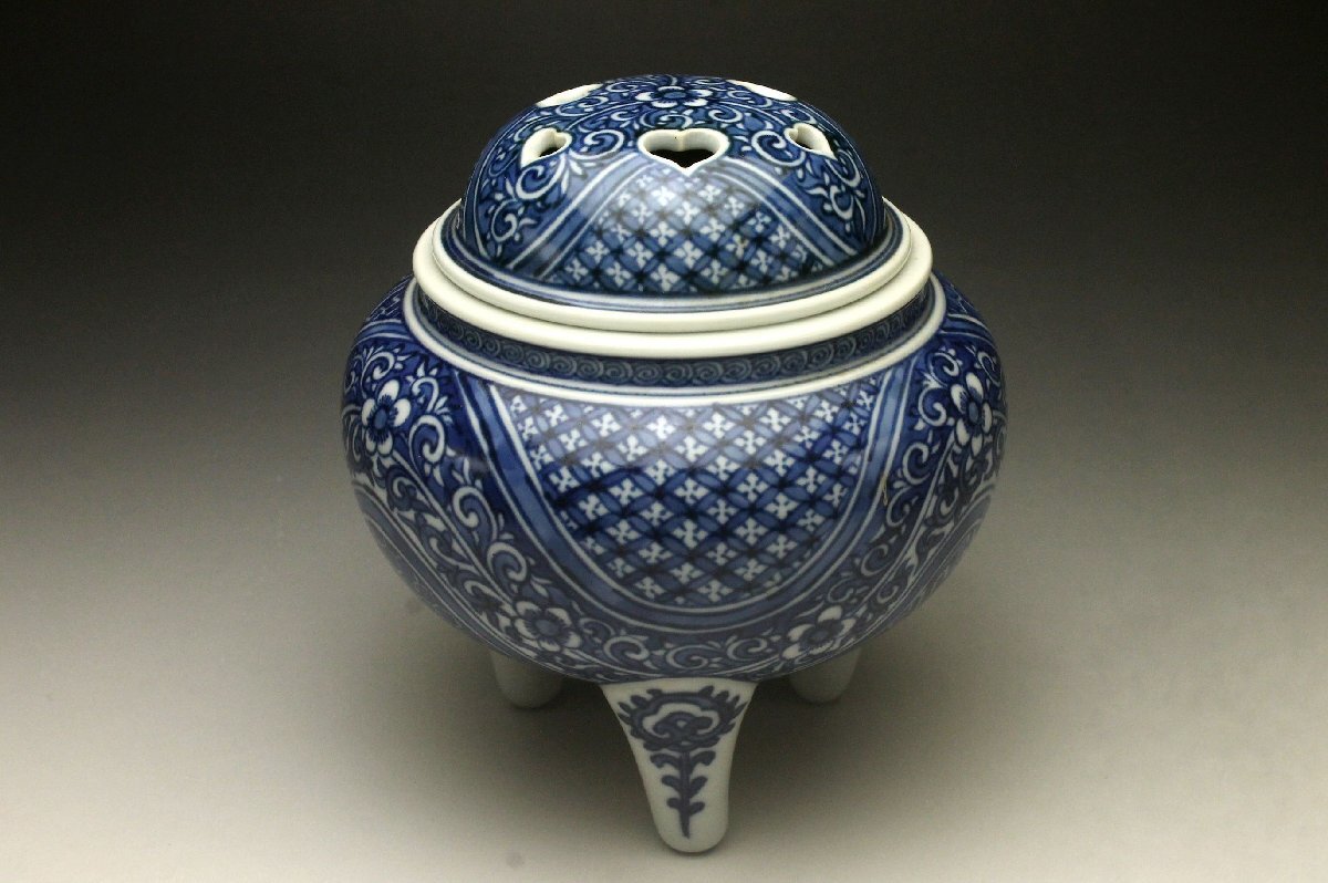 【余韻】 清水焼 北村賀善 青華祥瑞花文 香炉★無傷美品 茶道具 共箱<同梱可>