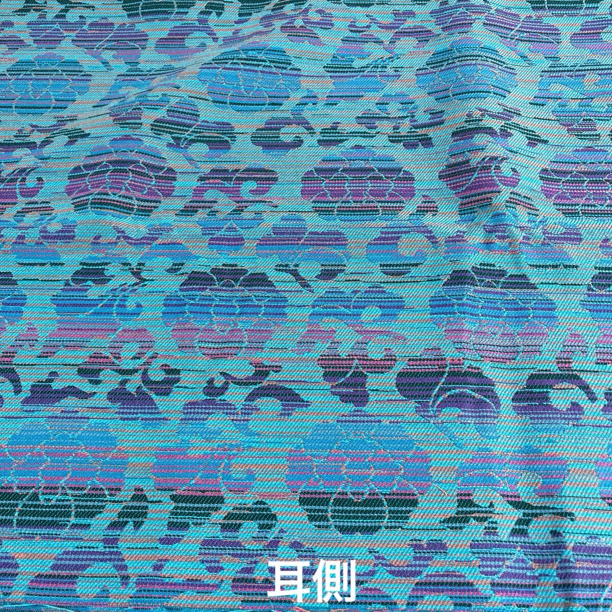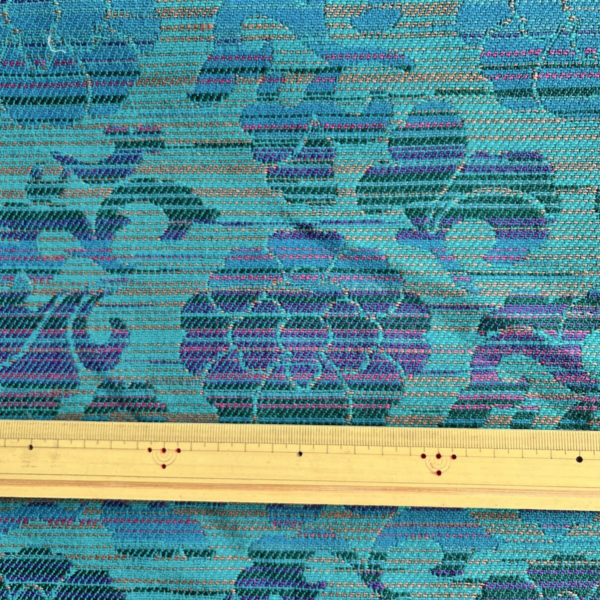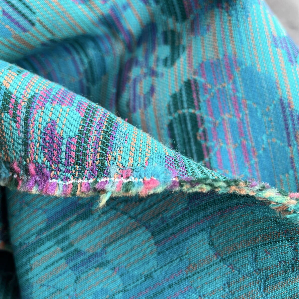 鮮やかなターコイズブルーにピンクやオレンジの糸が映えるウール混ジャカード生地。やや固めの風合いで、ジャケットやバッグなどしっかりしたアイテムに最適です。