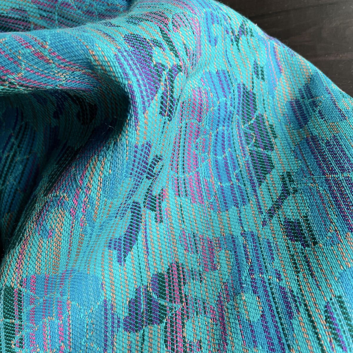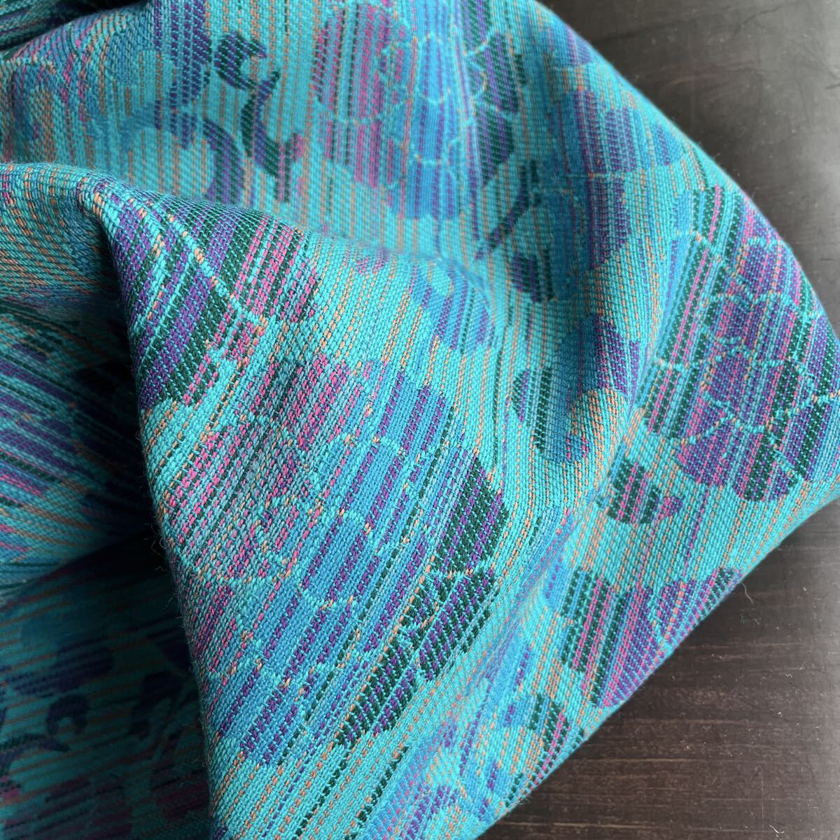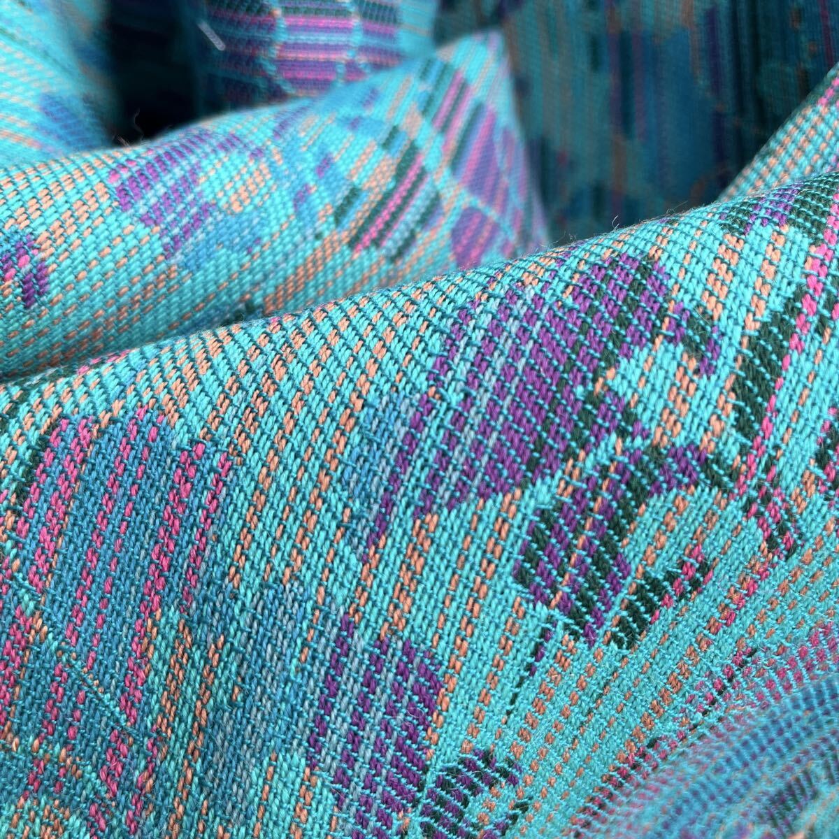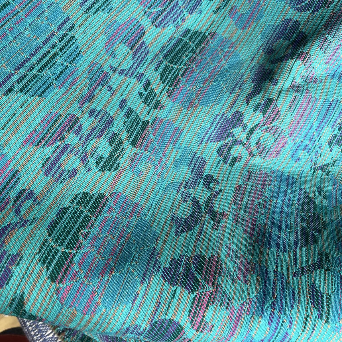 鮮やかなターコイズブルーにピンクやオレンジの糸が映えるウール混ジャカード生地。やや固めの風合いで、ジャケットやバッグなどしっかりしたアイテムに最適です。