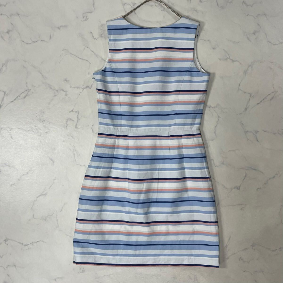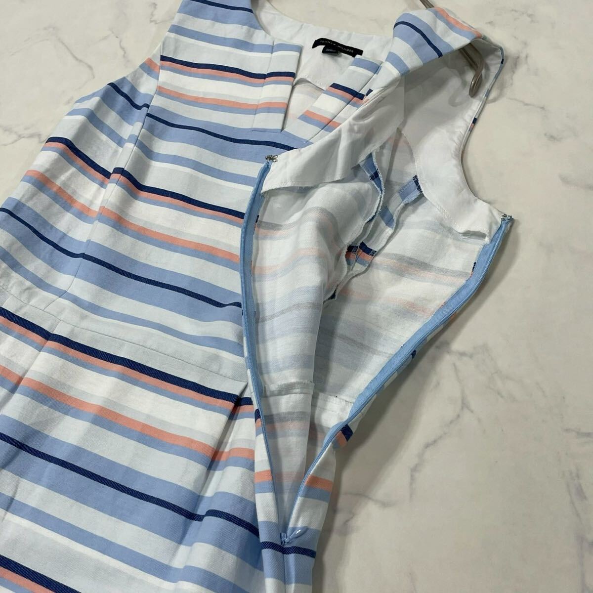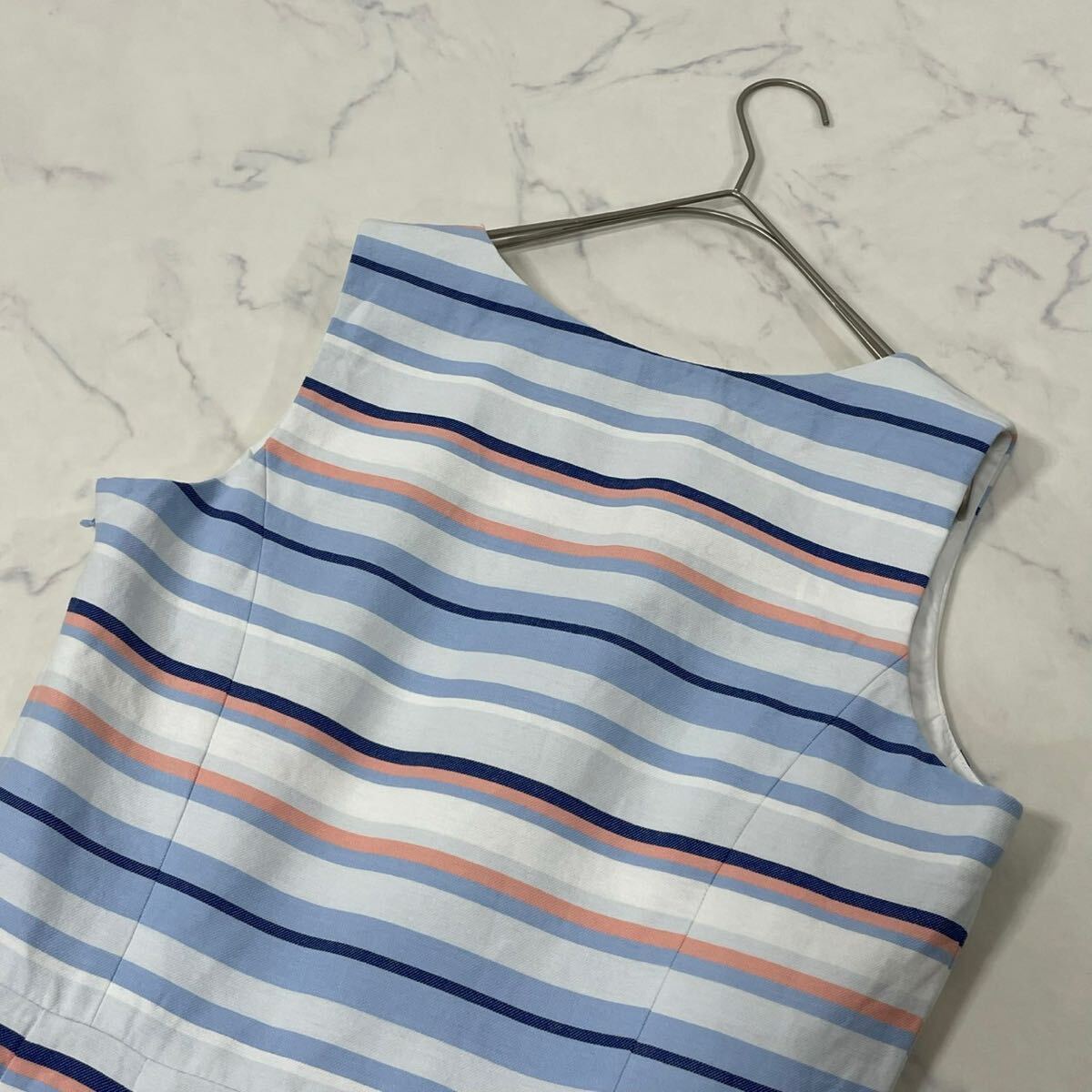 切替 ボーダー 裏地付き タック ジップ キーネック コットン ノースリーブ ひざ丈 ワンピース