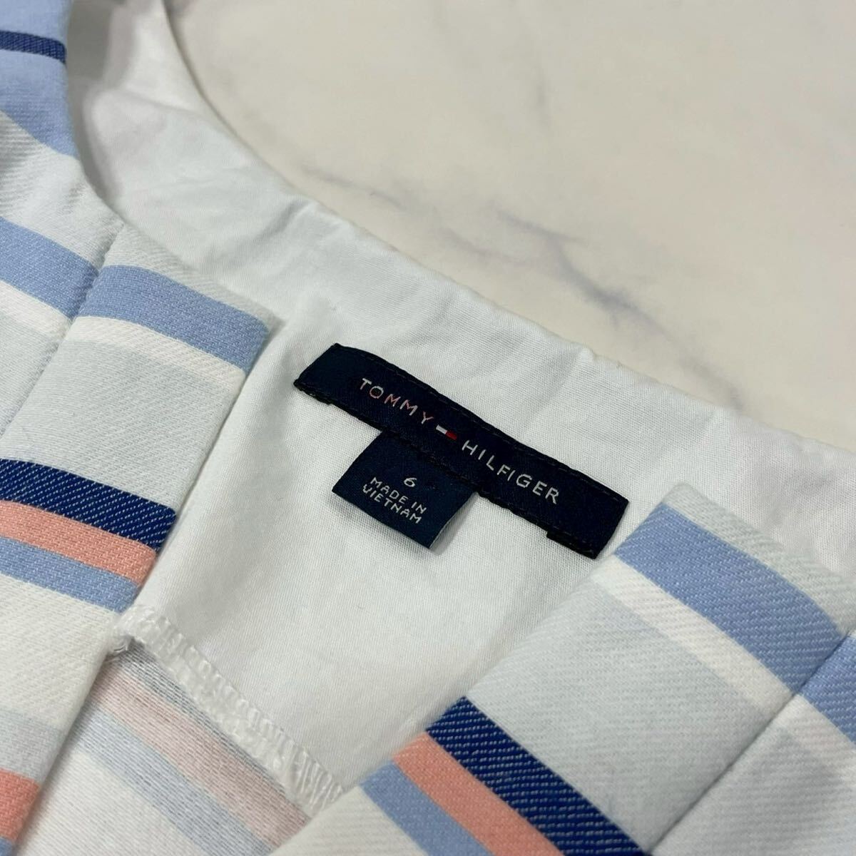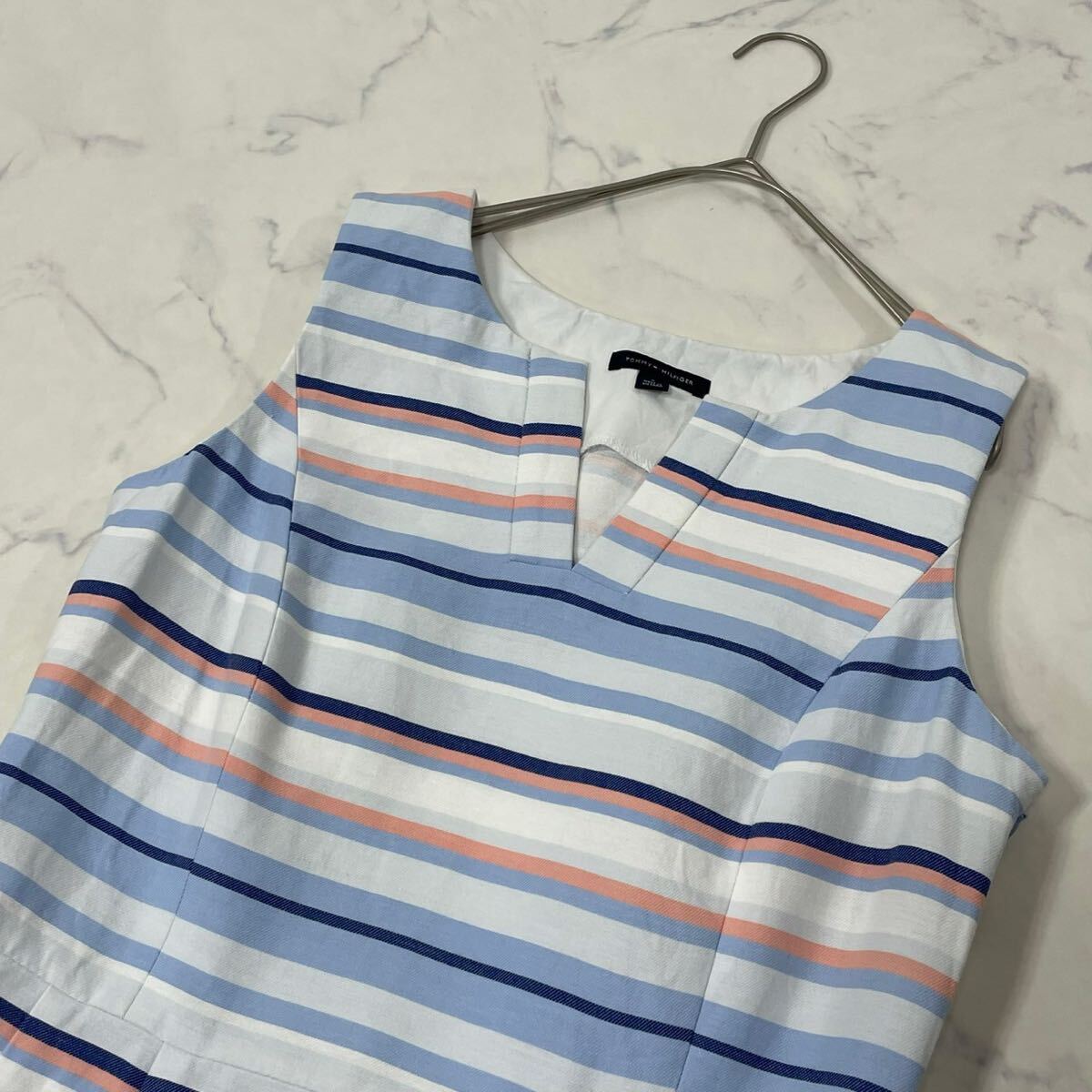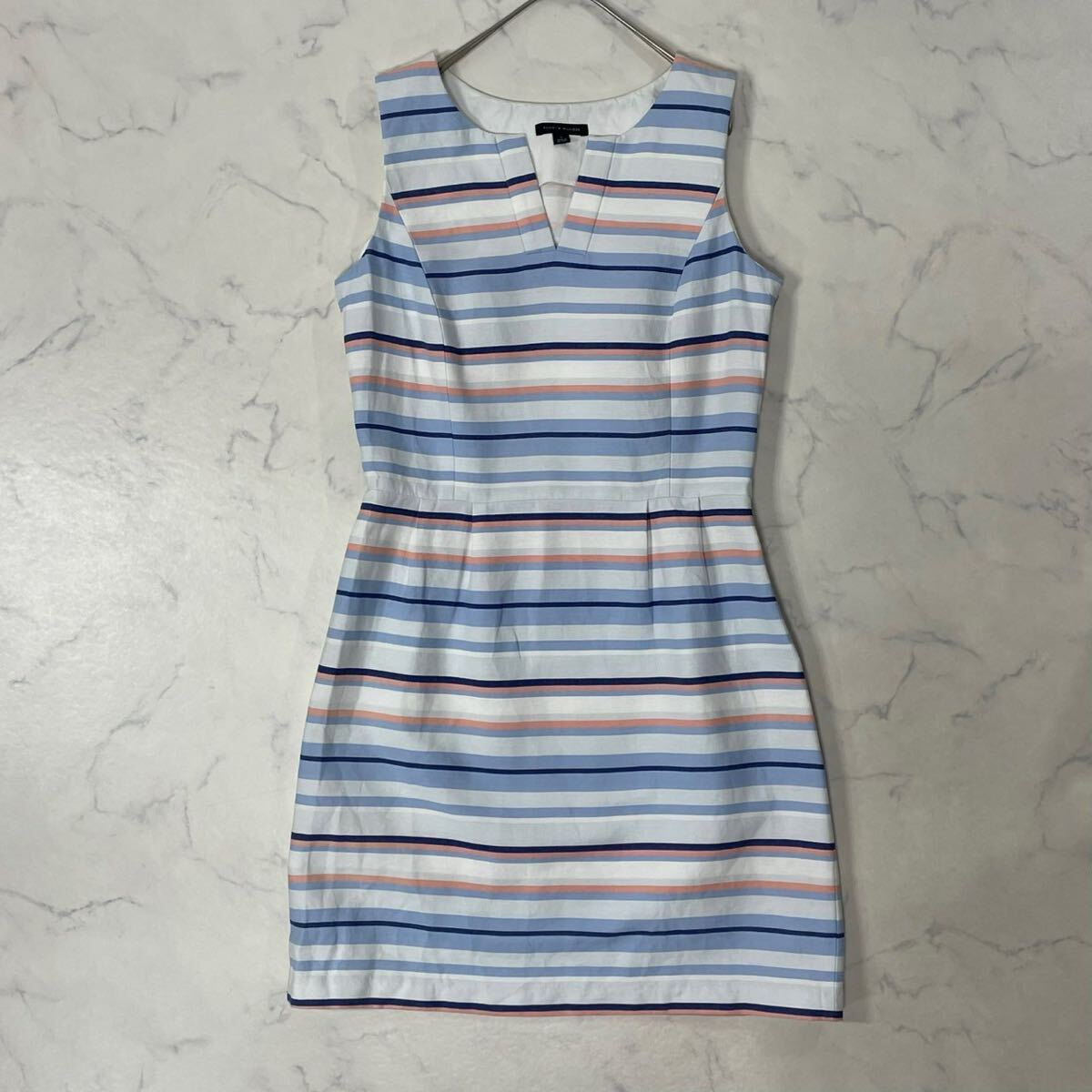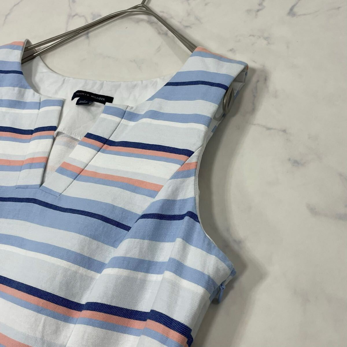 切替 ボーダー 裏地付き タック ジップ キーネック コットン ノースリーブ ひざ丈 ワンピース