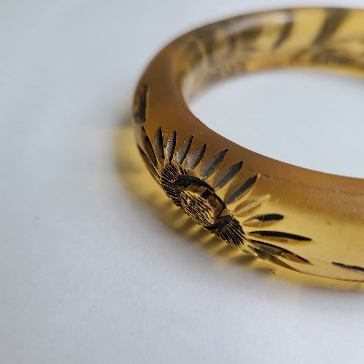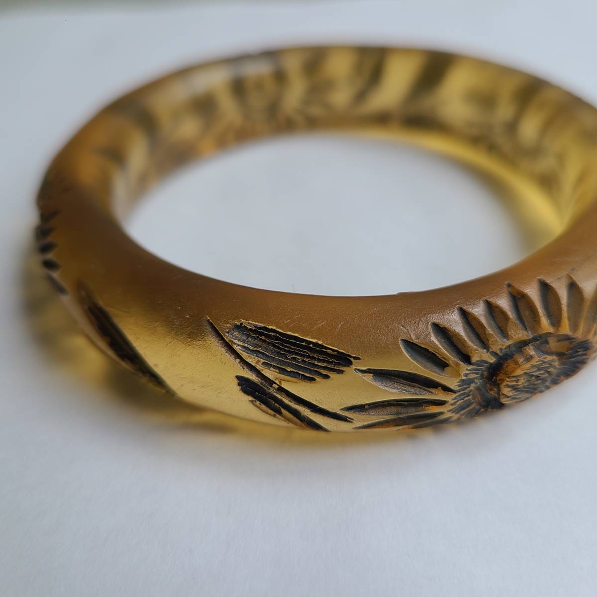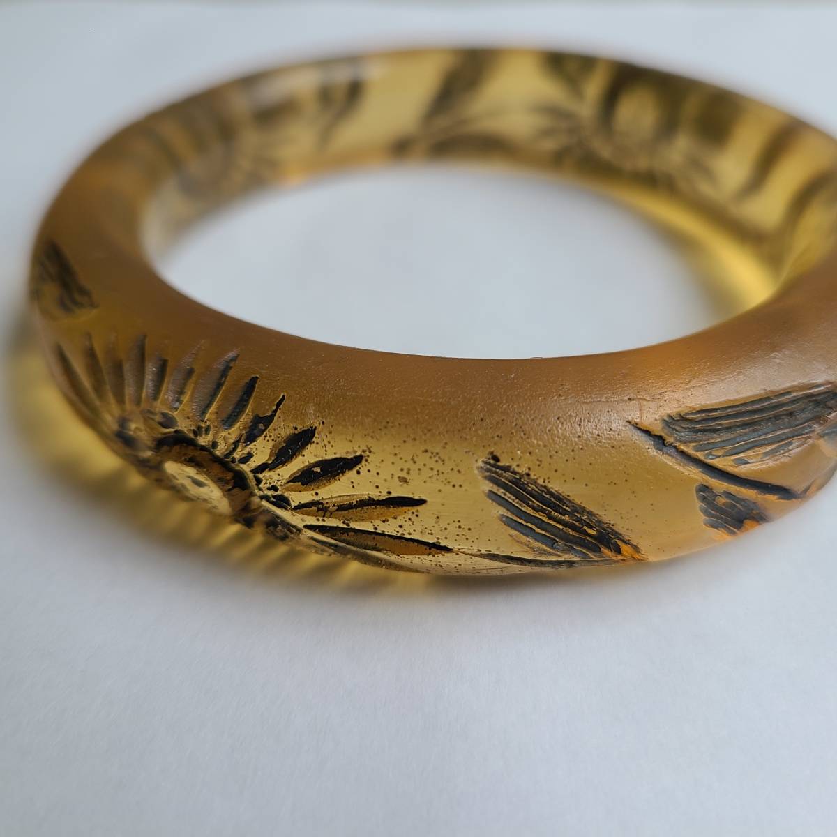 ベークライトの「アップルジュース」カラーに似た、半透明のアンバーカラーの樹脂素材に、花と葉の模様が彫られています。