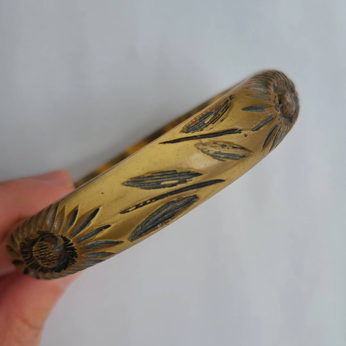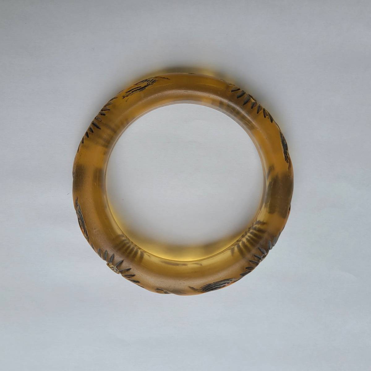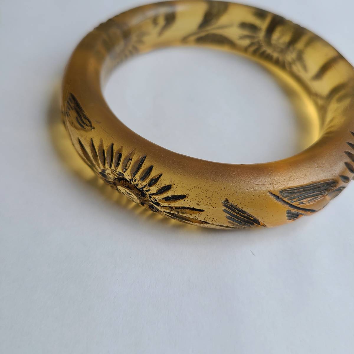 ベークライトの「アップルジュース」カラーに似た、半透明のアンバーカラーの樹脂素材に、花と葉の模様が彫られています。