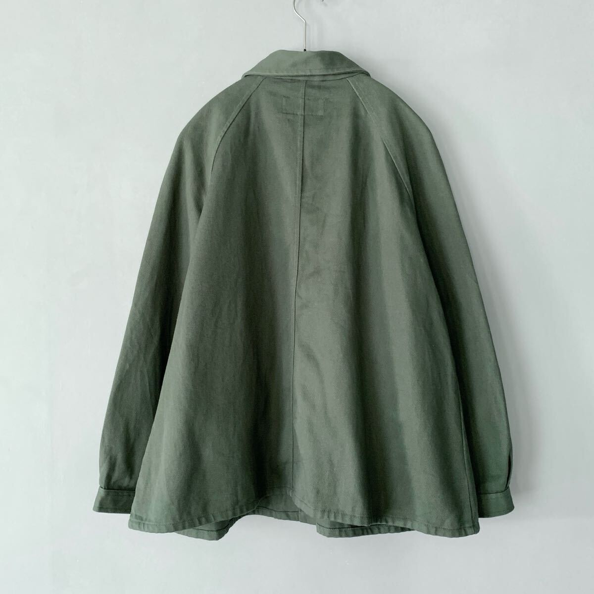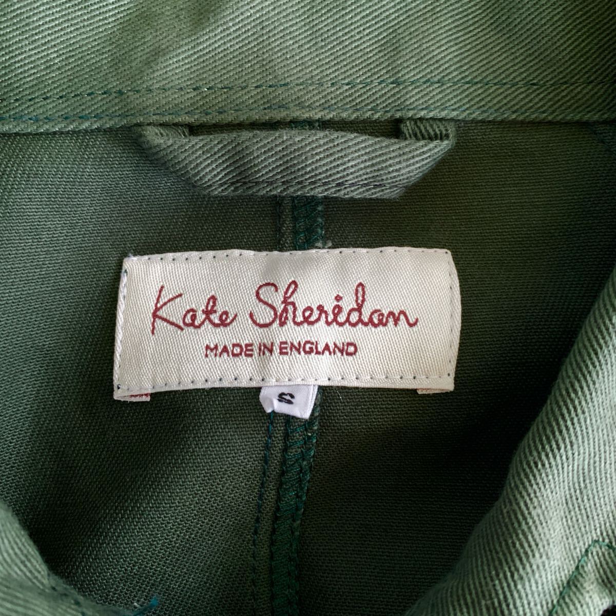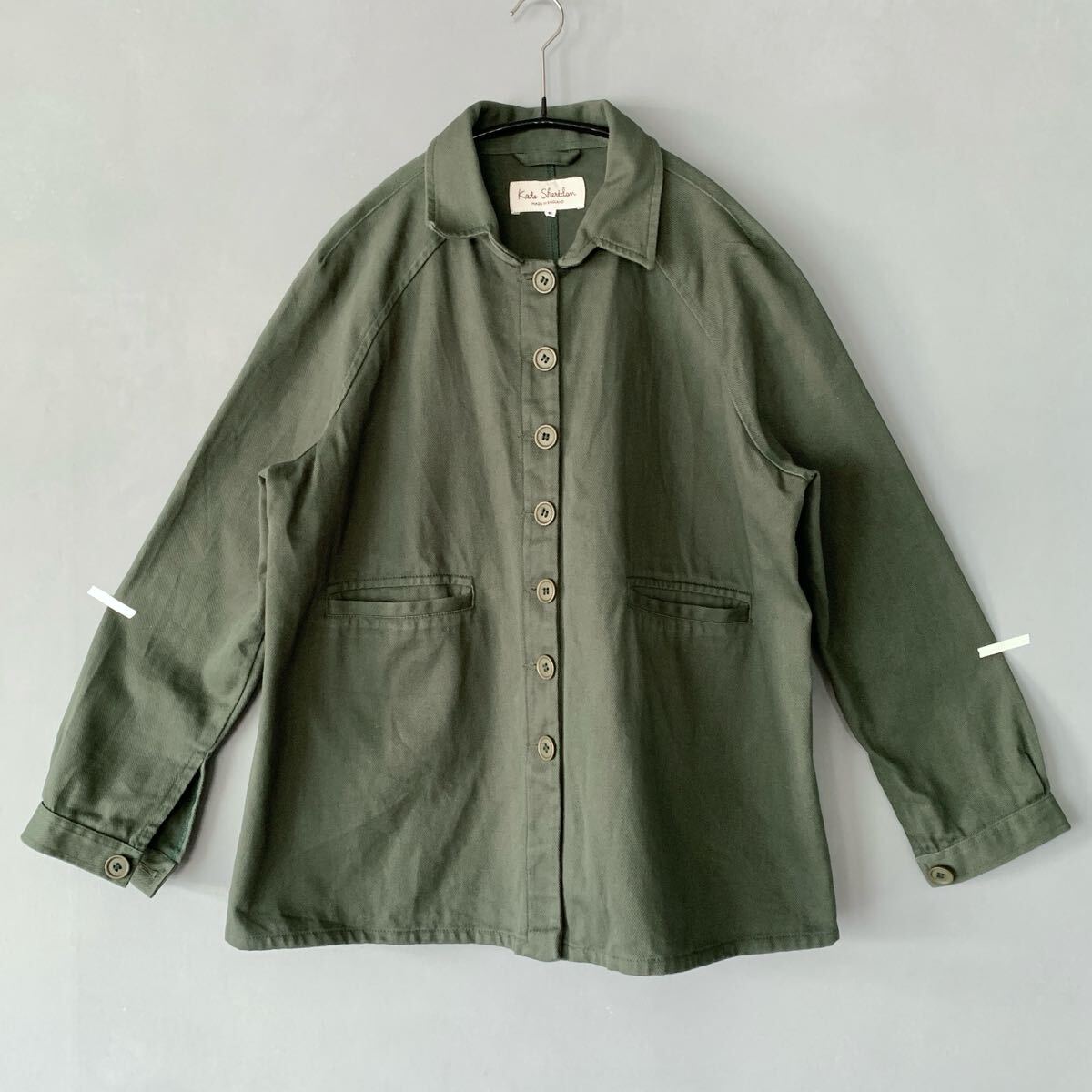 イギリス製品の輸入で有名な渡辺産業が展開するイギリスのブランド、ケイト・シェリダンのワークジャケットです。襟のデザイン、ボタンの数、Aラインのシルエットなど、一般的なワークジャケットから大きくアレンジを施しているとてもかわいい1枚です。厚手のコットン、裏地なし、ショート丈です。