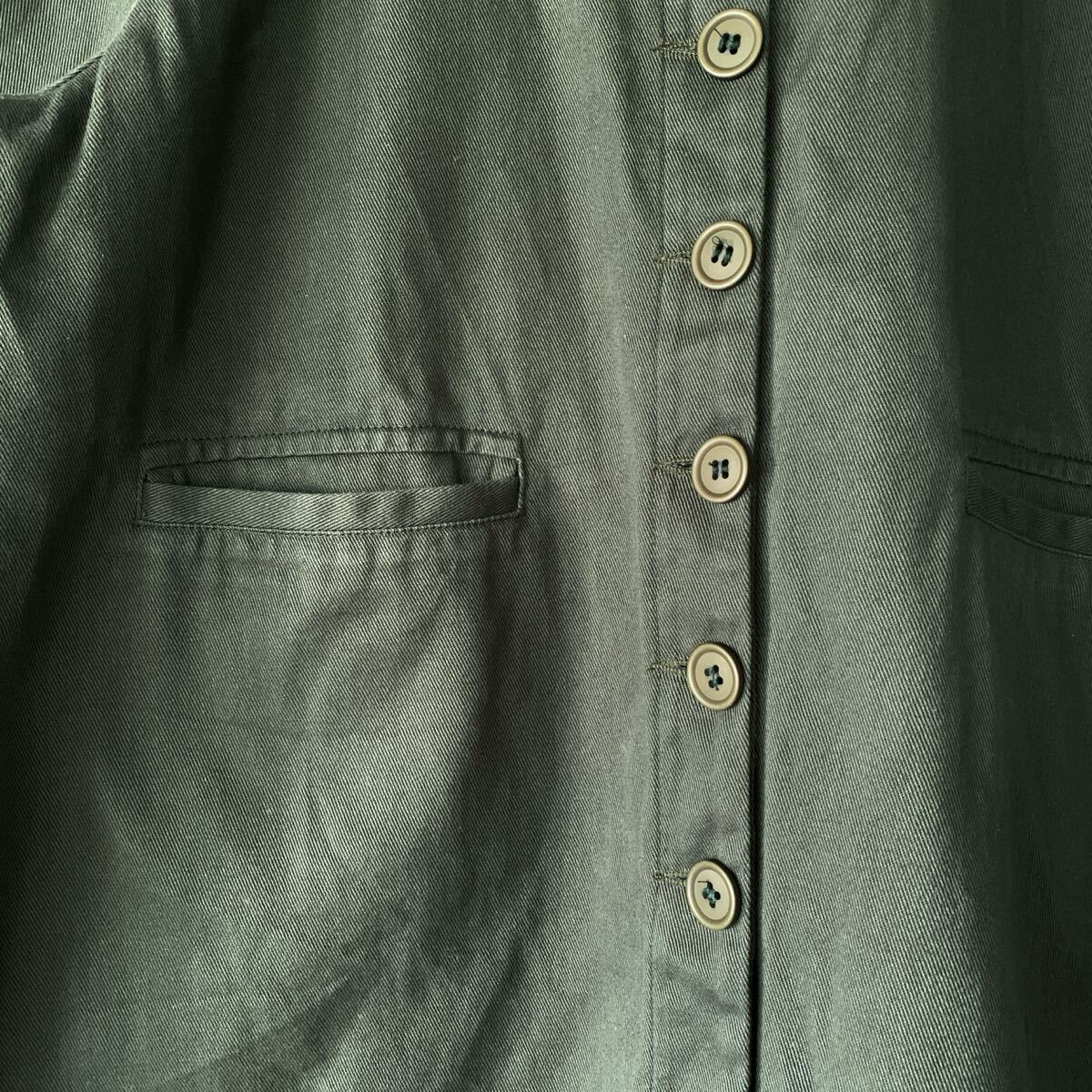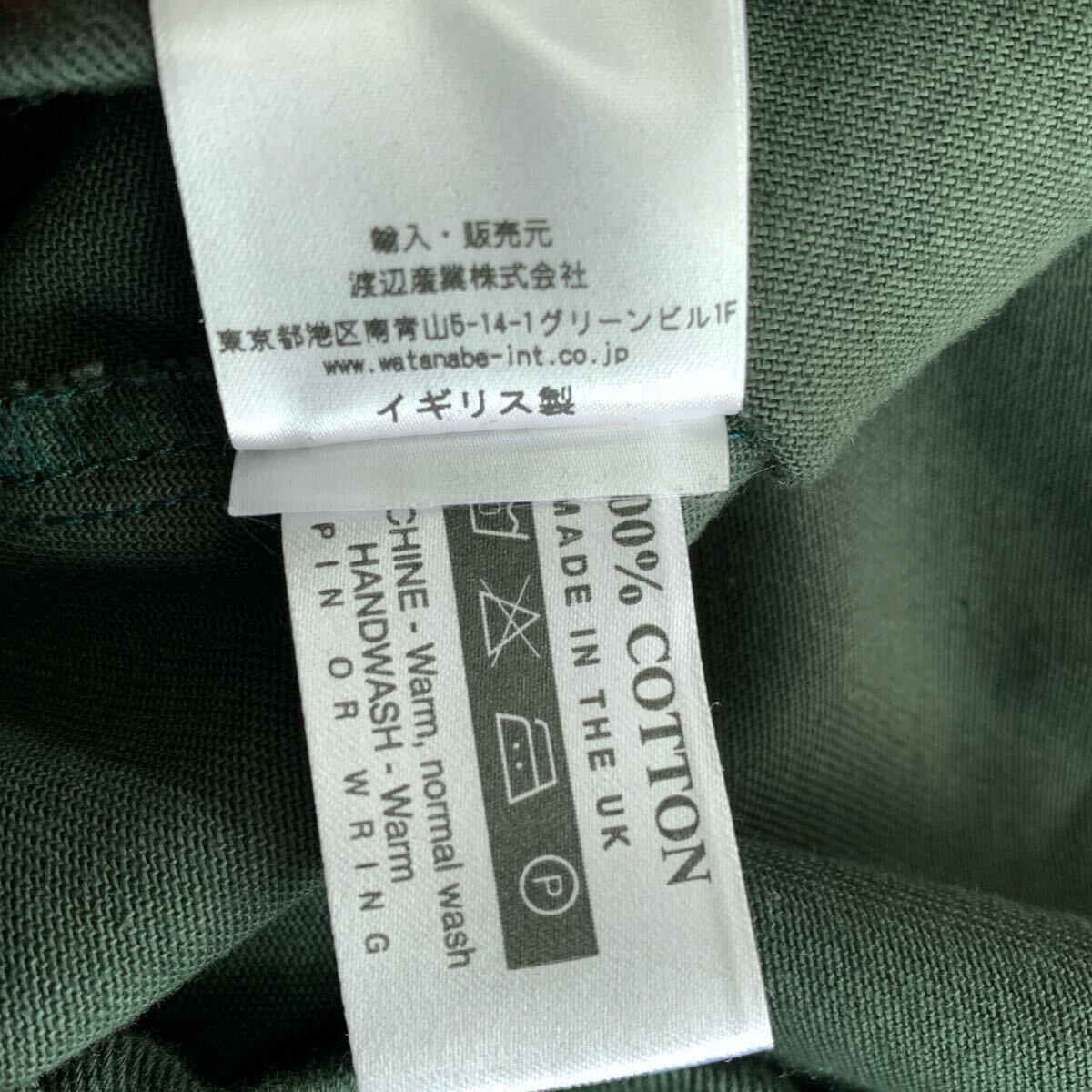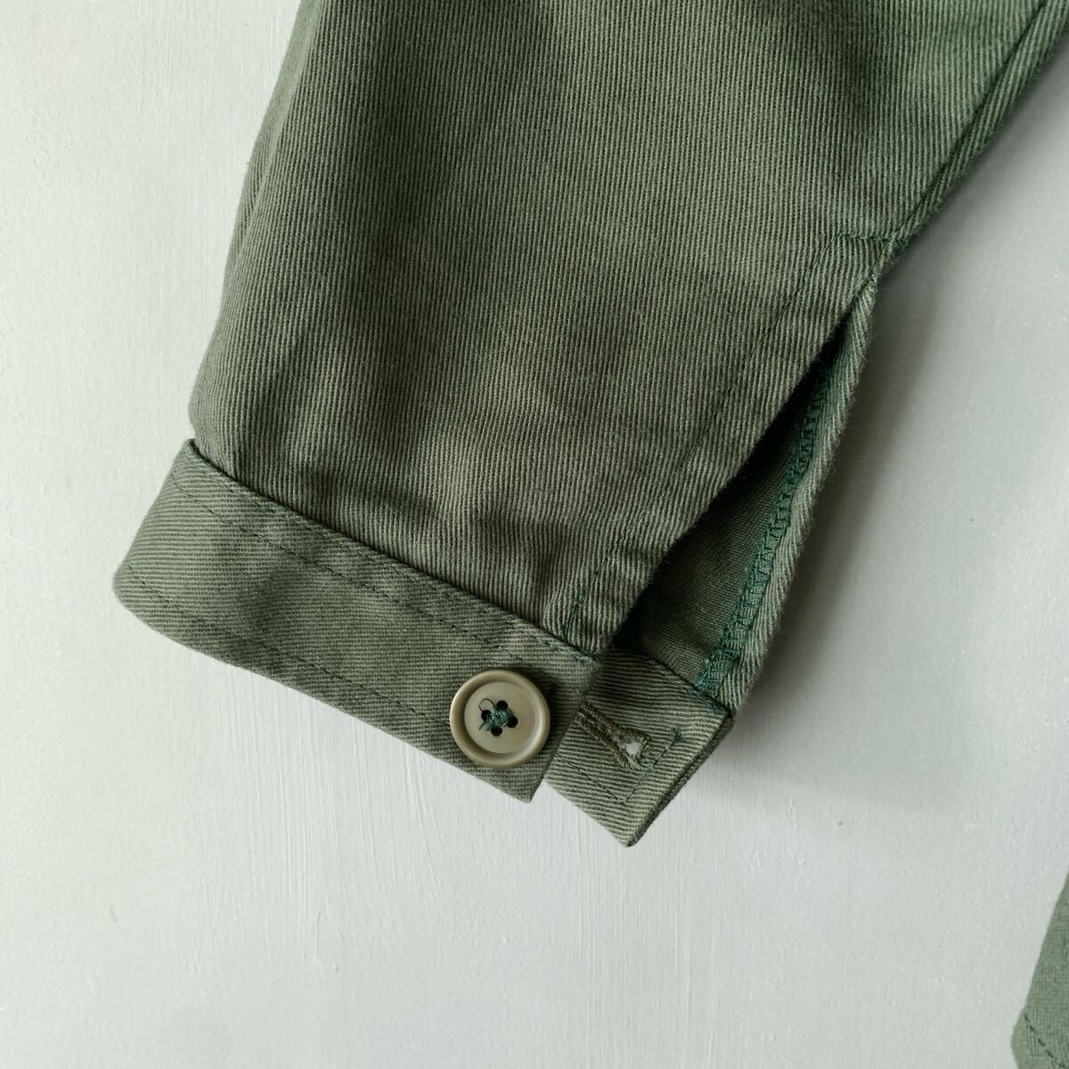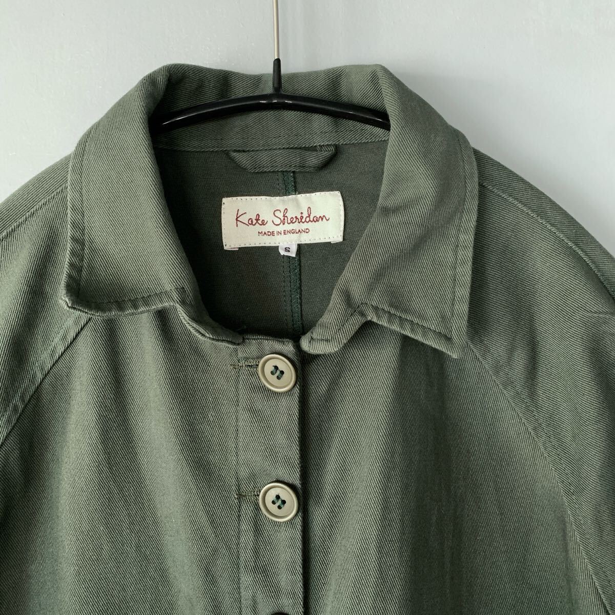 イギリス製品の輸入で有名な渡辺産業が展開するイギリスのブランド、ケイト・シェリダンのワークジャケットです。襟のデザイン、ボタンの数、Aラインのシルエットなど、一般的なワークジャケットから大きくアレンジを施しているとてもかわいい1枚です。厚手のコットン、裏地なし、ショート丈です。