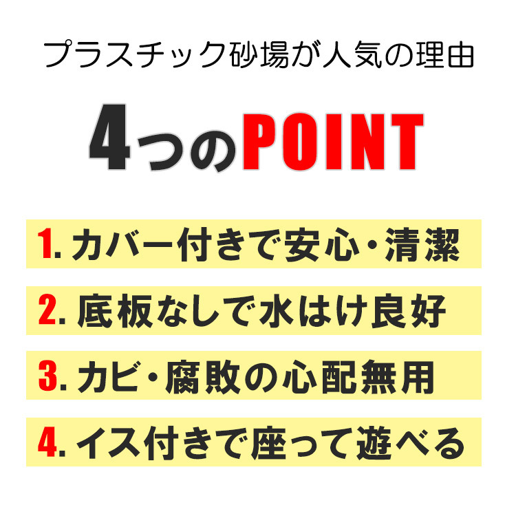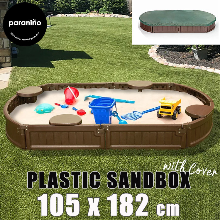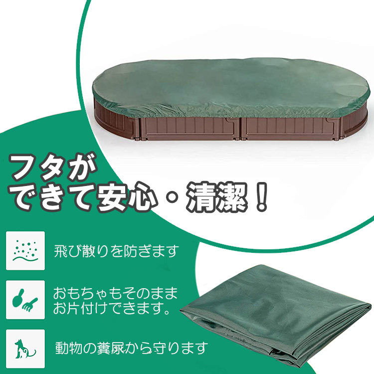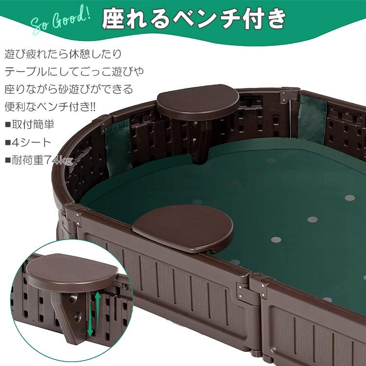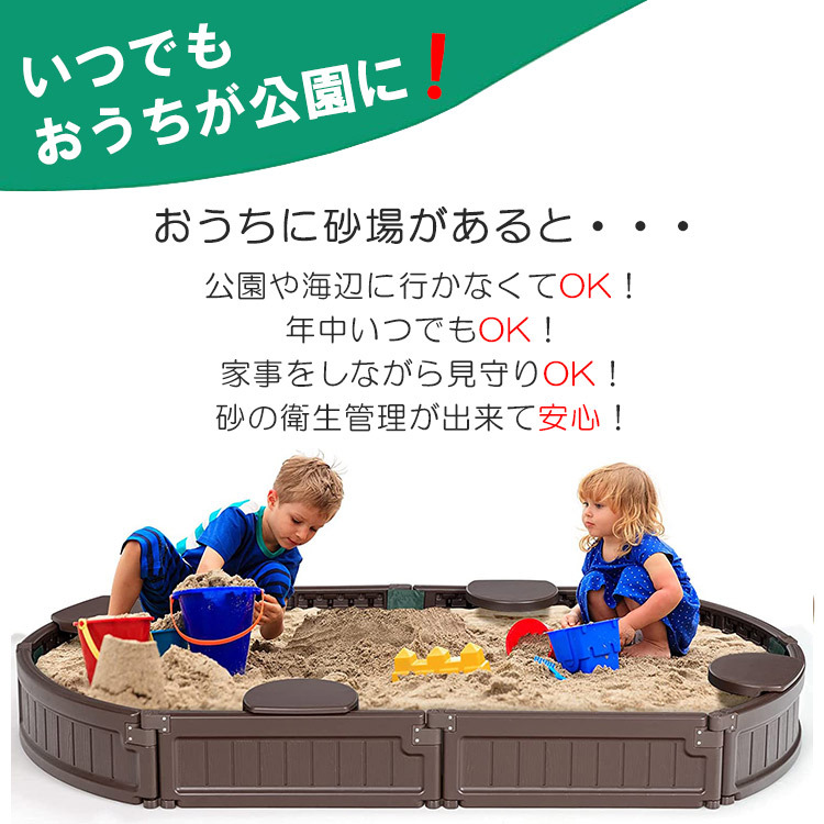 | 仕様 | 動物から砂場を守るカバー付き 座って遊べる椅子付き 遊んでいない間に動物に砂場を 荒らされてしまったり、 風で砂が舞ってしまうのを防ぐ カバーが付属します。 砂場の縁にはベンチ付きで座って遊ぶ事ができます。 砂遊びが終わる頃にはガーデニングを楽しむ花壇としてもお使いいただけます。 ※砂・おもちゃ等は付属しません |