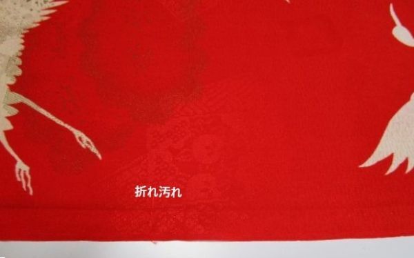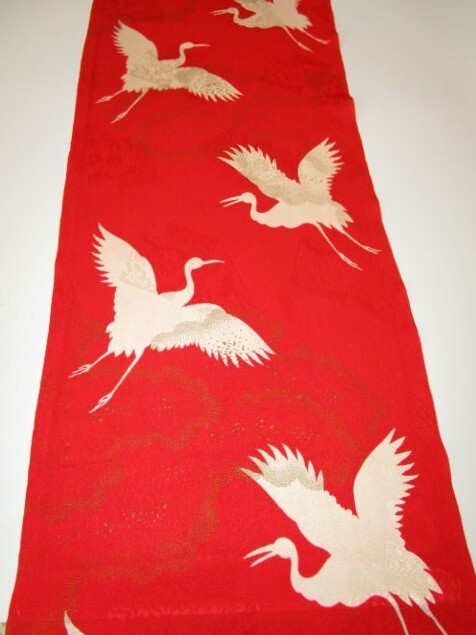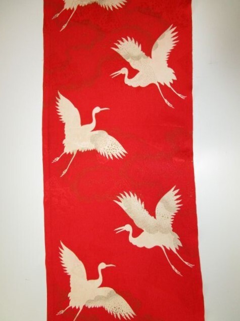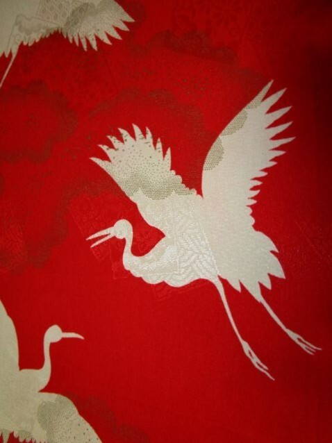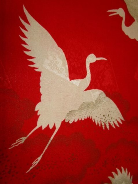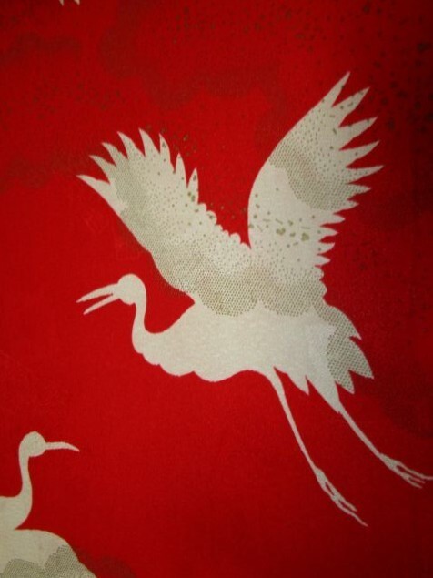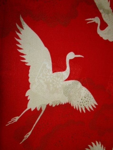 F-21★赤地*鶴*飛鶴*雲取り*人絹*古布はぎれ★アンティーク/一閑張り/文化人形