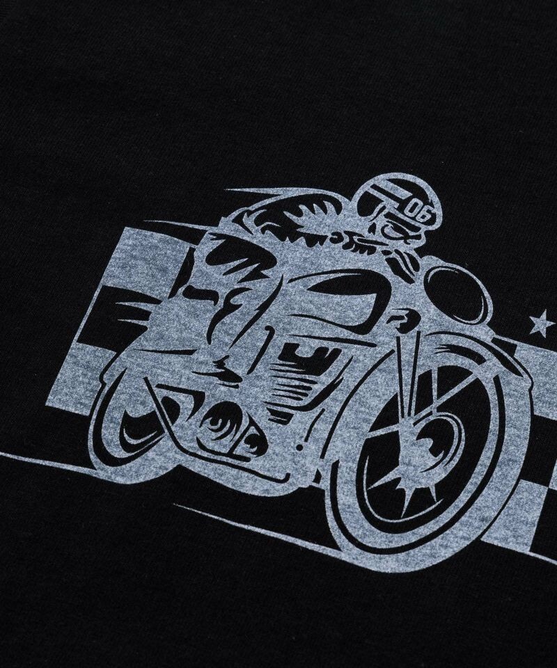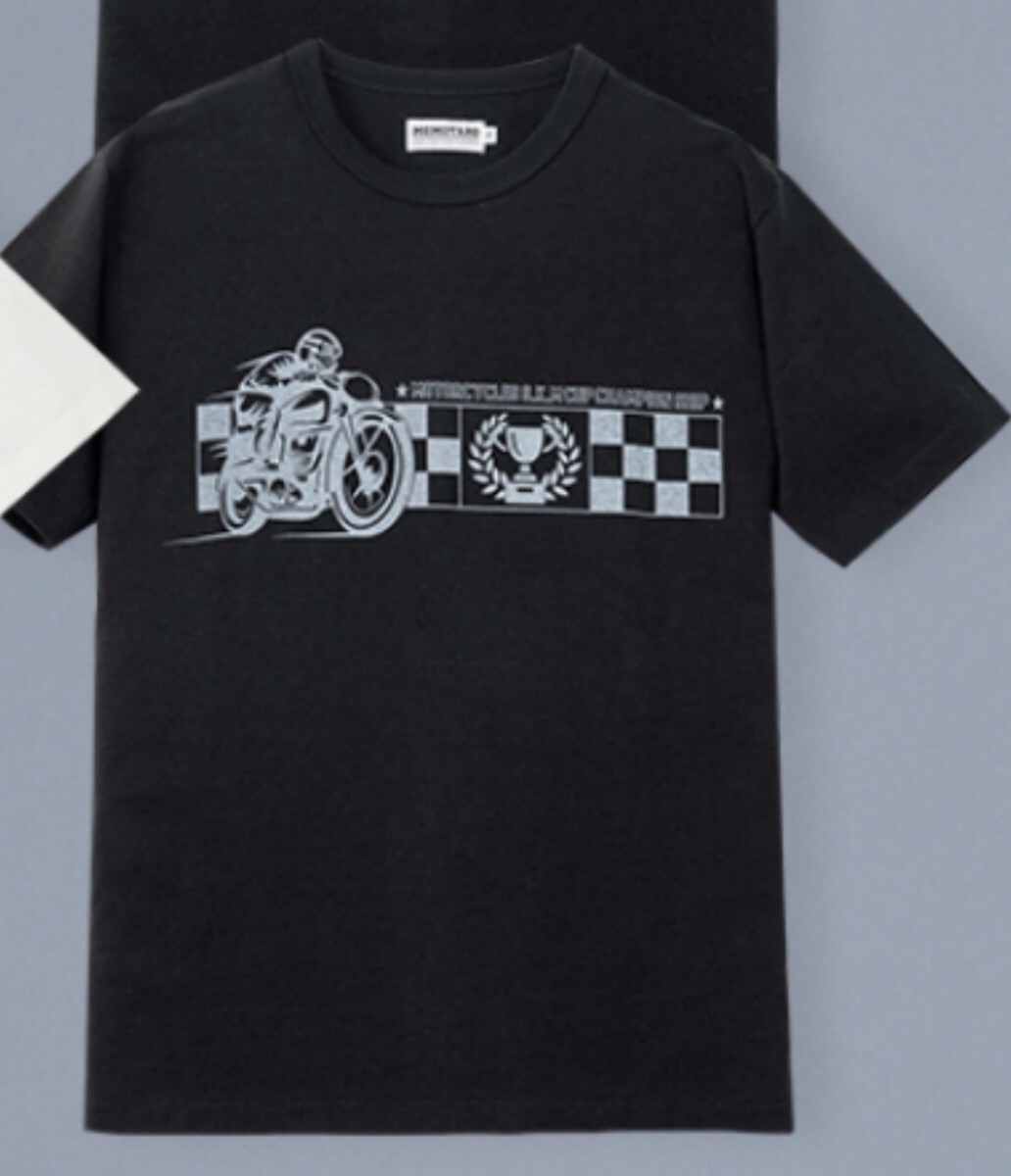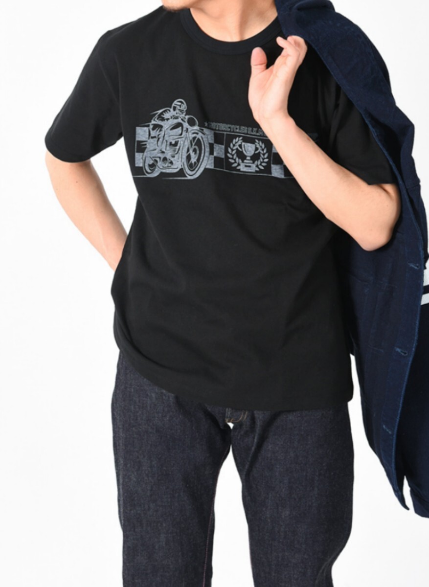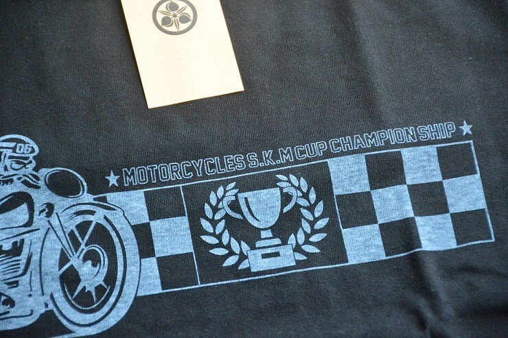 架空のモーターサイクル・チャンピオンシップ”SETOUCHI KOJIMA MOMOTARO CUP"をデザイン化。オイルの匂いと排気音、勝者が浴びる歓声が聞こえてくるようで胸が高鳴る。コーディネートに取り入れやすい、ホワイト×ブラックで展開。