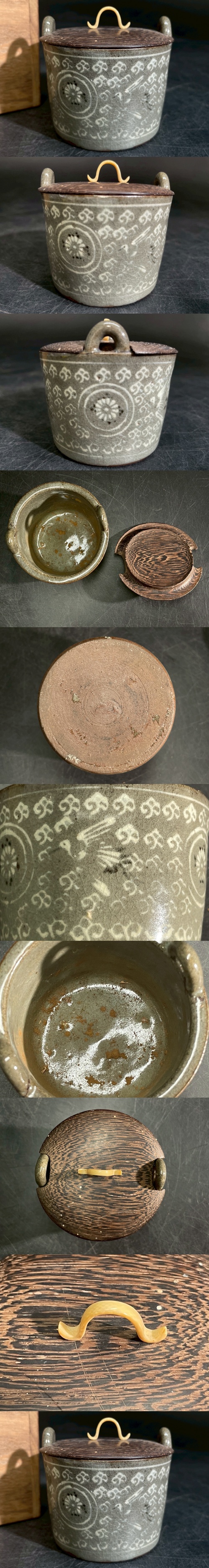 | 時代 高麗青磁 雲鶴文 白黒象嵌 香炉 木箱付 / 朝鮮古美術 李朝 高麗 青磁三島手 香道具 煎茶道具 .G1834 |