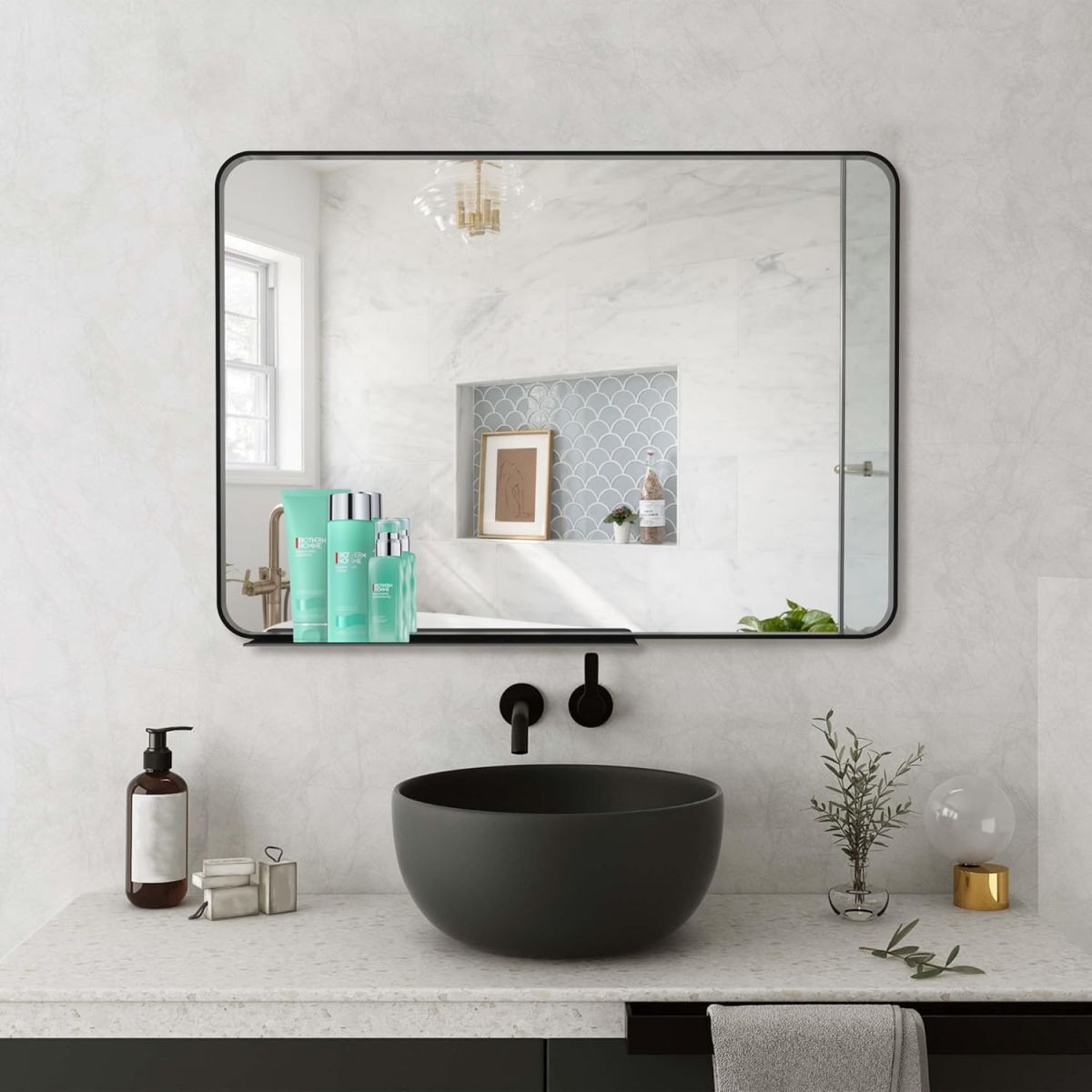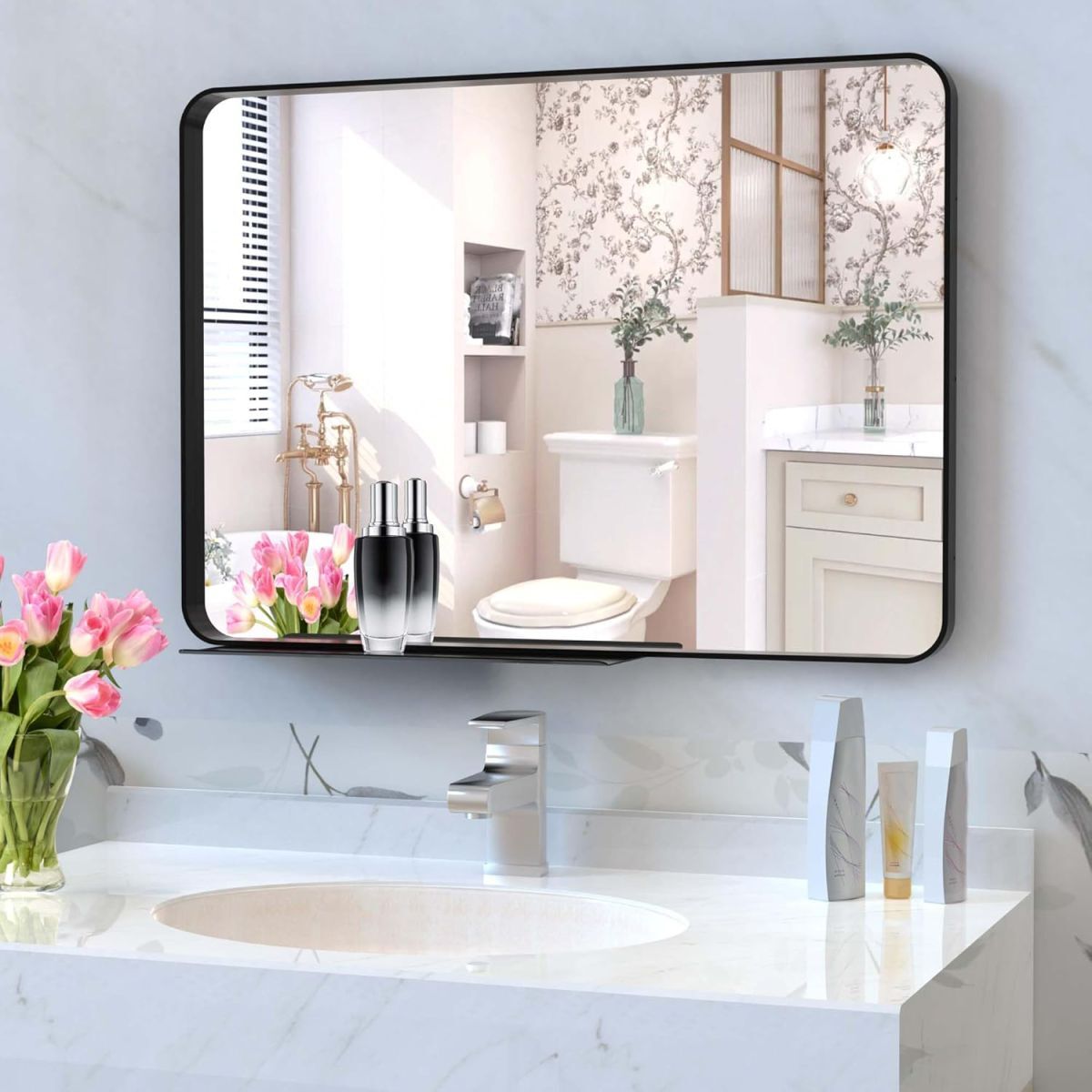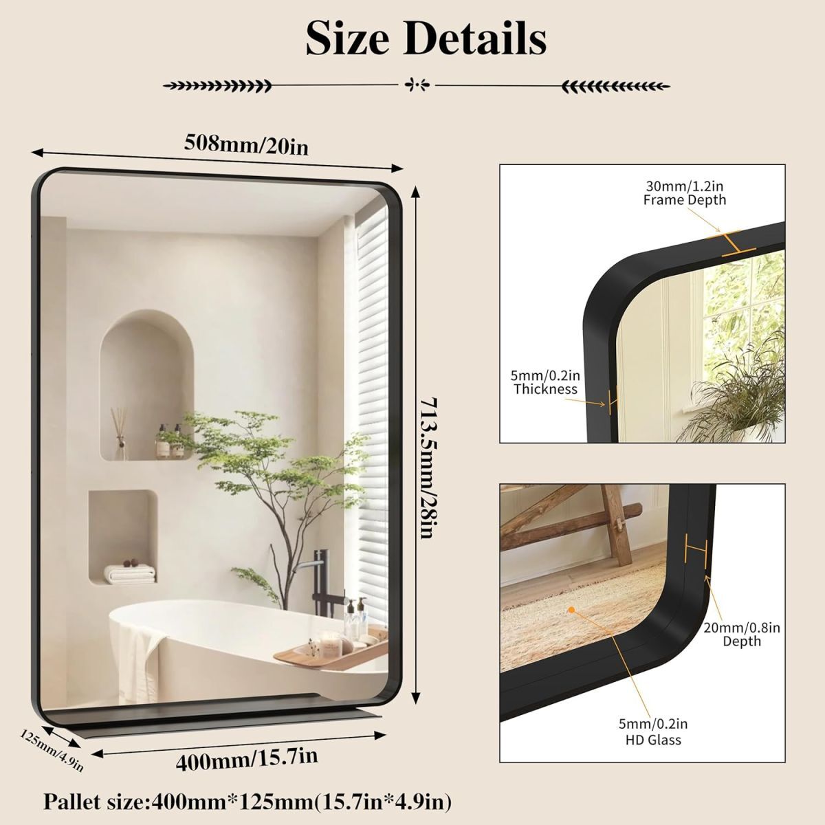 • 【実用・便利】金属部品の位置を変更することで、垂直または水平にサスペンションすることができます。底部の鏡面置物棚は、鍵、植物、洗面用品、アクセサリーなどの小物を置くのに理想的です。物置棚は取り外し可能です。