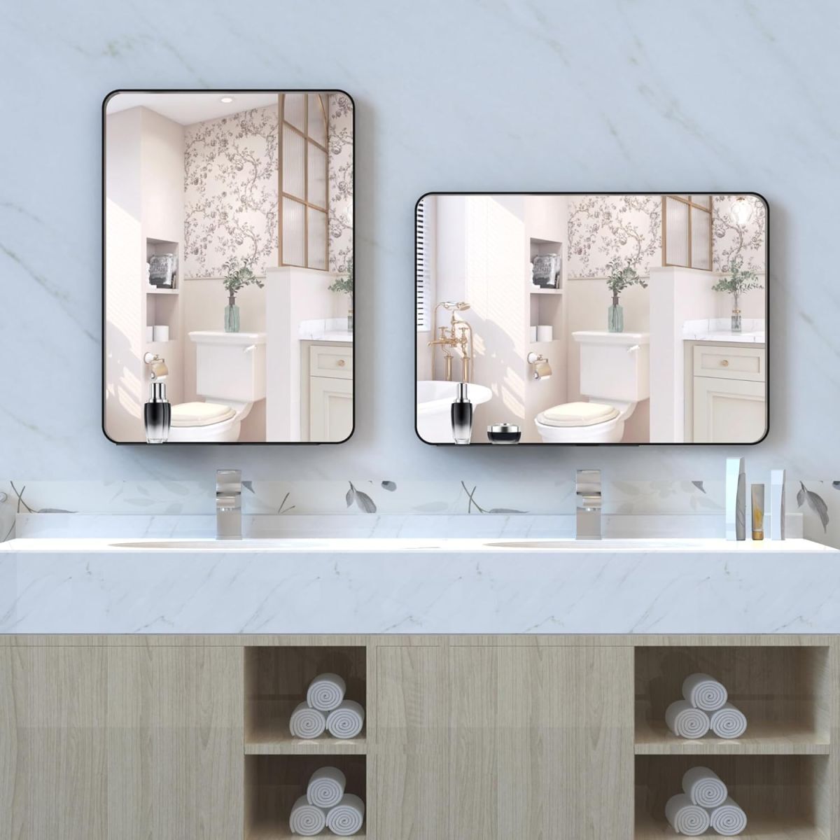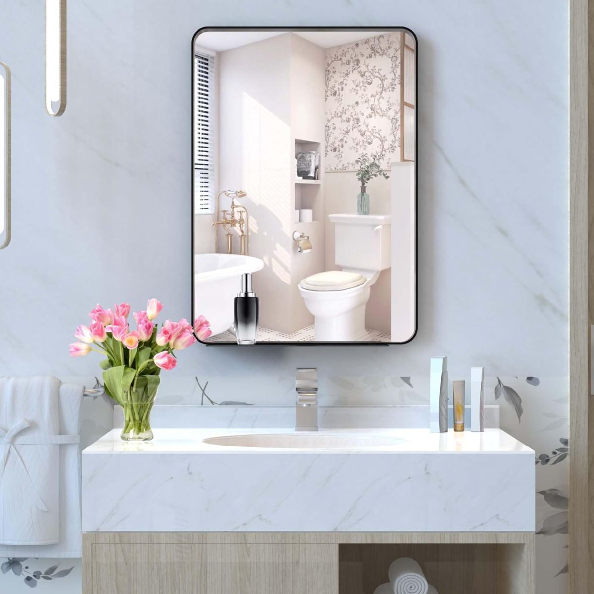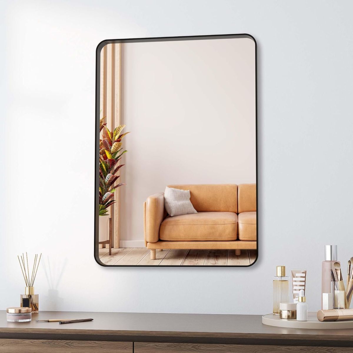 BEAUTME 鏡 壁掛けミラー 浴室鏡 バスルームミラー ウォールミラー長方形ミラー 浴室用化粧鏡 水平または垂直に吊るす おしゃれ 玄関 洗面 浴室 寝室 リビング,黒い,71.35x50.8cm