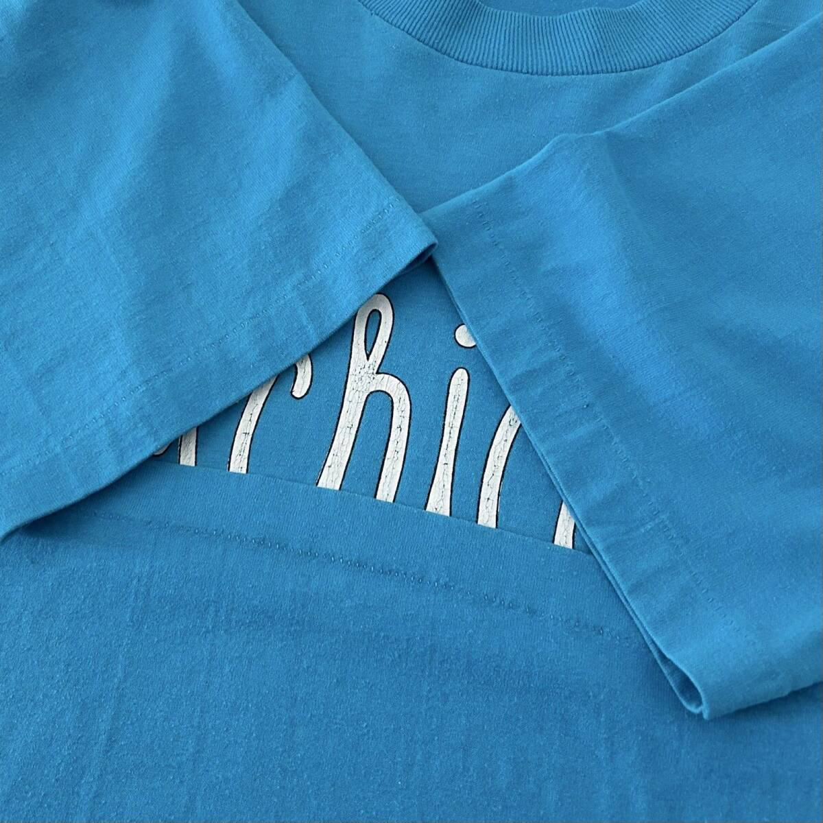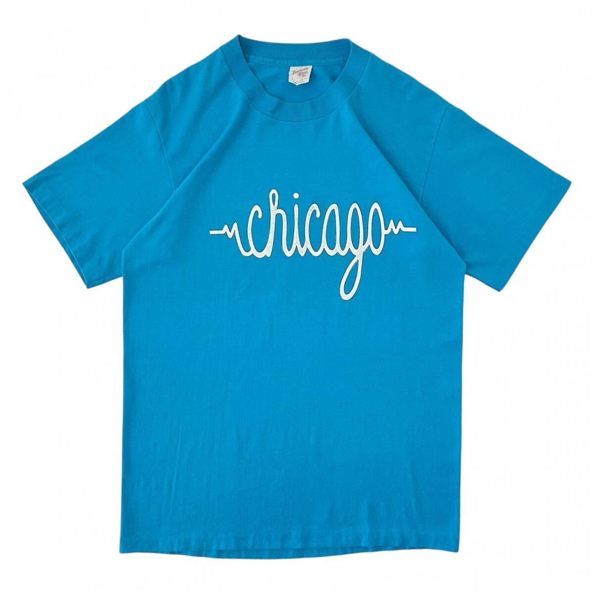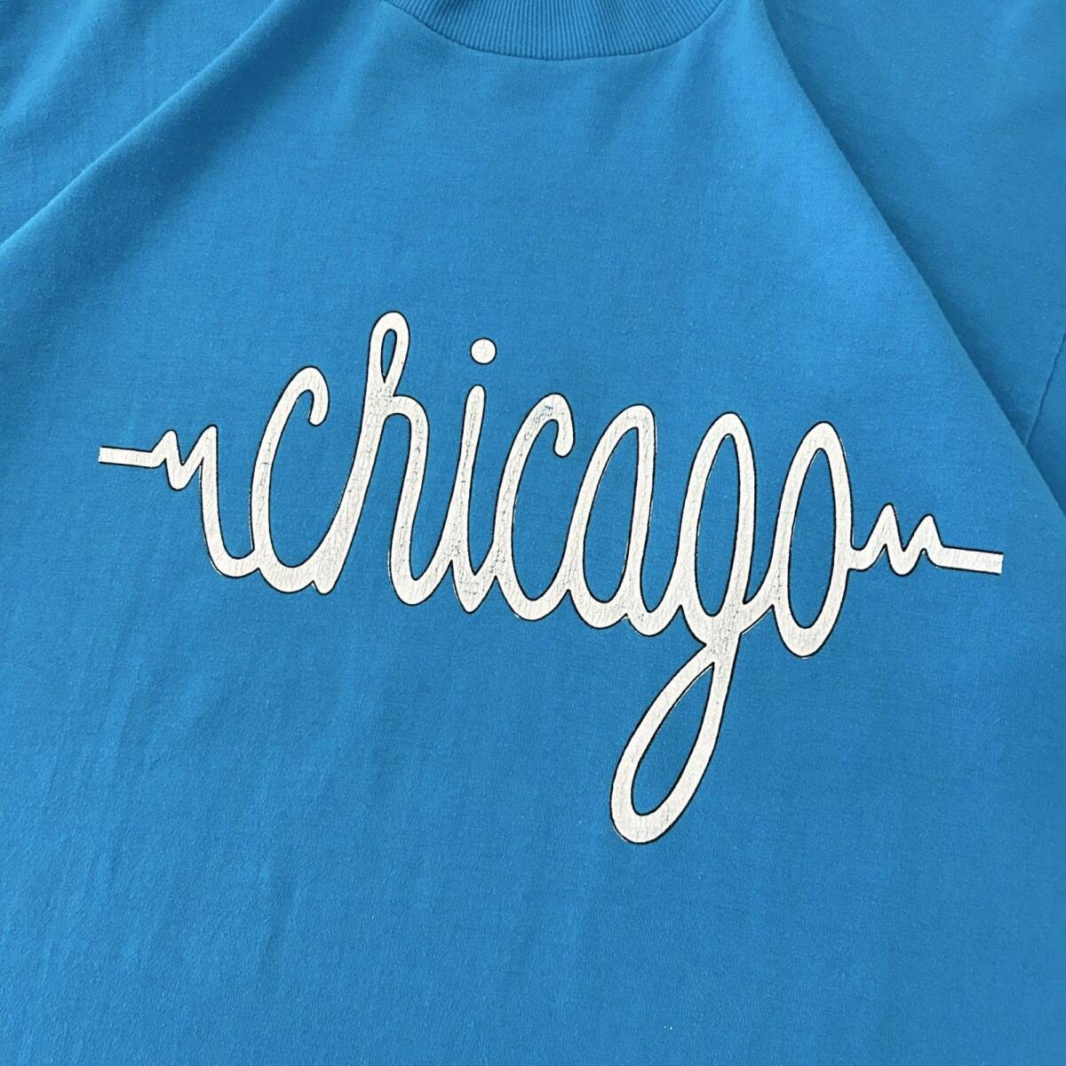 L 90s ヴィンテージ USA製 CHICAGO 心電図 ロゴ デザイン Tシャツ シングルステッチ コットンポリ 水色 白