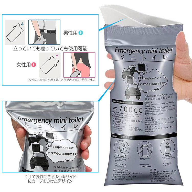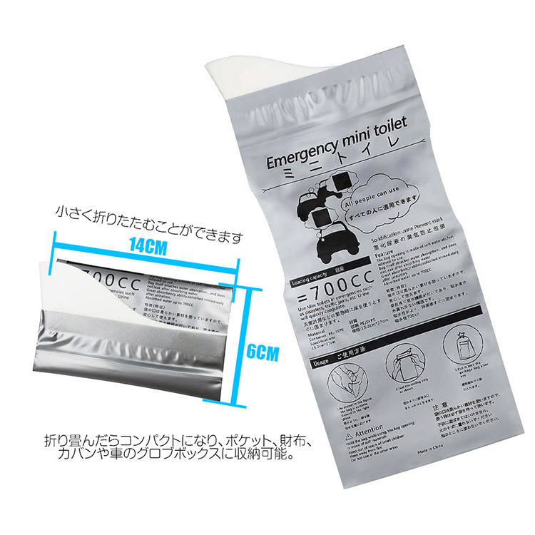 これは緊急時の使用を想定した一体型の使い捨ての尿袋です。折り畳み可能で薄型&携帯&収納便利な緊急トイレ。薄型で軽量なため、どんなバッグにも楽に収納でき、車のサイドポケットにもフィットします。