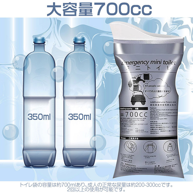 700cc大容量&男女兼用設計携帯トイレ、誰でも簡単に使用でる簡易トイレです。立っても座っても漏れなくて安心使用できます。手で持つ所はS方のデザインで、持ちやすくて落ないです。受け口の所、シーリングストリップがあり、逆にしても漏れません。