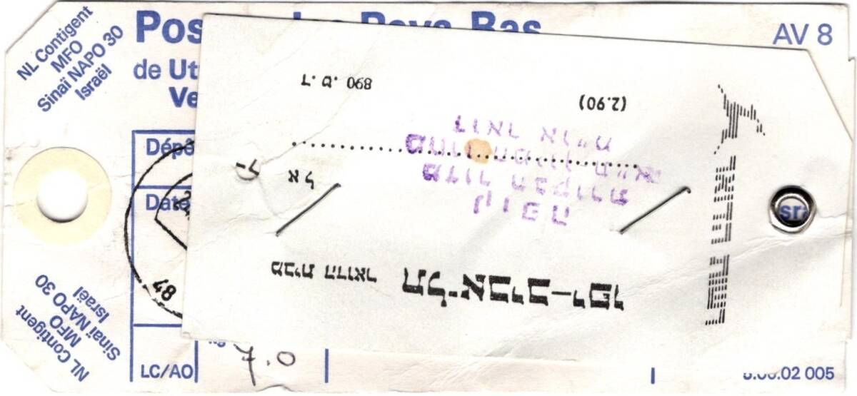 エジプトとイスラエルの停戦監視のためシナイ半島駐留多国籍軍監視団  の一員として派遣されたオランダ部隊の軍事郵便用の郵袋票札。