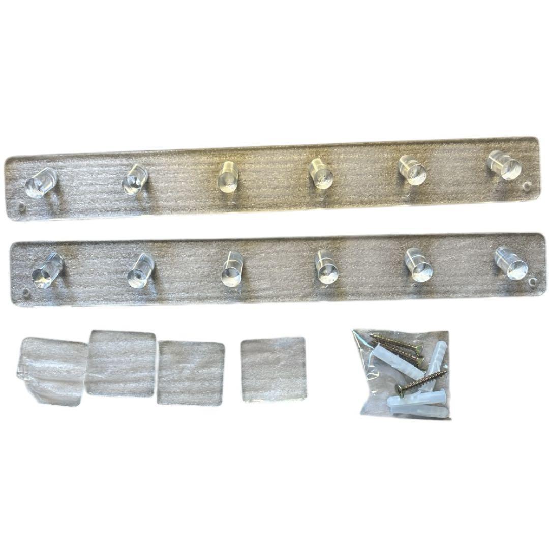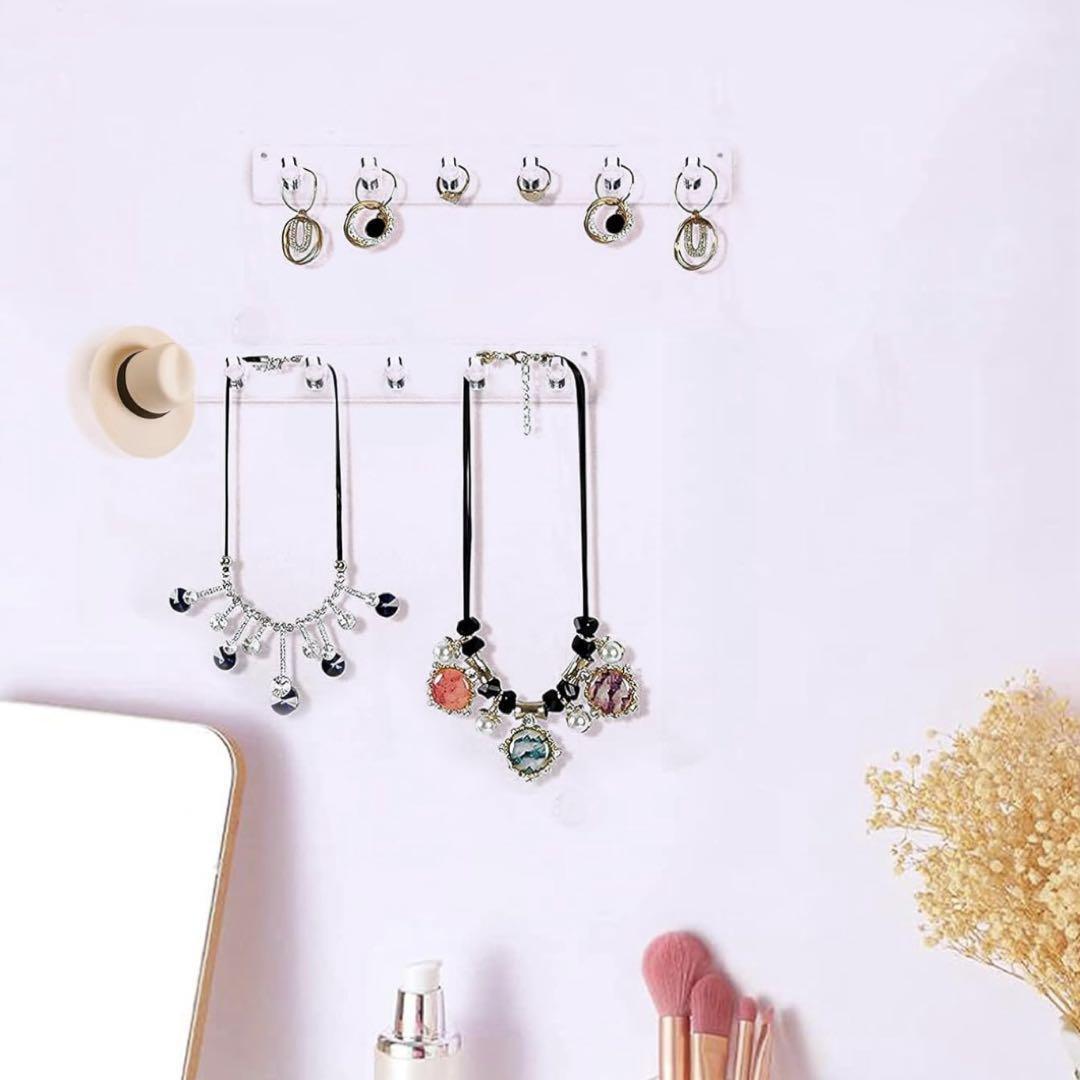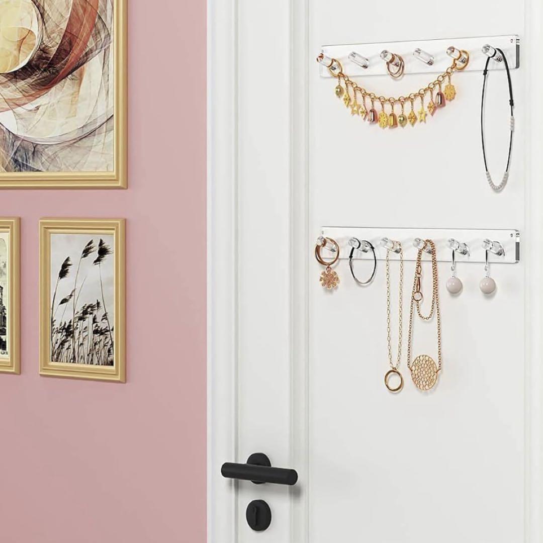 6つの壁けフックは2本あり、まとめて12個フックがあります。キーや小物など様々なものを吊ることができ、ネックレスなどジュエリーにも収納可能です。