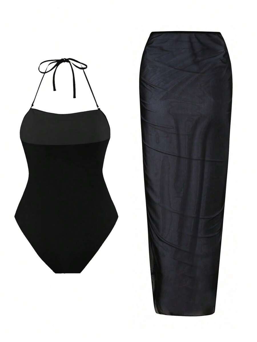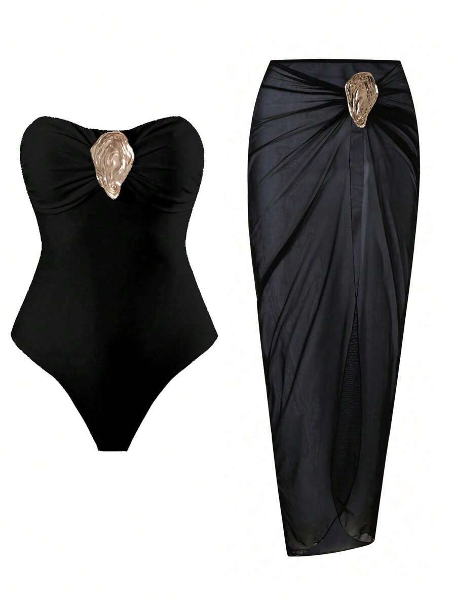 レディース 水着 ワンピース 女性用ビーチサマーアウトフィット:テクスチャーのある無地バンドゥ ワンピース水着 メタルアクセント、