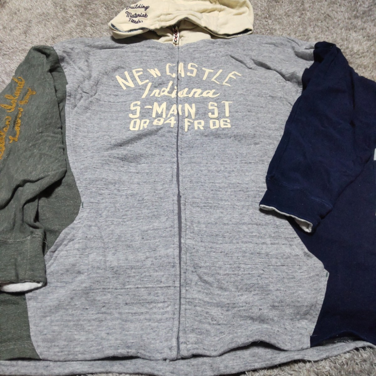 フルジッパーのフード付きパーカー、カジュアルなデザインで、グレー、ネイビー、グリーンの配色が特徴。