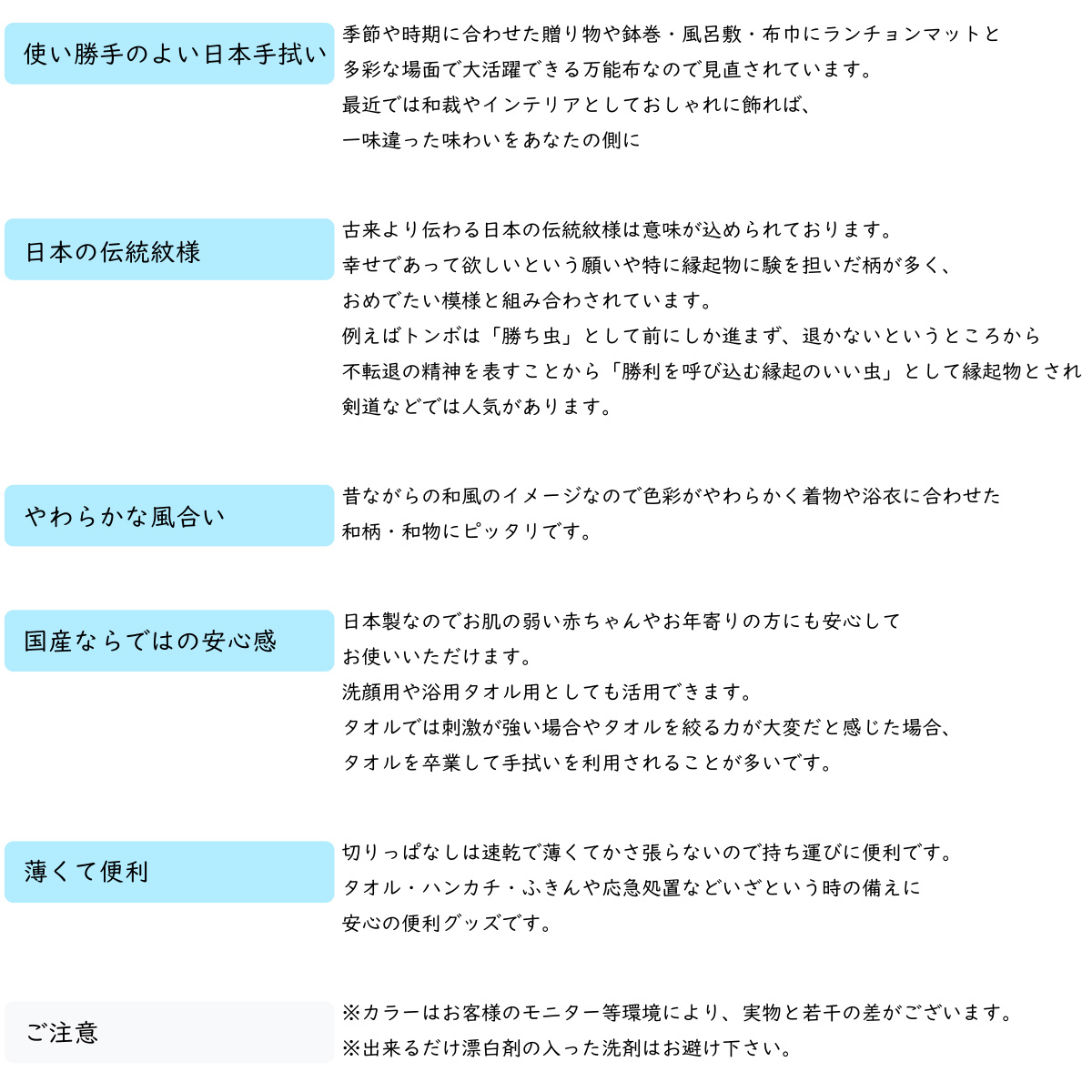 | 使い勝手のよい日本手拭い 季節や時期に合わせた贈り物や鉢巻・風呂敷・布巾にランチョンマットと多彩な場面で大活躍できる万能布なので見直されています。 和裁やインテリアとしておしゃれに飾れば、一味違った味わいをあなたの側に 古来より伝わる日本の伝統紋様は意味が込められております 幸せであって欲しいという願いや特に縁起物に験を担いだ柄が多く、おめでたい模様と組み合わされています。 例えばトンボは「勝ち虫」として前にしか進まず、退かないというところから不転退の精神を表すことから「勝利を呼び込む縁起のいい虫」として縁起物とされ、剣道などでは人気があります。 やわらかな風合い 昔ながらの和風のイメージなので色彩がやわらかく着物や浴衣に合わせた和柄・和物にピッタリです。 国産の安心 日本製なのでお肌の弱い赤ちゃんやお年寄りの方にも安心してお使いいただけます。 洗顔用や浴用タオル用としても活用できます。 タオルでは刺激が強い場合やタオルを絞る力が大変だと感じた場合、タオルを卒業して手拭いを利用されることが多いです。 薄くて便利 切りっぱなしは速乾で薄くてかさ張らないので持ち運びに便利です。 タオル・ハンカチ・ふきんや応急処置などいざという時の備えに安心の便利グッズです。 |