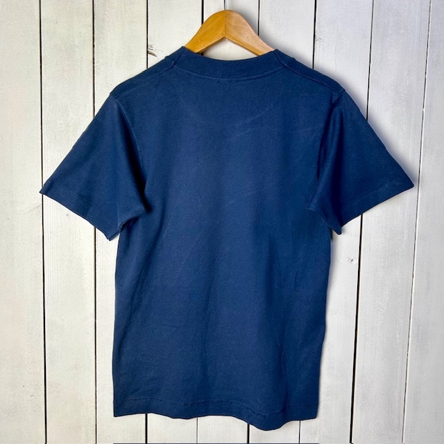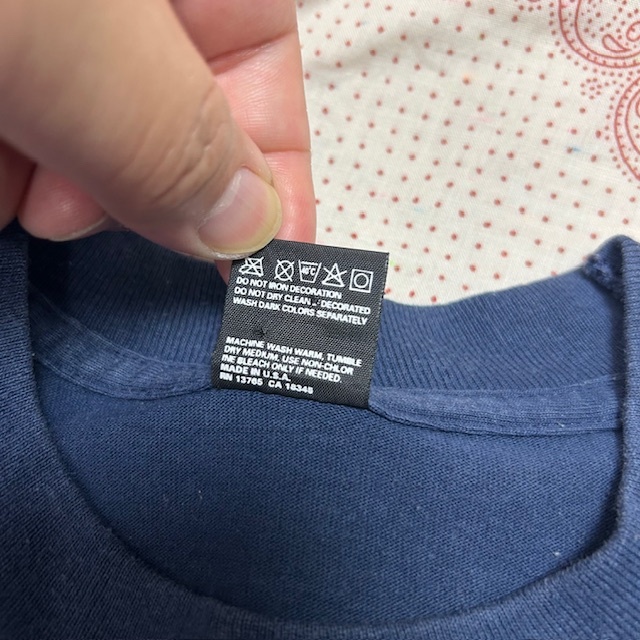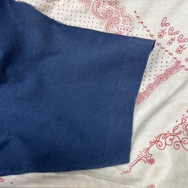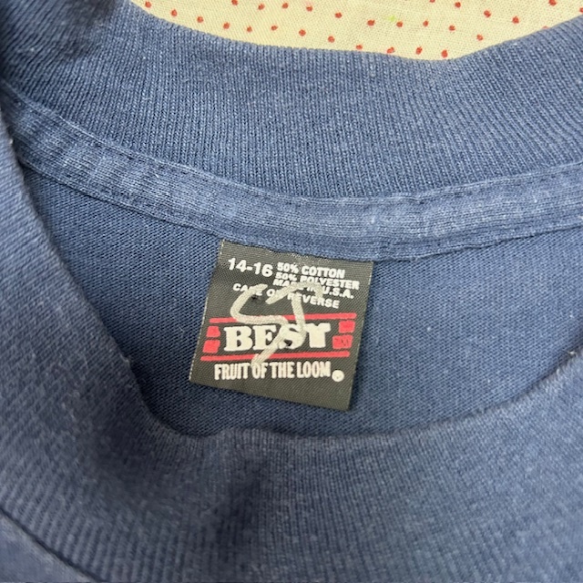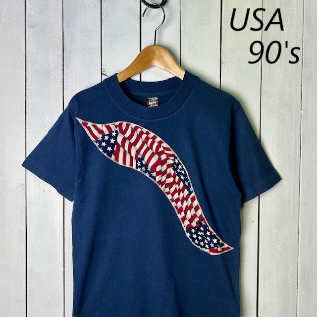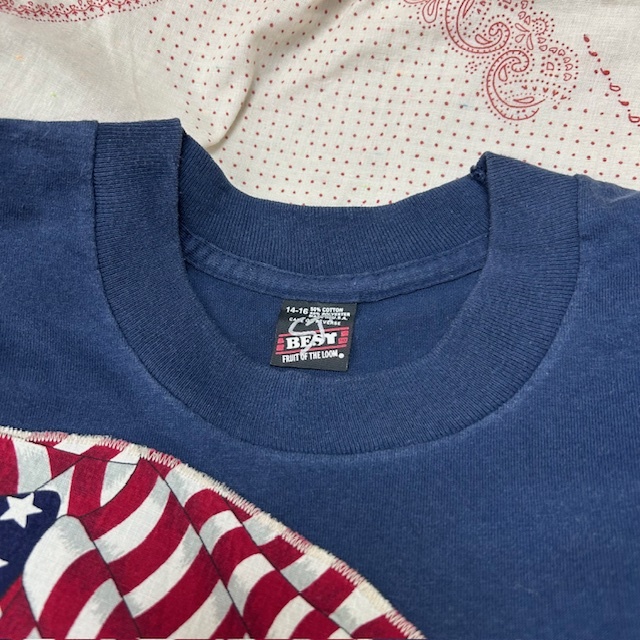●商品説明・・・アメリカ古着になります。90年代前半頃のオールド・ヴィンテージのアメリカ国旗のバンダナを独特な形にパッチワークしてあるTシャツです。ボディーは、FRUIT OF THE LOOMのBESTで、made in USA (アメリカ製)で、素材はコットン・ポリの50/50で、色は紺(ネイビー)です。袖・裾共にシングルステッチです。youth 14-16表記で、レディースのXS~S程度の方(またはM程度の方がチビT感覚で着る方)向けのサイズ感かと思います。