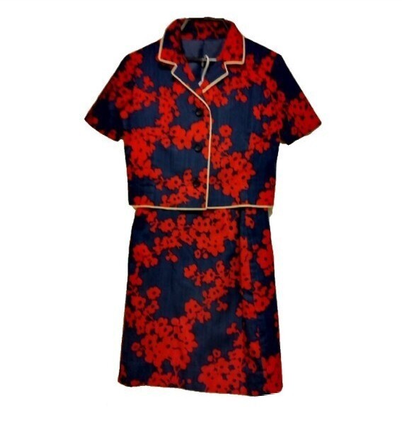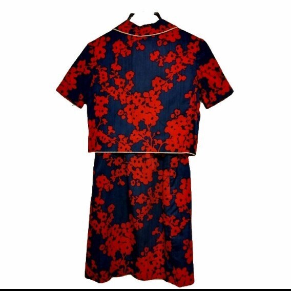 ネイビーにレッドが映えるボタニカル柄が華やかな生地です。