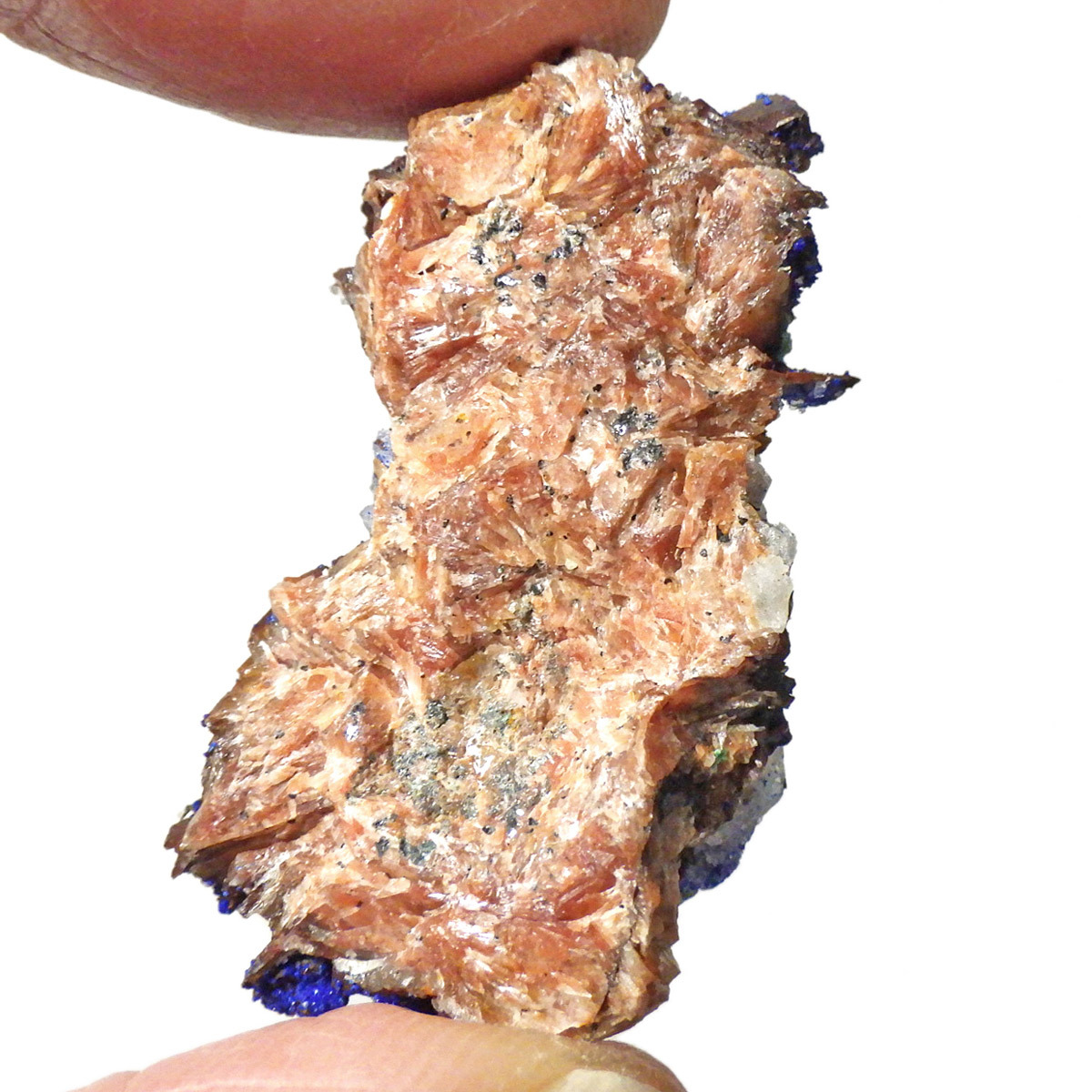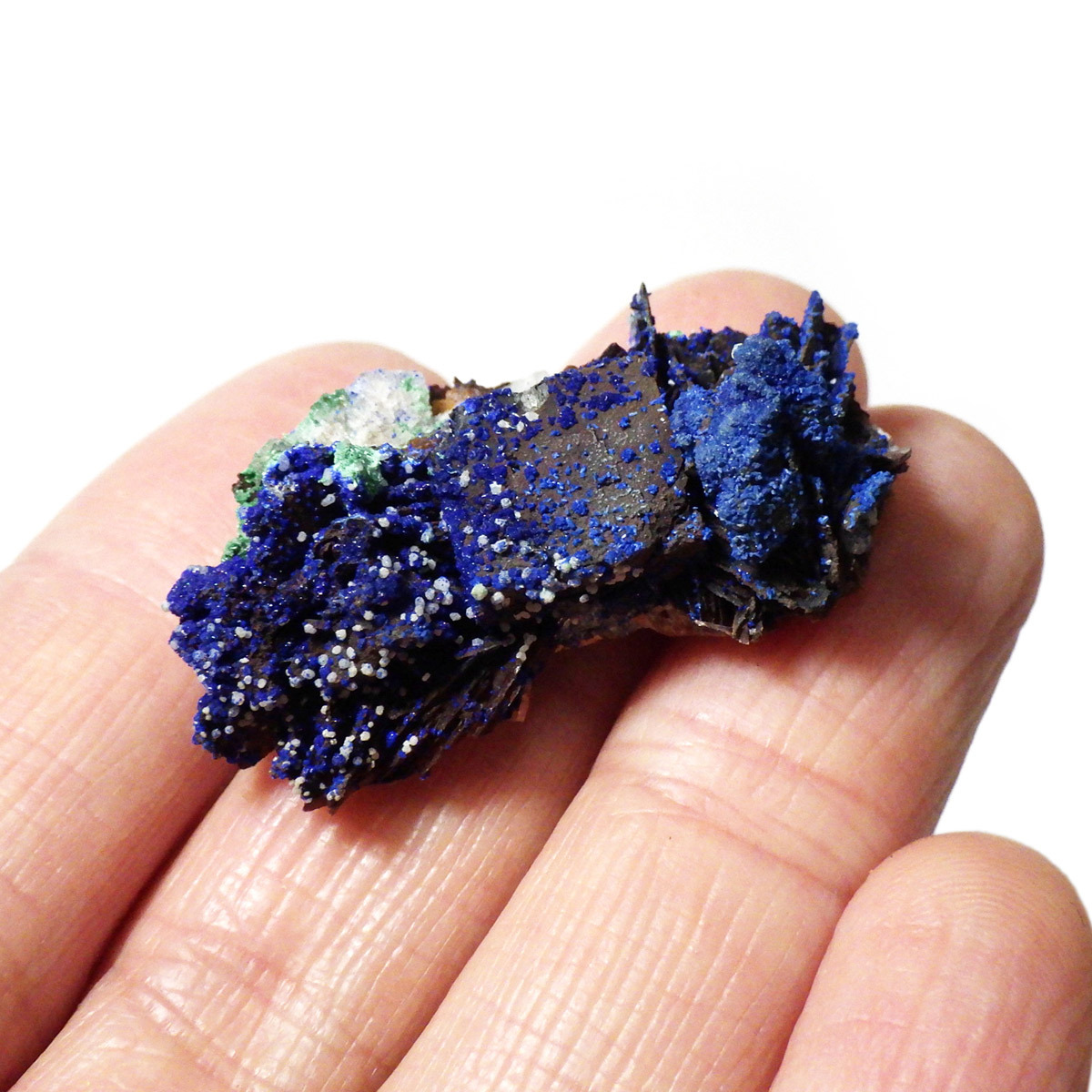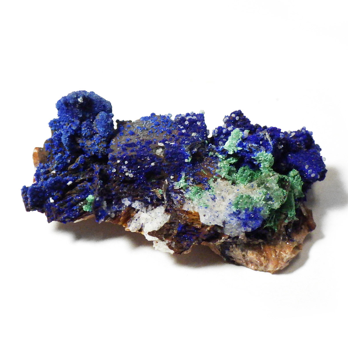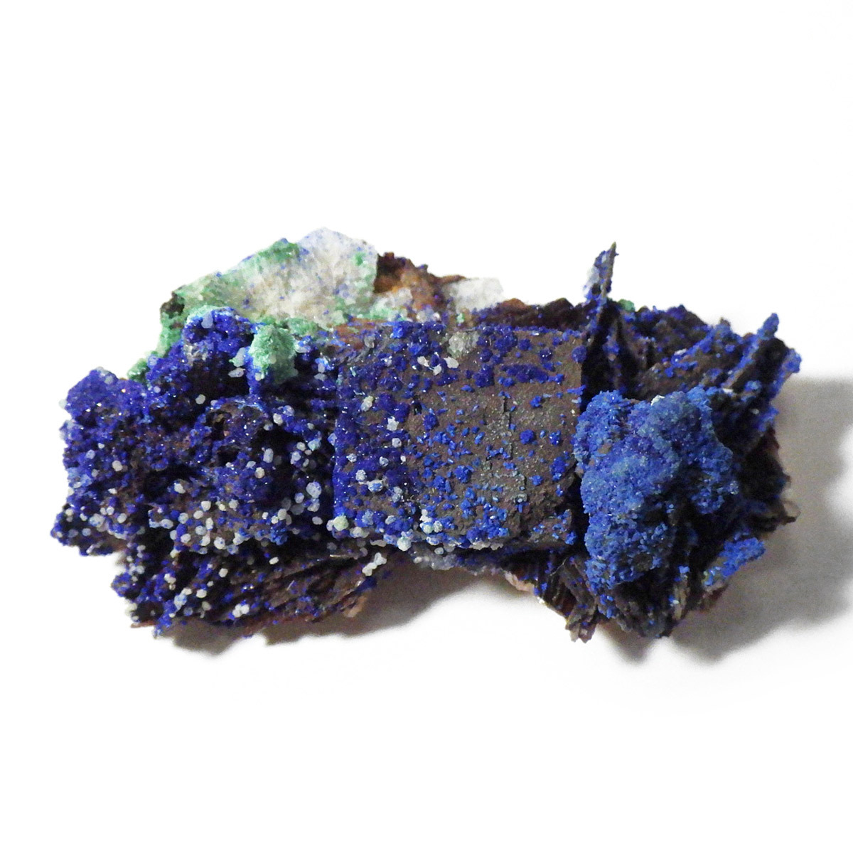 モロッコ産のアズライト結晶原石です。アズライトは産出量が少なく、鉱物コレクターの間でも非常に人気の高い希少石。中でもモロッコ産は、深く濃いブルーと美しい結晶構造を持つことで知られ、その美しさは世界トップクラスと評されています。バライト上にアズライトが結晶化されており、一部、鮮やかなグリーンのマラカイトとの共生も見られます。見る角度によってキラキラと表情を変える群青色の輝きは、まさに自然が生み出した芸術品です。