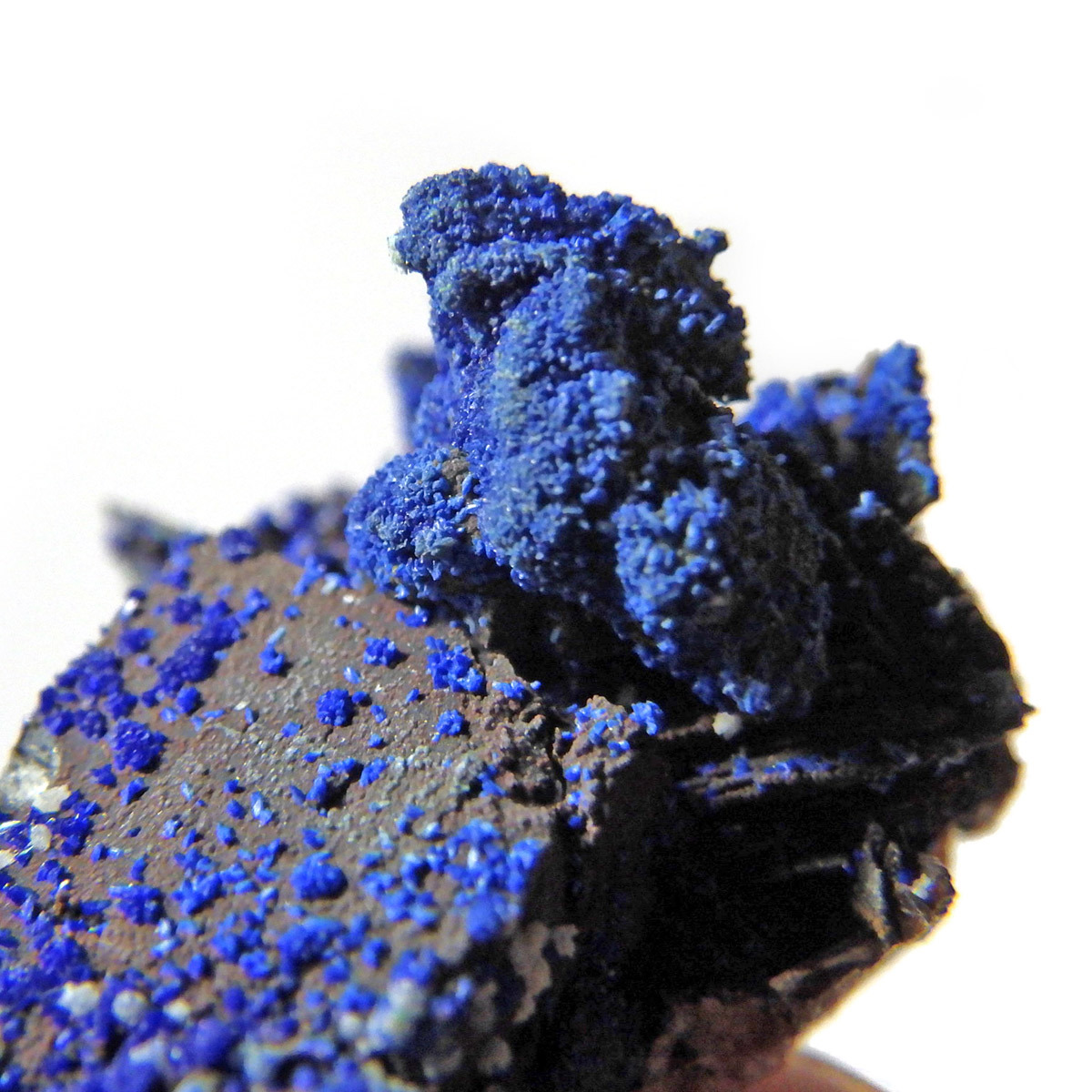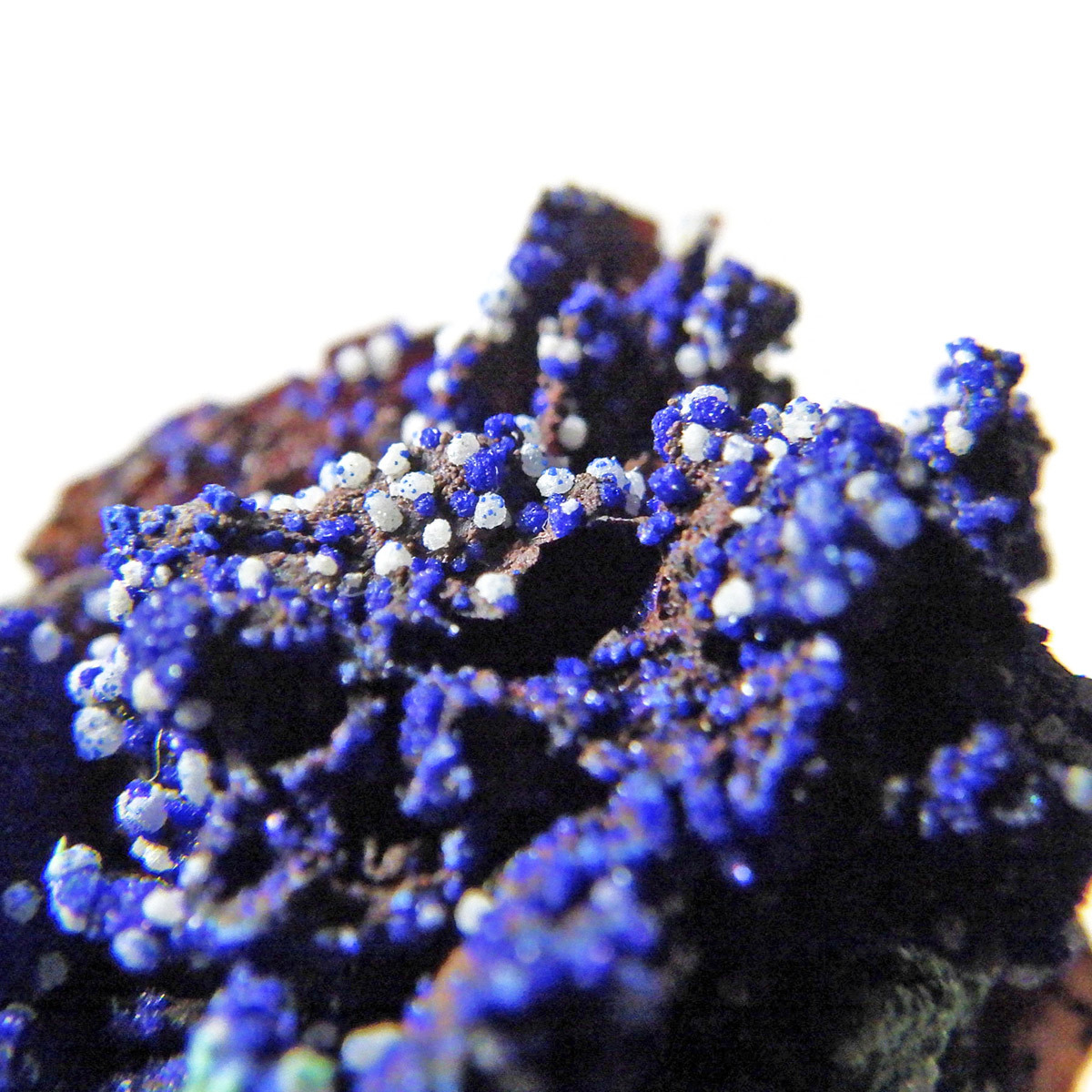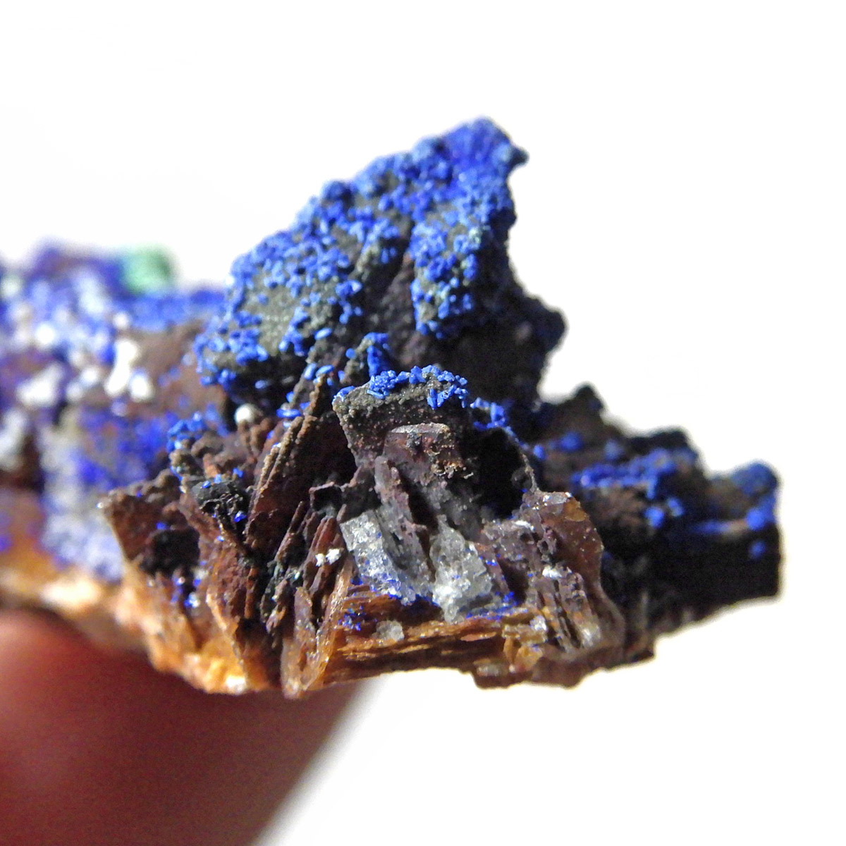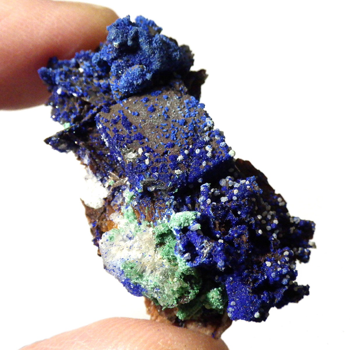 モロッコ産のアズライト結晶原石です。アズライトは産出量が少なく、鉱物コレクターの間でも非常に人気の高い希少石。中でもモロッコ産は、深く濃いブルーと美しい結晶構造を持つことで知られ、その美しさは世界トップクラスと評されています。バライト上にアズライトが結晶化されており、一部、鮮やかなグリーンのマラカイトとの共生も見られます。見る角度によってキラキラと表情を変える群青色の輝きは、まさに自然が生み出した芸術品です。