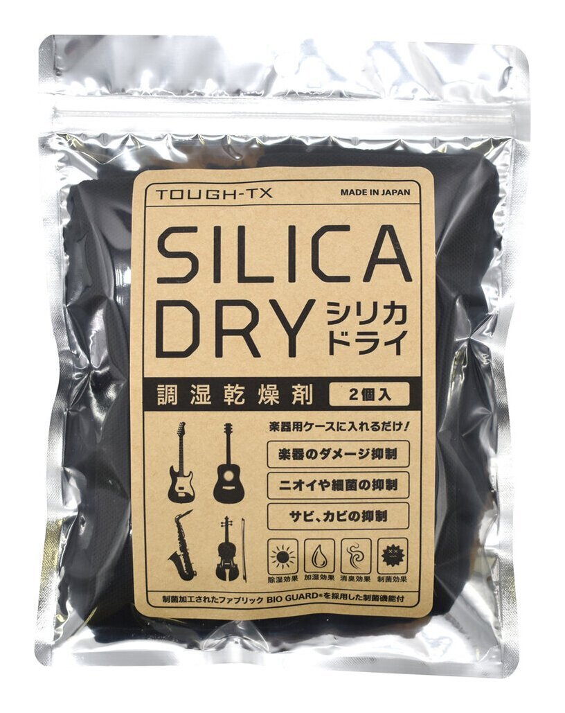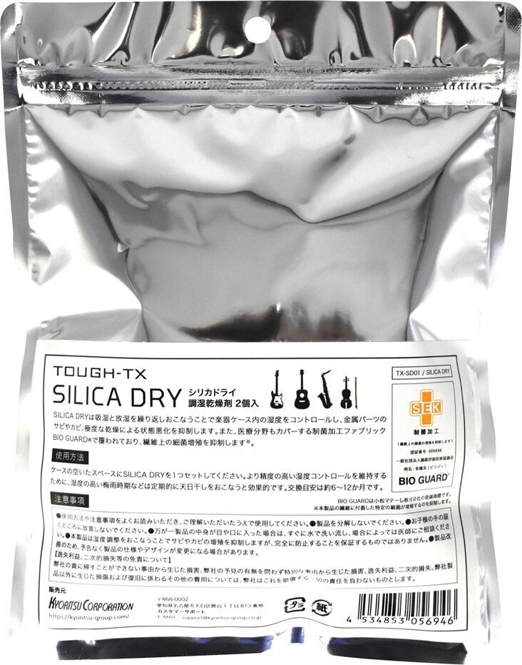 SILICA DRYは吸湿と放湿を繰り返しおこなうことで楽器ケース内の湿度をコントロールし、金属パーツのサビやカビ、極度な乾燥による状態悪化を抑制します。また、医療分野もカバーするハイレベルな制菌加工ファブリックBIO GUARD(R)で覆われており、ニオイの原因菌や人体に有害なさまざまな細菌の増殖も抑制します。 ・BIO GUARD(R)は小松マテーレ株式会社の登録商標です。 ※本製品の繊維に付着した特定の細菌が増殖するのを抑制します。 使用方法 ケースの空いたスペースにSILICA DRYを1つセットしてください。より精度の高い湿度コントロールを維持するために、湿度の高い梅雨時期などは定期的に天日干しをおこなうと効果的です。 交換目安は約6~12か月です。 ・約60gx2個入り ・バッケージ込重量:約145g ・日本製 注意事項 ・使用方法や注意事項をよくお読みいただき、ご理解いただいたうえで使用してください。 ・製品を分解しないでください。 ・お子様の手の届くところに放置しないでください。 ・万が一製品の中身が目やロに入った場合は、すぐに水で洗い流し、場合によっては医師にご相談ください。 ・本製品は湿度調整をおこなうことでサビやカビの増殖を抑制しますが、完全に防止することを保証するものではありません。 ・製品改善のため、予告なく製品の仕様やデザインが変更になる場合があります。 【逸失利益、ニ次的損失等の免責について】 弊社の責に帰すことができない事由から生じた損害、弊社の予見の有無を問わず特別な事由から生じた損害、逸失利益、ニ次的損失、弊社製品以外に生じた損傷および復旧に係わるその他の費用については、弊社はこれを賠償する一切の責任を負わないものとします。 |