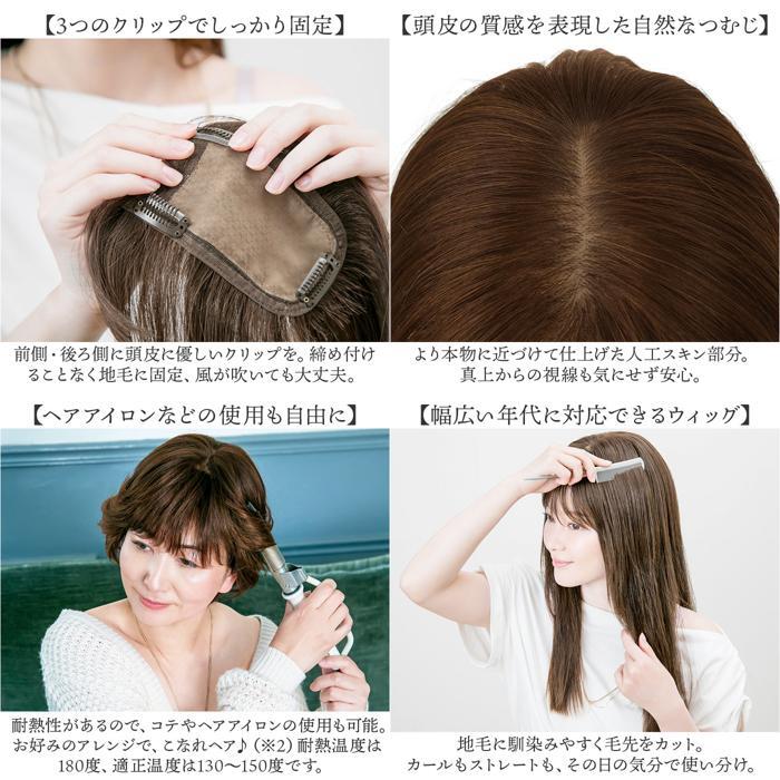 商品説明 | ・・【気になる白髪を手軽にカバー】 ・伸びかけの白髪や頭頂部を隠せる◎「プリシラ白髪かくしウィッグ 人毛100% ショート」。 ・【地毛に馴染むナチュラルな仕上がり】 ・人毛100%で、地毛に溶け込むような自然な見た目。手触りも良く、敏感肌の方も安心。 ・(※1)人毛特有のクセがついている場合があるため、パッケージから出したらクセを直して使用してください。 ・【広範囲を覆えてボリュームアップ】 ・気になるつむじや分け目を、広範囲にカバーできるウィッグ。自然なボリュームアップも叶う◎ ・【部分手植えでふんわり自然な前髪】 ・前髪部分は1本1本手植え。毛の立ち上がりが良く、ふんわりと自然な風合いに。 ・【着けていることを忘れる軽やかさ】 ・ウィッグ自体が軽量で、長時間着けていてもストレスフリー。デイリーに活躍。 ・【3つのクリップでしっかり固定】 ・前側・後ろ側に頭皮に優しいクリップを。締め付けることなく地毛に固定、風が吹いても大丈夫。 ・【頭皮の質感を表現した自然なつむじ】 ・より本物に近づけて仕上げた人工スキン部分。真上からの視線も気にせず安心。 ・【ヘアアイロンなどの使用も自由に】 ・耐熱性があるので、コテやヘアアイロンの使用も可能。お好みのアレンジで、こなれヘア♪ ・(※2)耐熱温度は180度、適正温度は130~150度です。 ・【幅広い年代に対応できるウィッグ】 ・地毛に馴染みやすく毛先をカット。カールもストレートも、その日の気分で使い分け。 ・【自宅でお手入れできて衛生的】 ・絡みや汚れが気になったら手洗いできるから、いつも清潔をキープ。 ・【ウィッグ初心者さんでも安心】 ・着用ポイントやお手入れ方法が書かれた説明書付き。 |