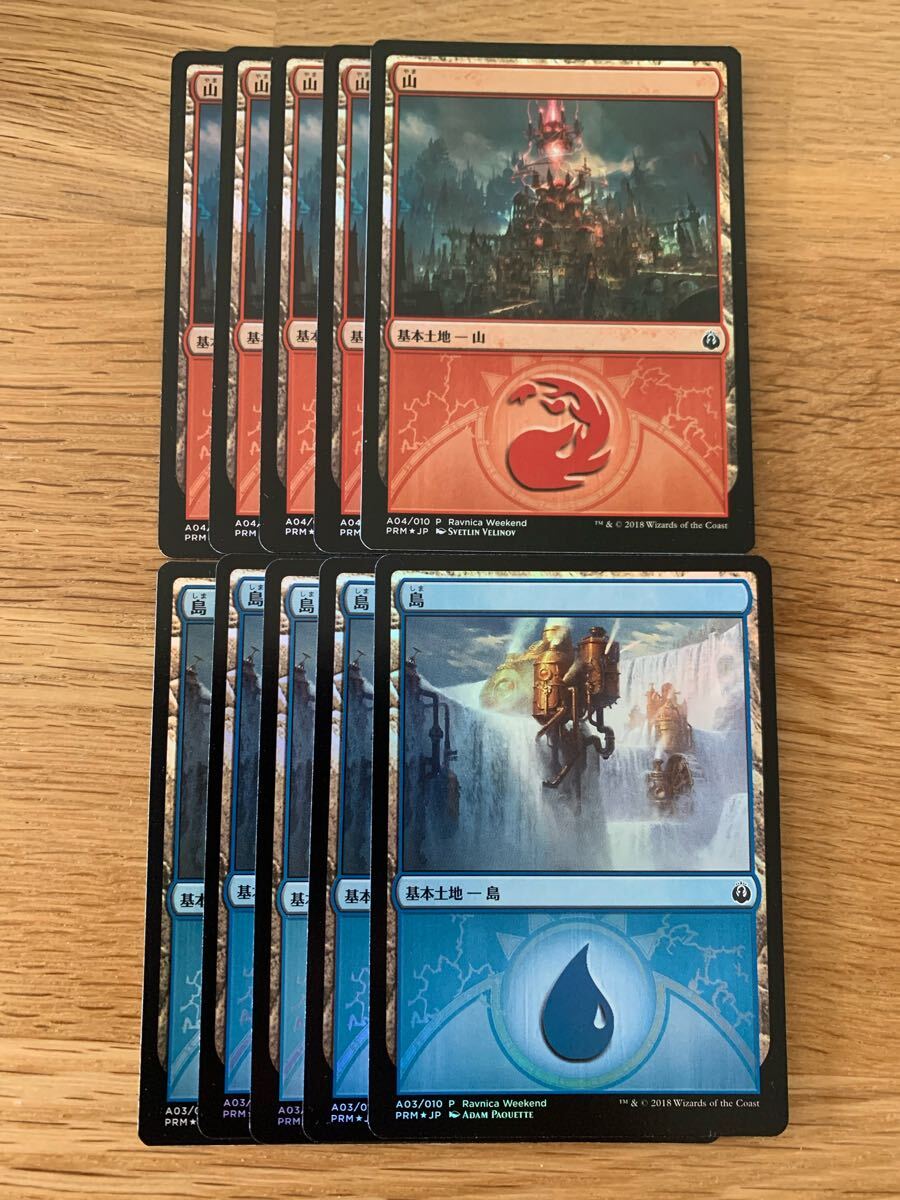 MTG ラヴニカウィークエンドRavnica Weekend 《島/Island》日本語プロモfoil版 5枚+《山/Mountain》日本語プロモfoil版 5枚セットになります。