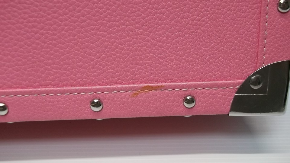 画像9枚目  ピンクのケース表面2ヵ所、接着剤はみ出しの様な汚れが有ります。