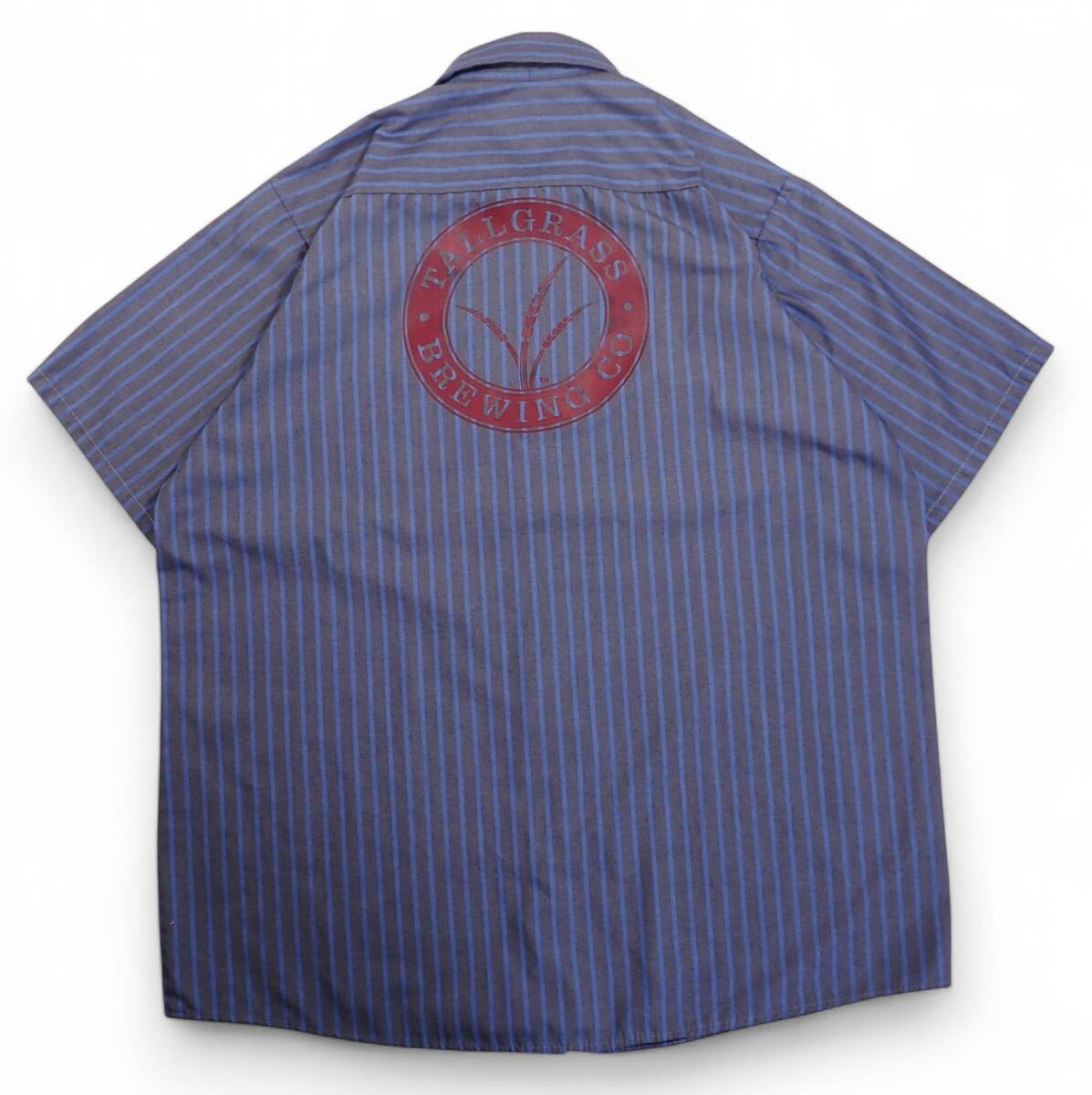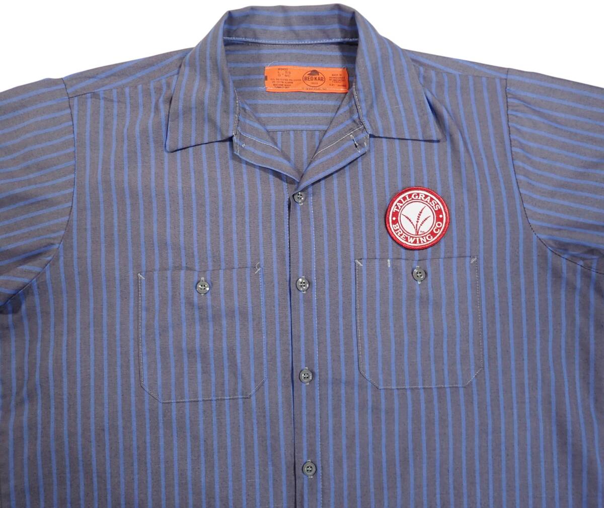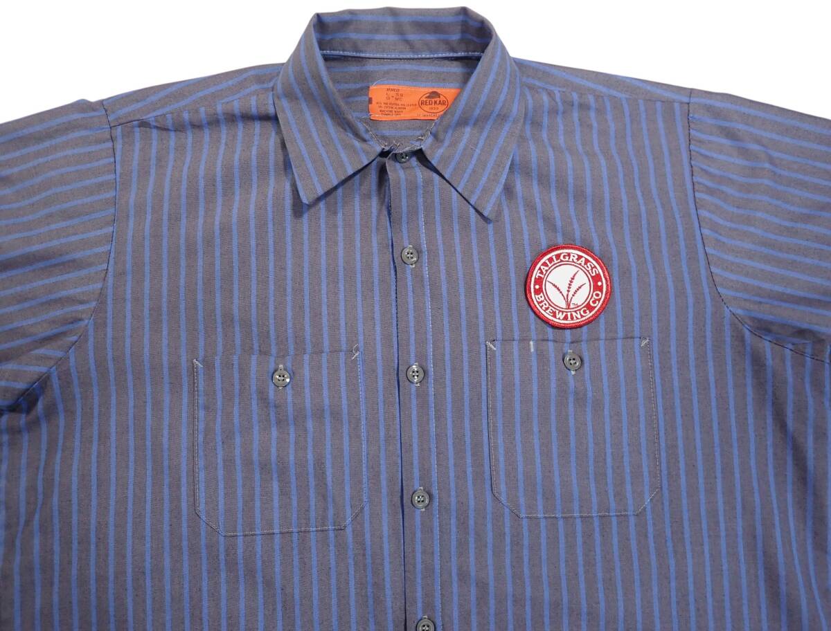 備考 RED KAPのやや薄手の素材にアメリカ合衆国、カンザス州マンハッタンで設立されたTALLGRASS BREWINGカンパニーのフロントにワッペン、バックにプリント入りの人気のストライプ半袖ワークシャツです。クリーニング、プレス済。
