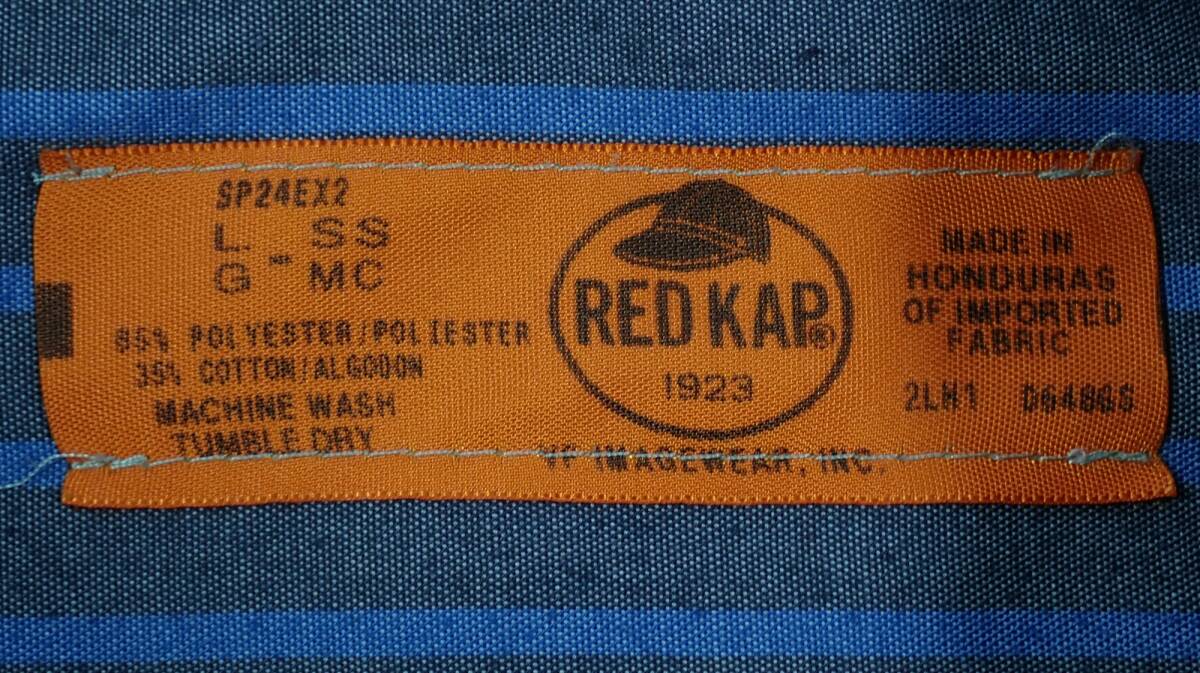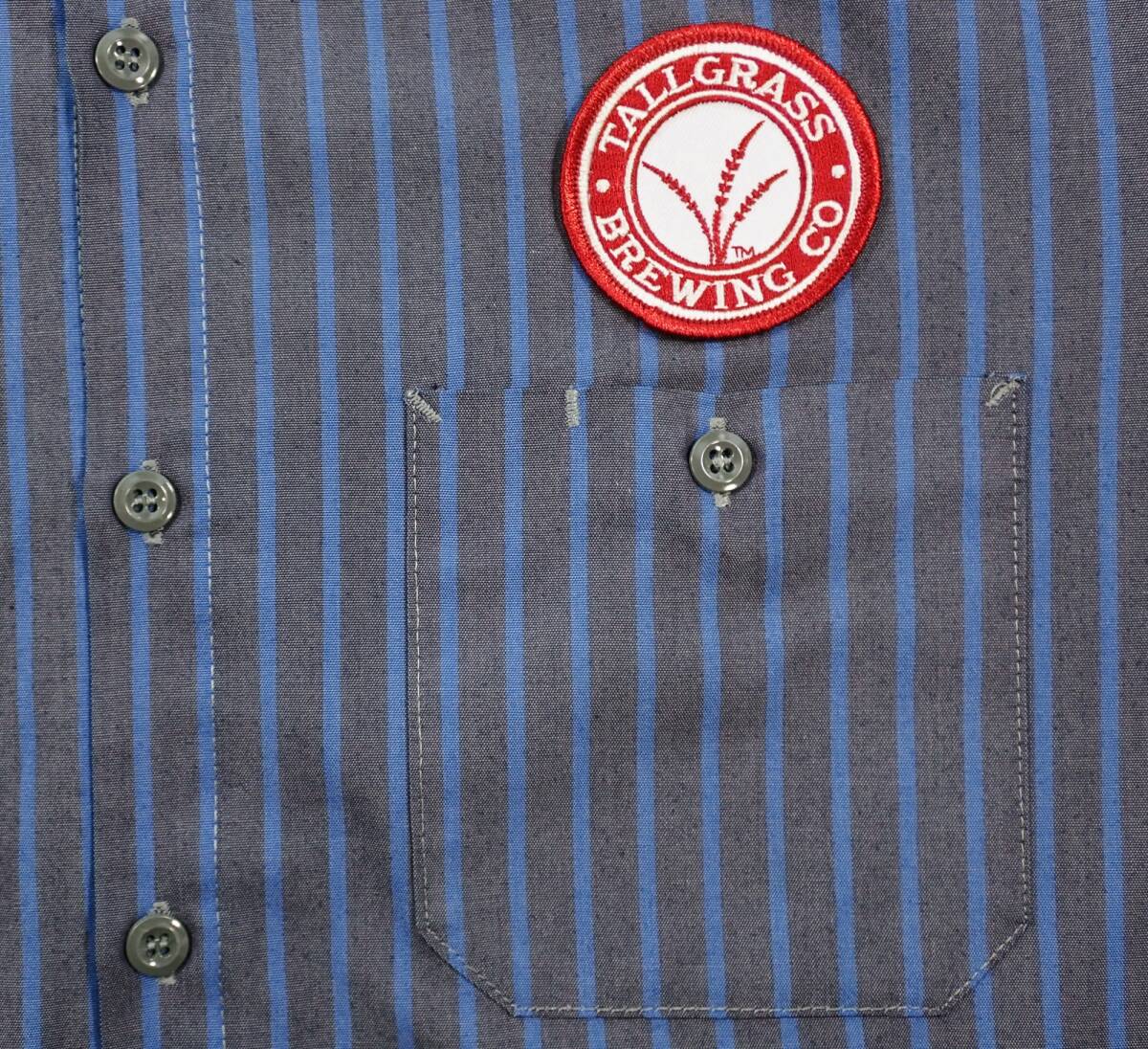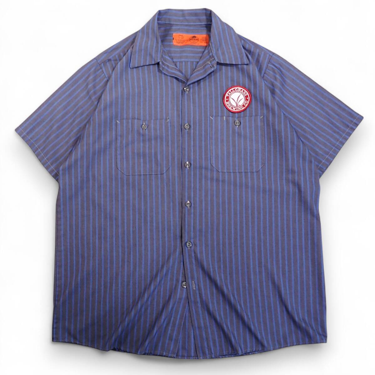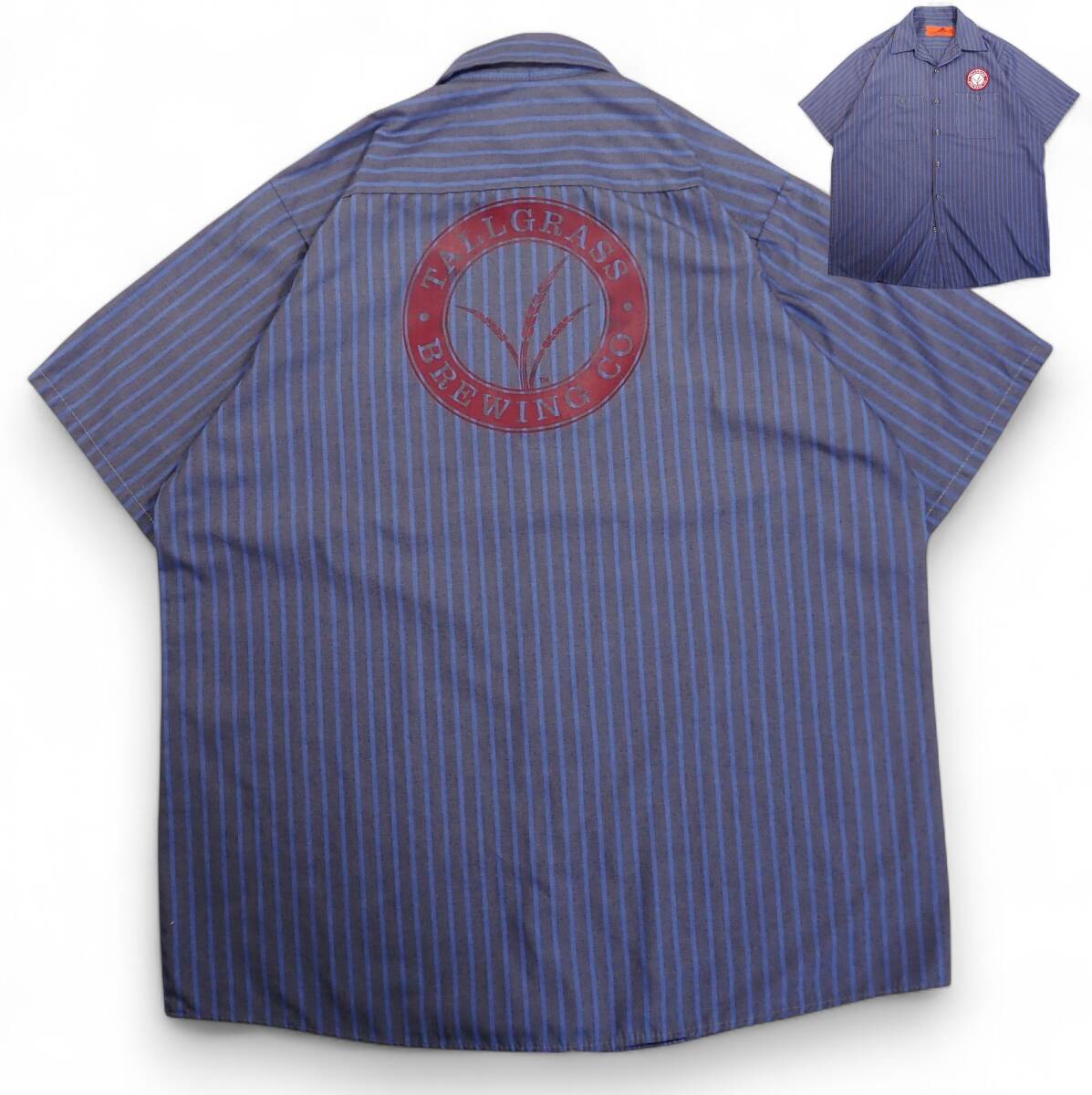 備考 RED KAPのやや薄手の素材にアメリカ合衆国、カンザス州マンハッタンで設立されたTALLGRASS BREWINGカンパニーのフロントにワッペン、バックにプリント入りの人気のストライプ半袖ワークシャツです。クリーニング、プレス済。