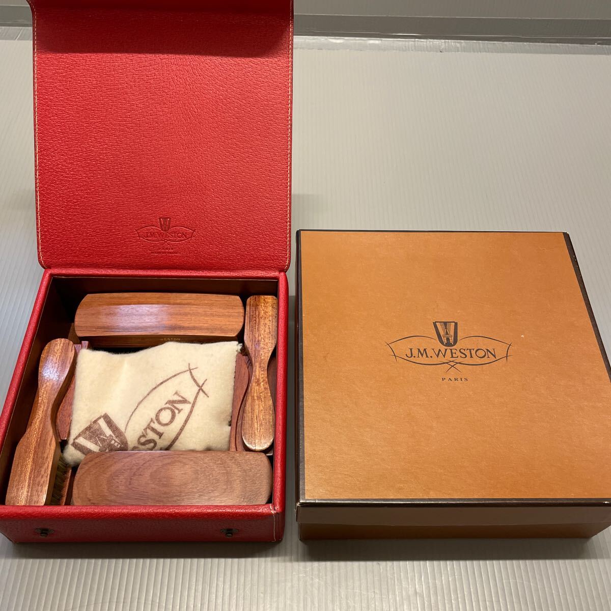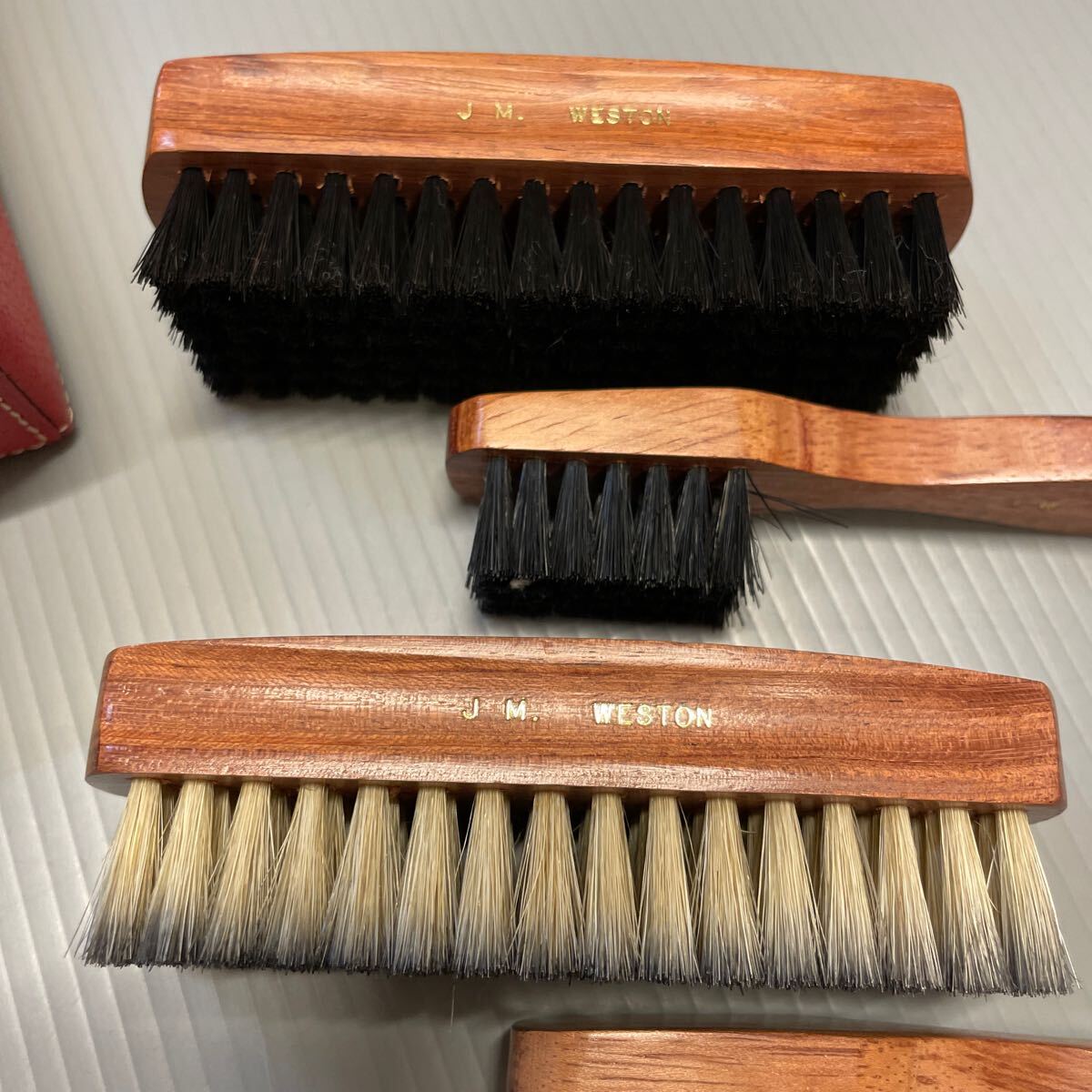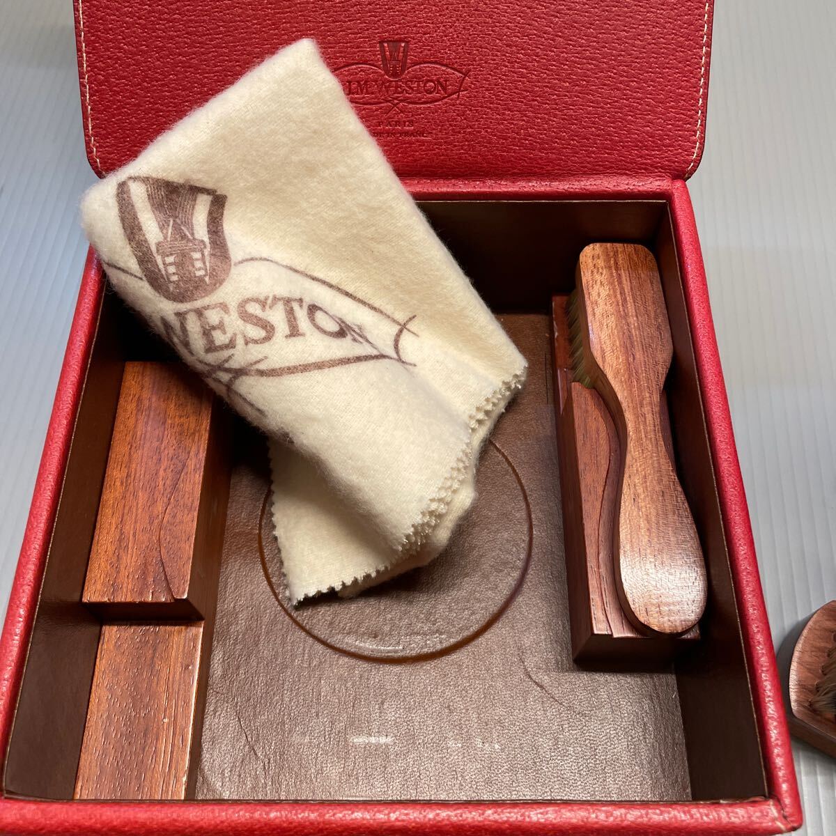 J.M.WESTON J.M.ウエストン 純正 ケアアイテム レザーケース入り木製持ち手 ブラシセット 純正ブラッククリームで1~2度使用品の程度良好自宅保管品になります。