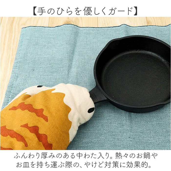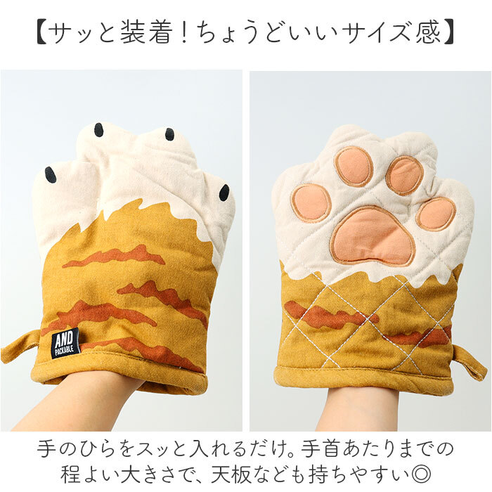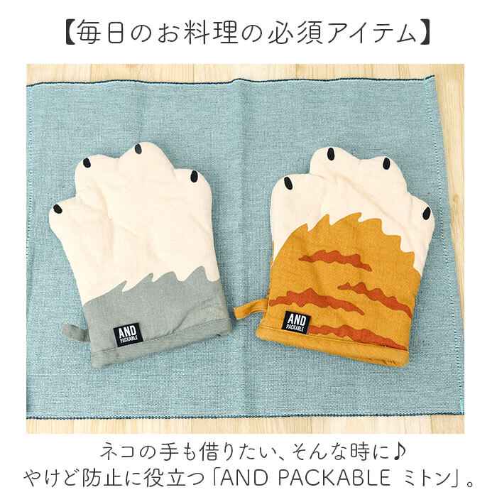 商品説明 | ・・【毎日のお料理の必須アイテム】 ・ネコの手も借りたい、そんな時に♪やけど防止に役立つ「AND PACKABLE ミトン」。 ・【空間の可愛らしいアクセント】 ・ネコちゃんのお手々モチーフ。思わずほっこりするデザインで、キッチンのワンポイントに。 ・【手のひらを優しくガード】 ・ふんわり厚みのある中わた入り。熱々のお鍋やお皿を持ち運ぶ際の、やけど対策に効果的。 ・【サッと装着!ちょうどいいサイズ感】 ・手のひらをスッと入れるだけ。手首あたりまでの程よい大きさで、天板なども持ちやすい◎ ・【収納ラクラク◎ループ付き】 ・フックなどに掛けておけば、いつでもサッと取り出しOK。壁掛け収納で置き場に困らず快適。 ・【お気に入りのネコちゃんをチョイス】 ・人気のネコちゃん模様をラインナップ。デザイン違いで揃えたり、プレゼントにも! |