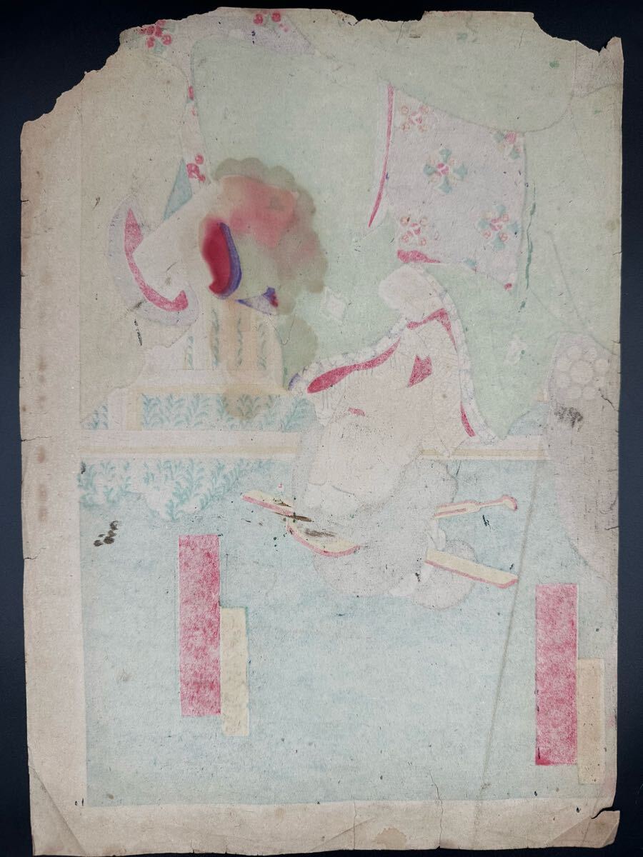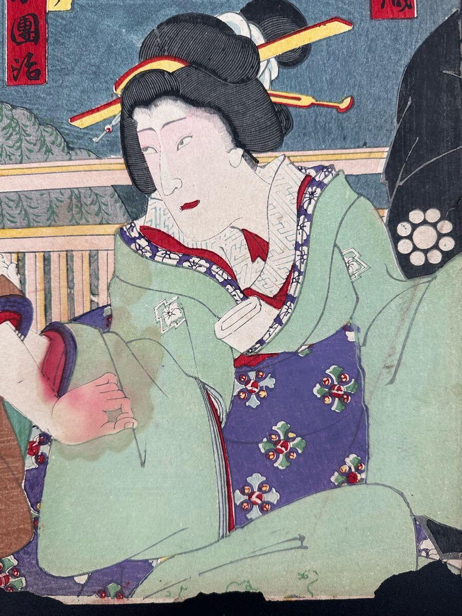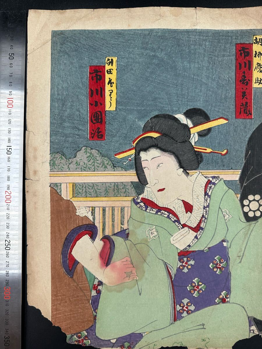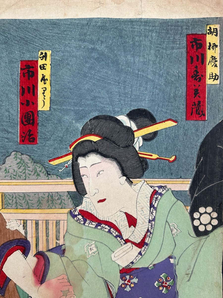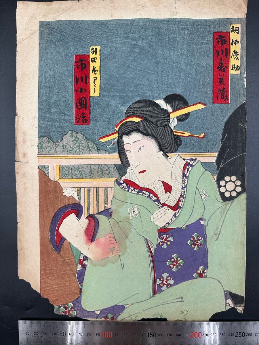 【真作】明治期 本物浮世絵木版画 「市川小団治」美人画 大判 錦絵 保存良い