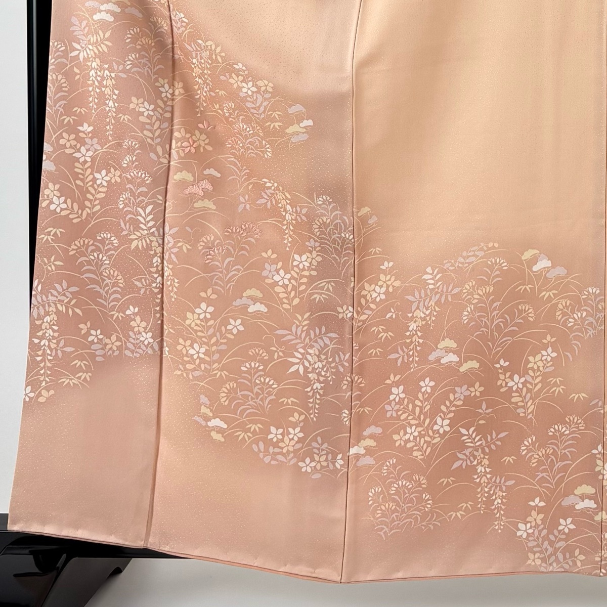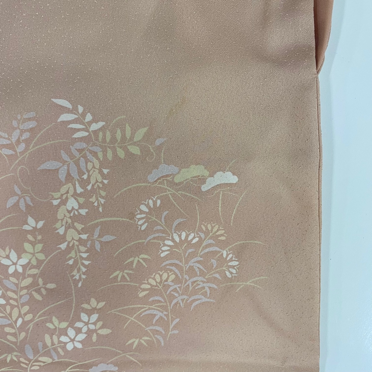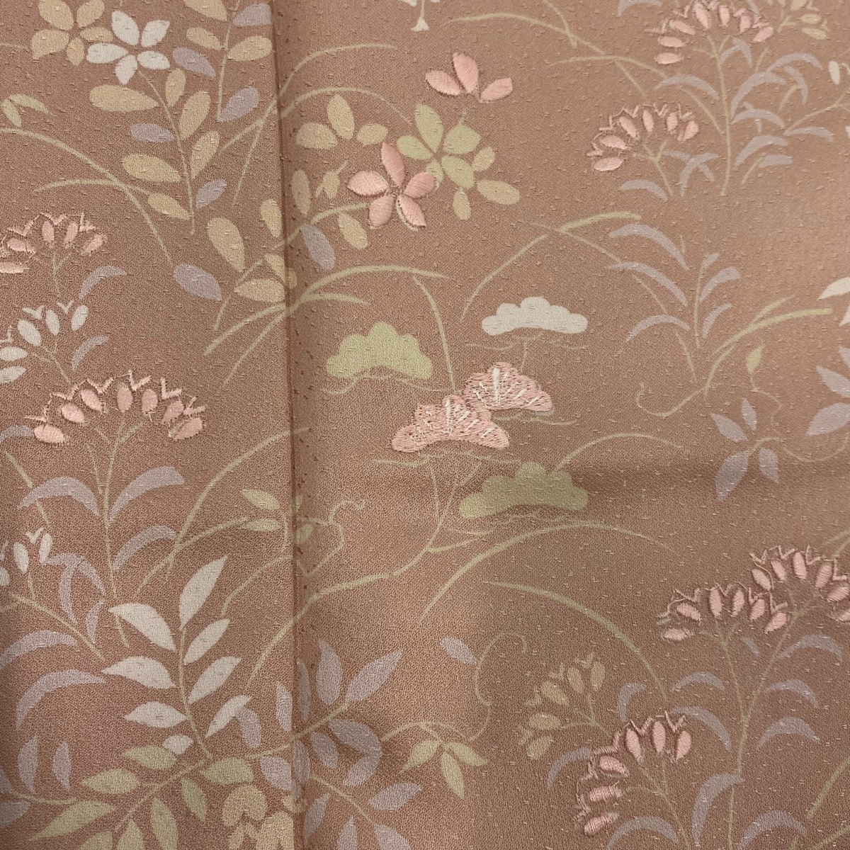 | 付下げ 秀品 笠松 草花 刺繍 ぼかし ピンクベージュ 袷 身丈161 裄丈64.5 M 正絹 【中古】 |