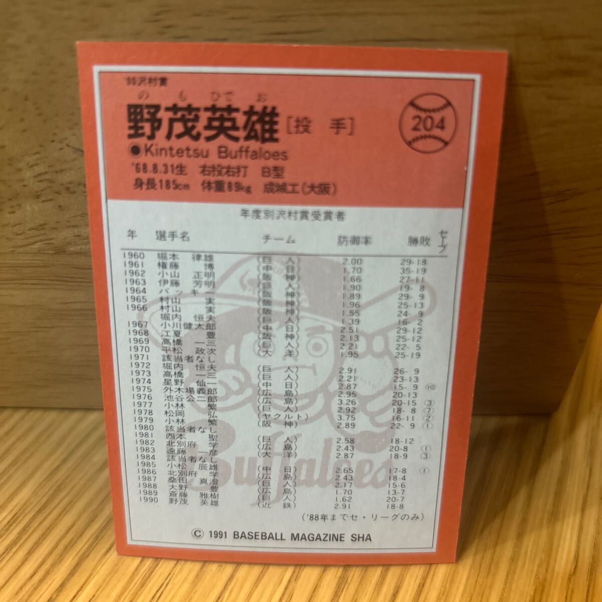 野茂英雄 沢村賞 近鉄バファローズ 1991BBM 204