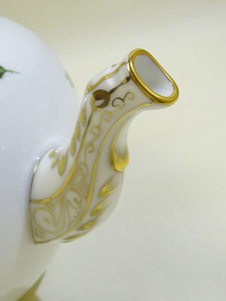 白磁の上に、小さなピンクの薔薇がふんわりと舞うこのティーポットは、絵柄は比較的控えめながらも品格が漂う品です。