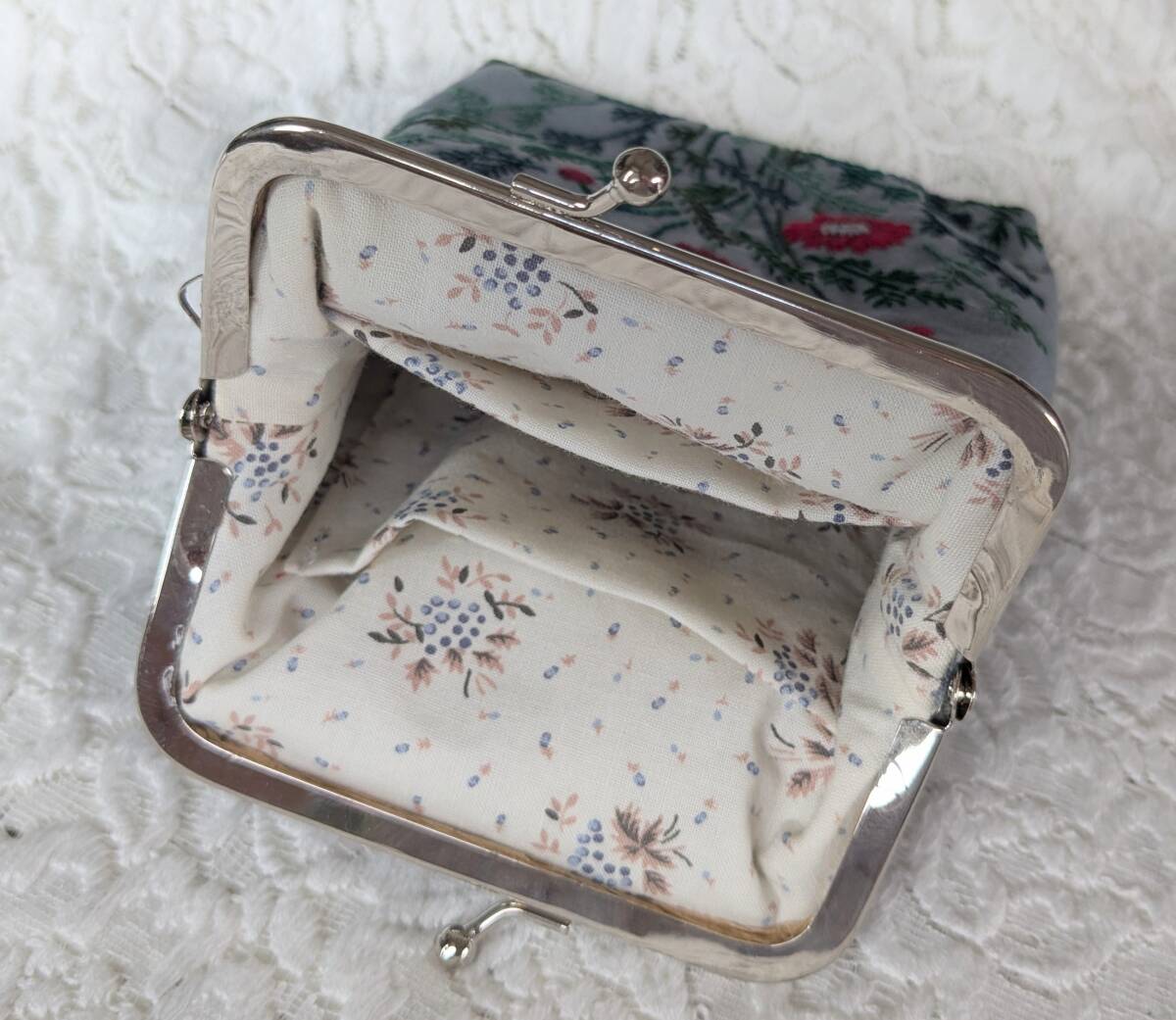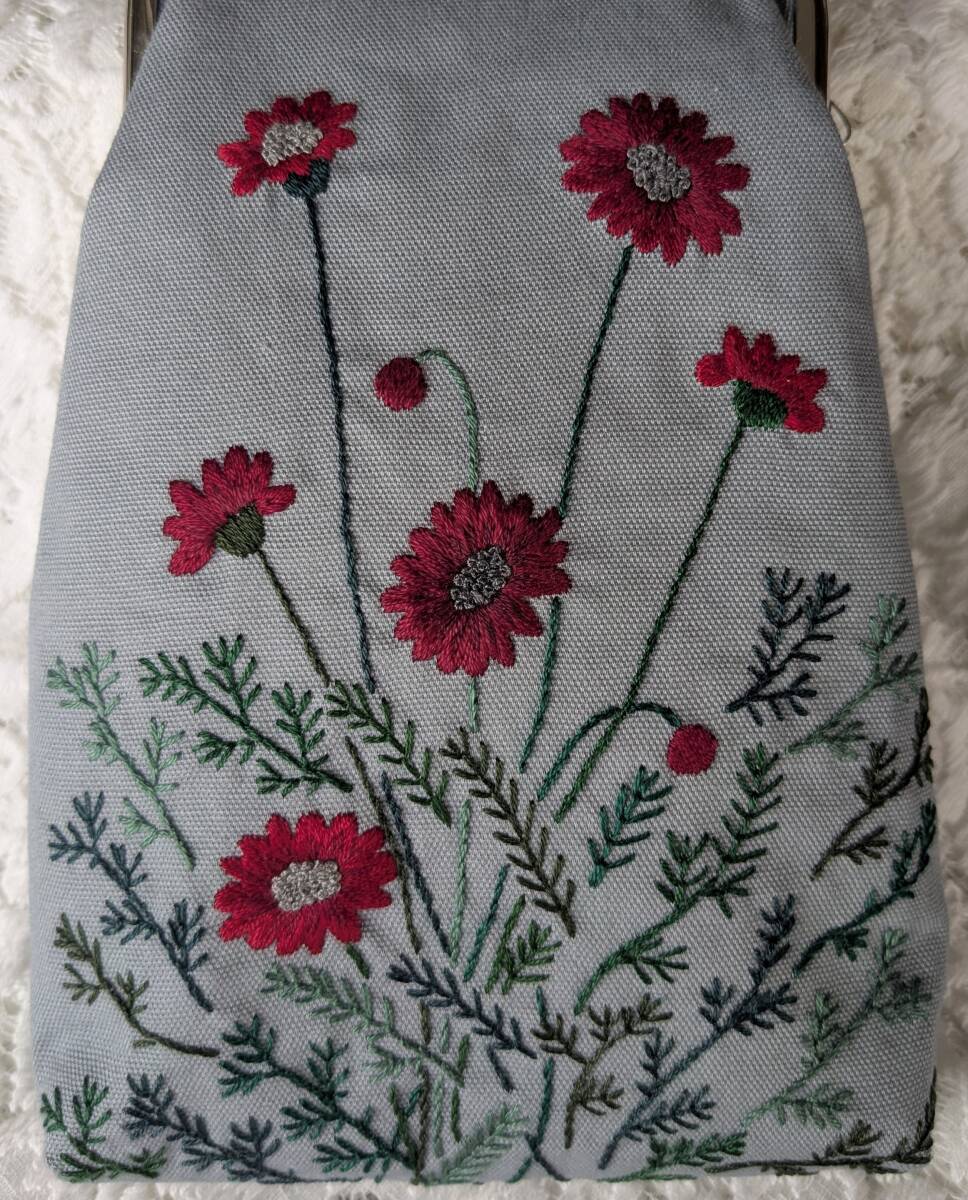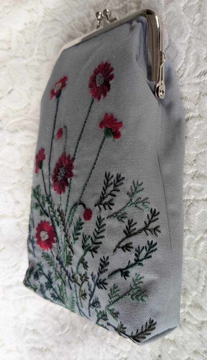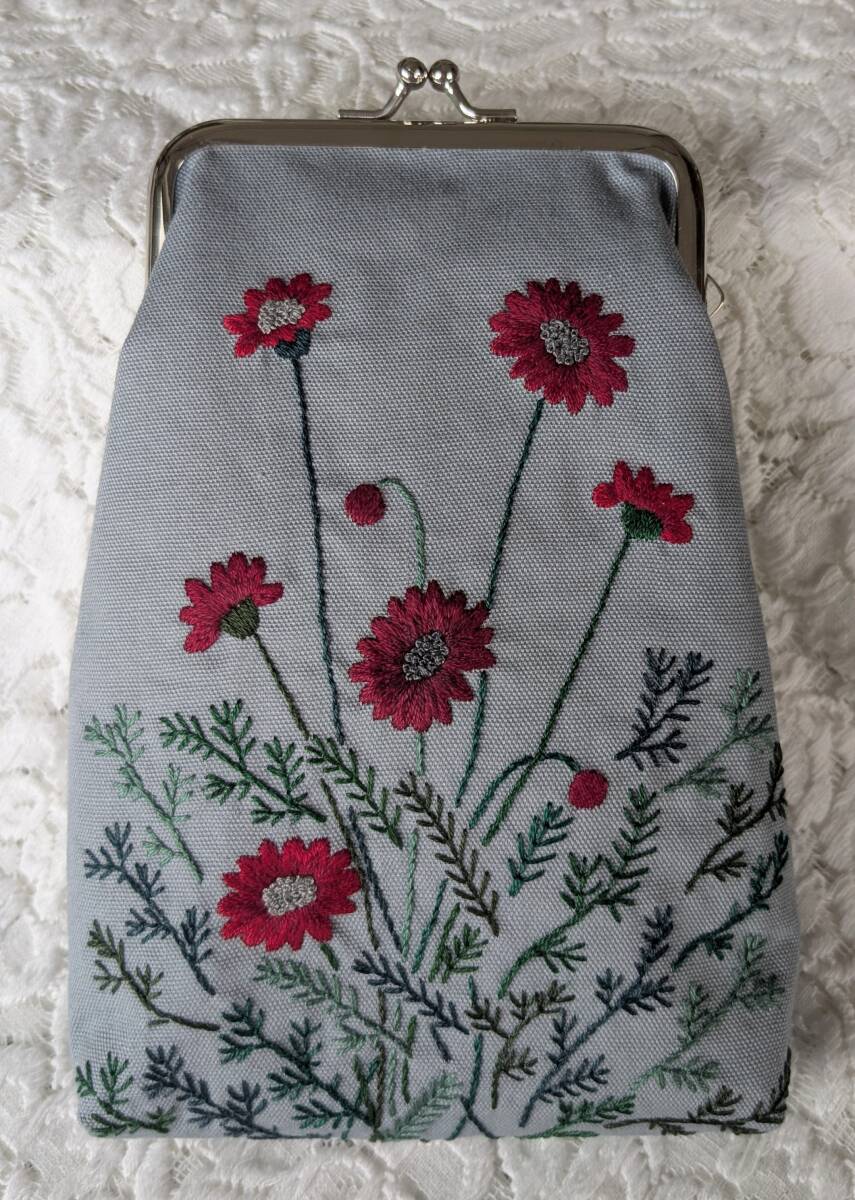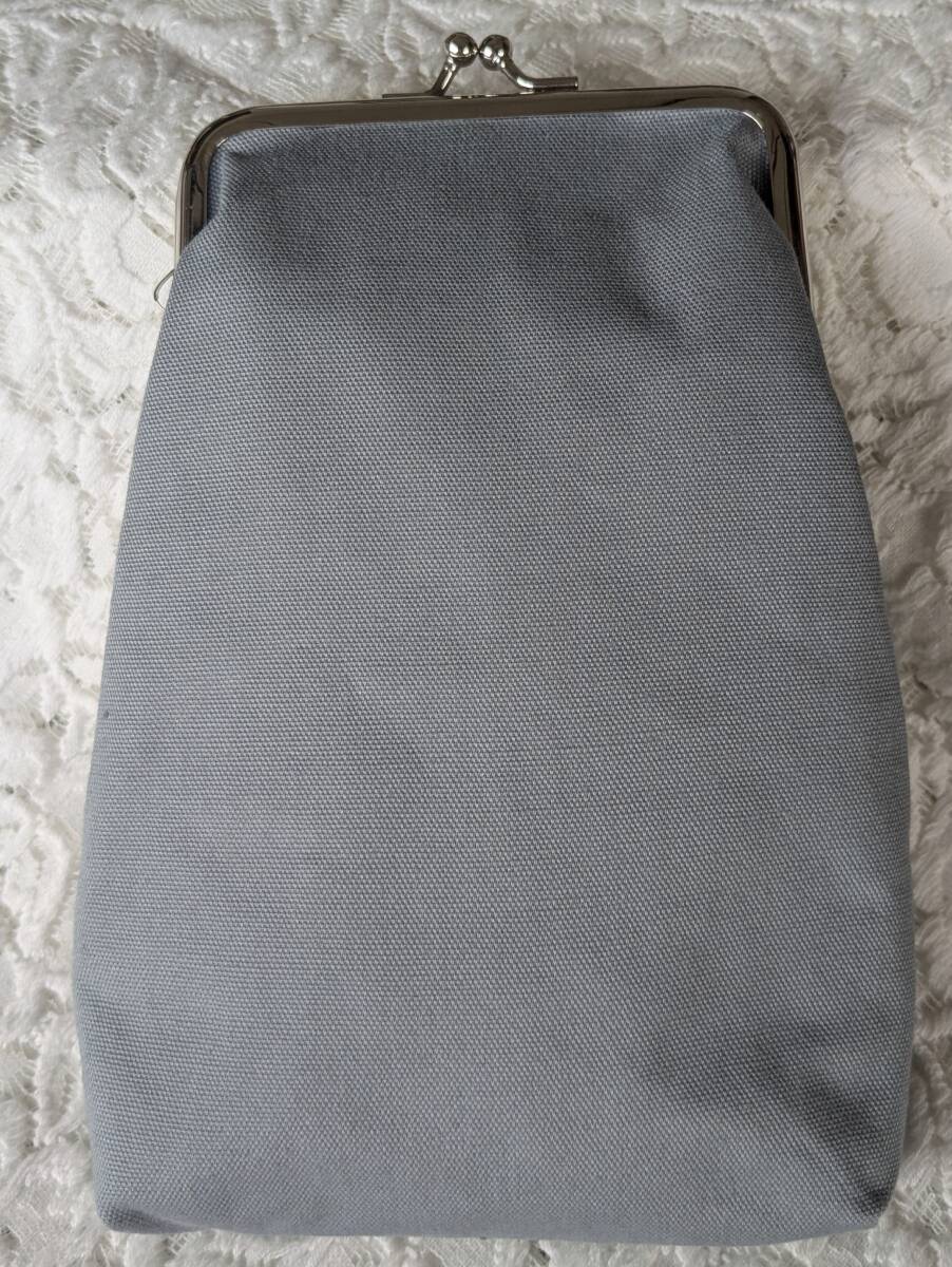 ハンドメイド 手刺しゅうの口金ポーチ 大 グレイ