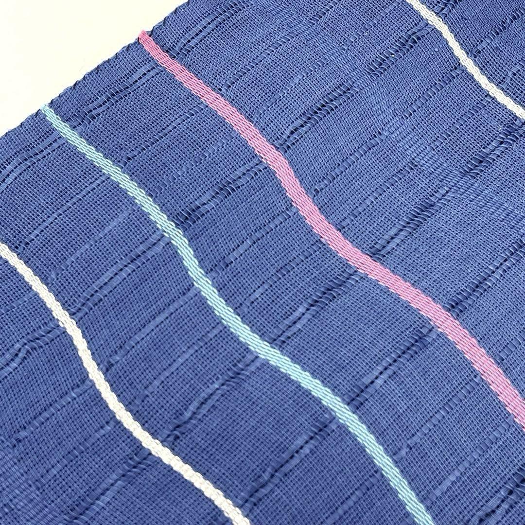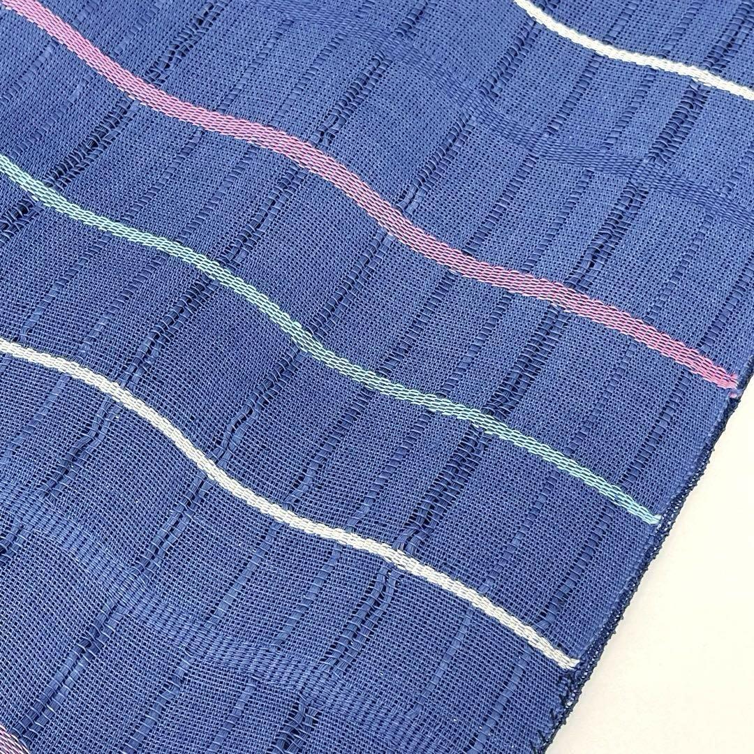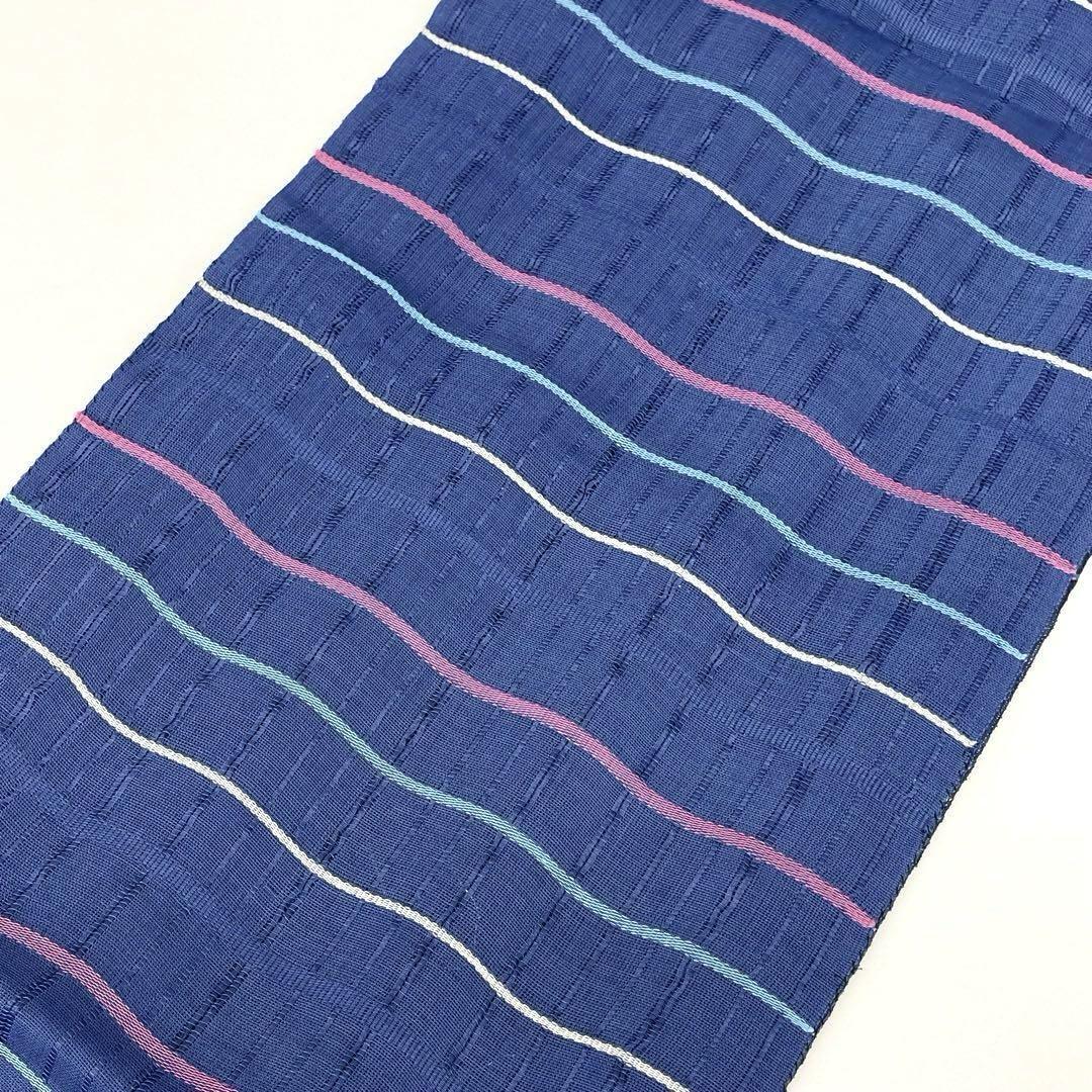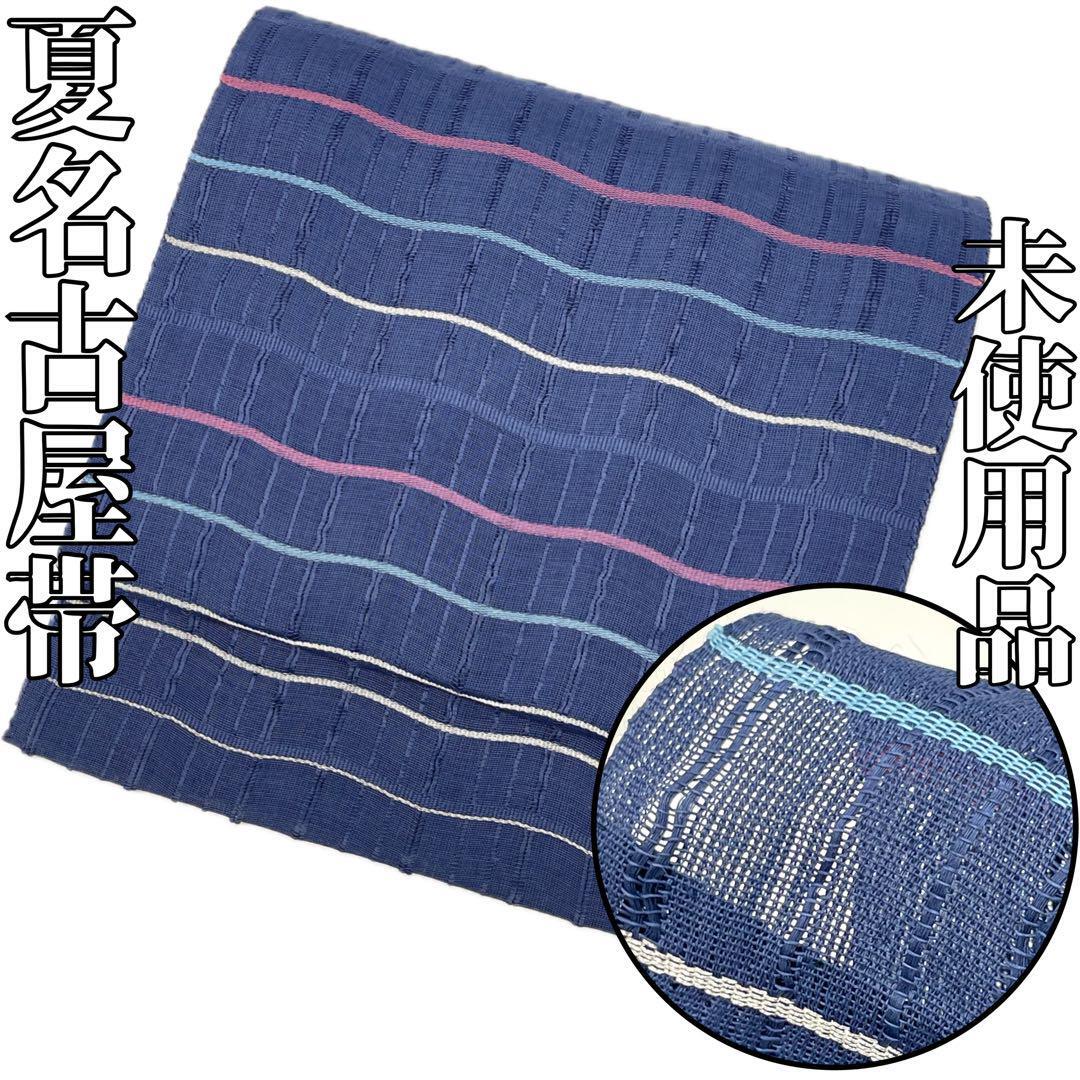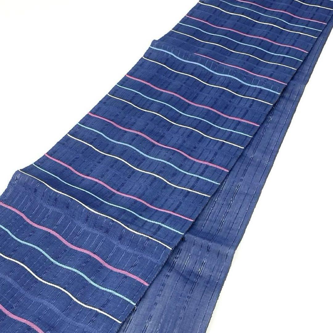 ピンク・水色・白色のラインが涼やかに走る夏の名古屋帯。