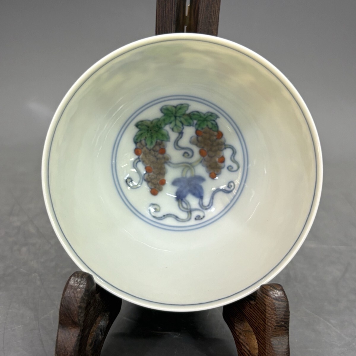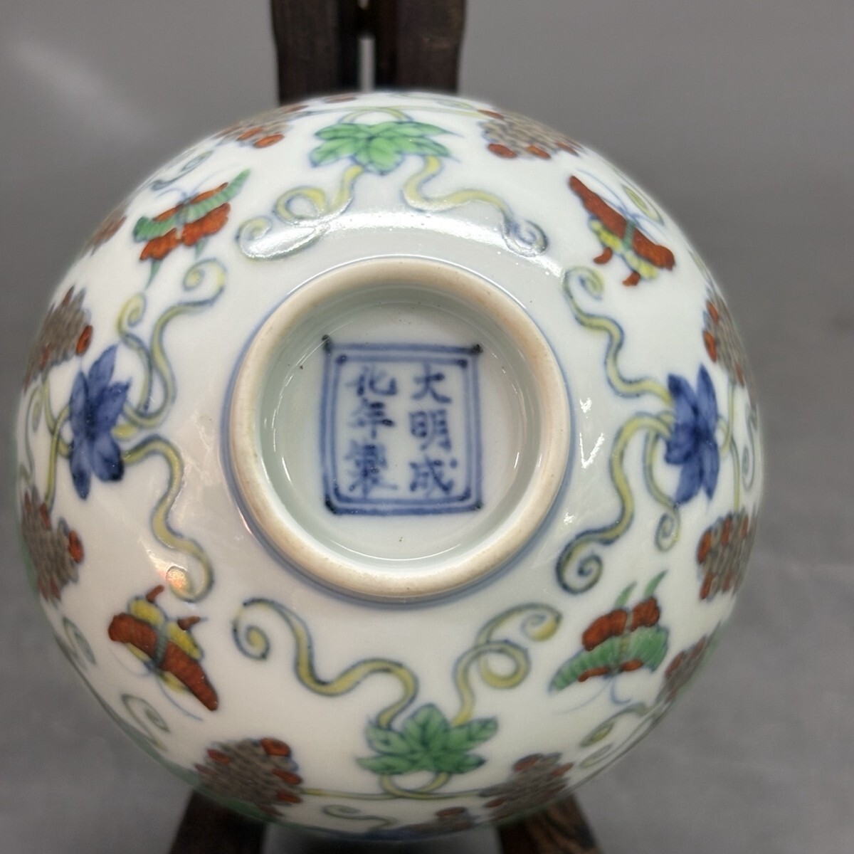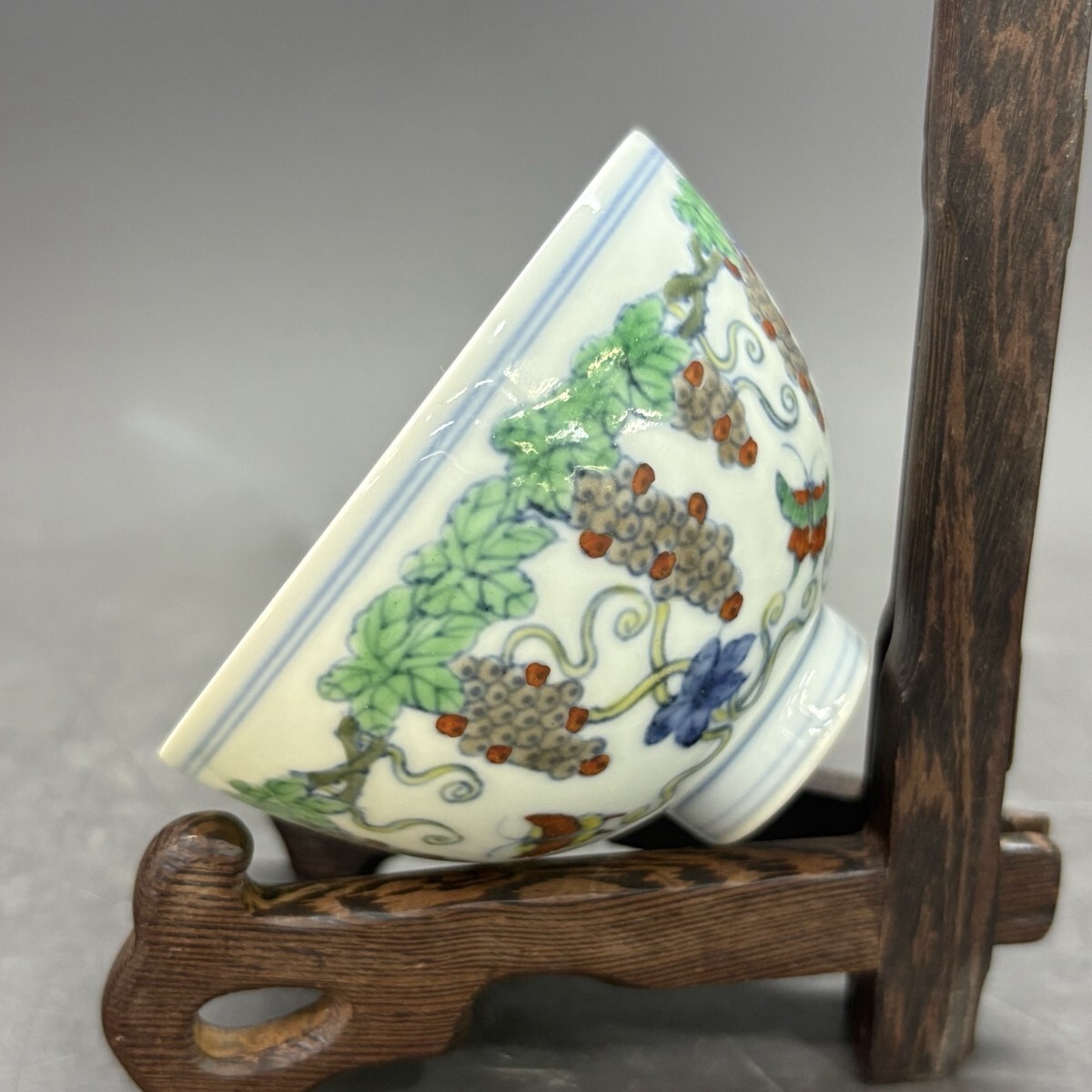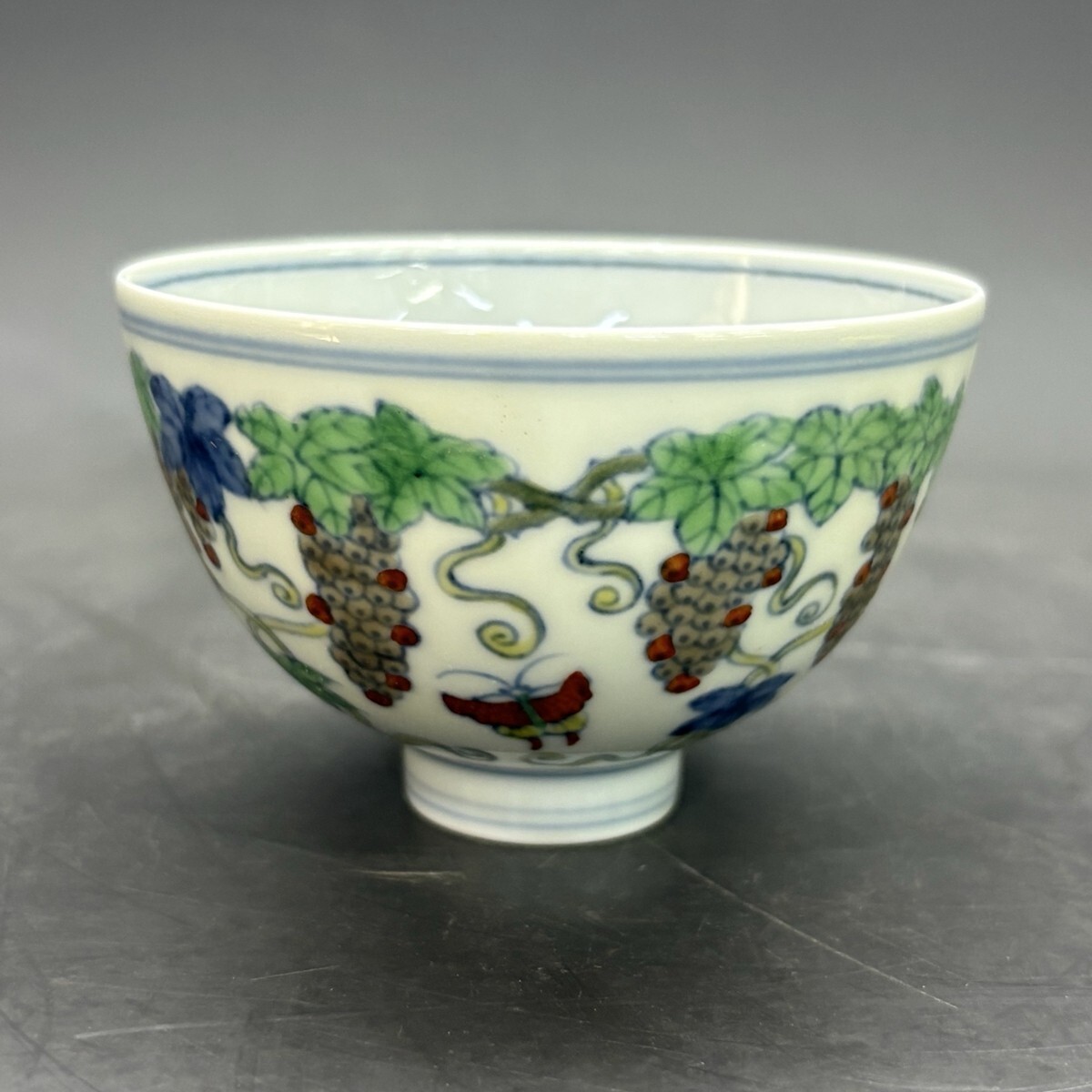 「明 成化年製 陶磁器 鬥彩蝴蝶葡萄紋 杯一対」染付 置物 擺件 古賞物 中国古美術 旧蔵出