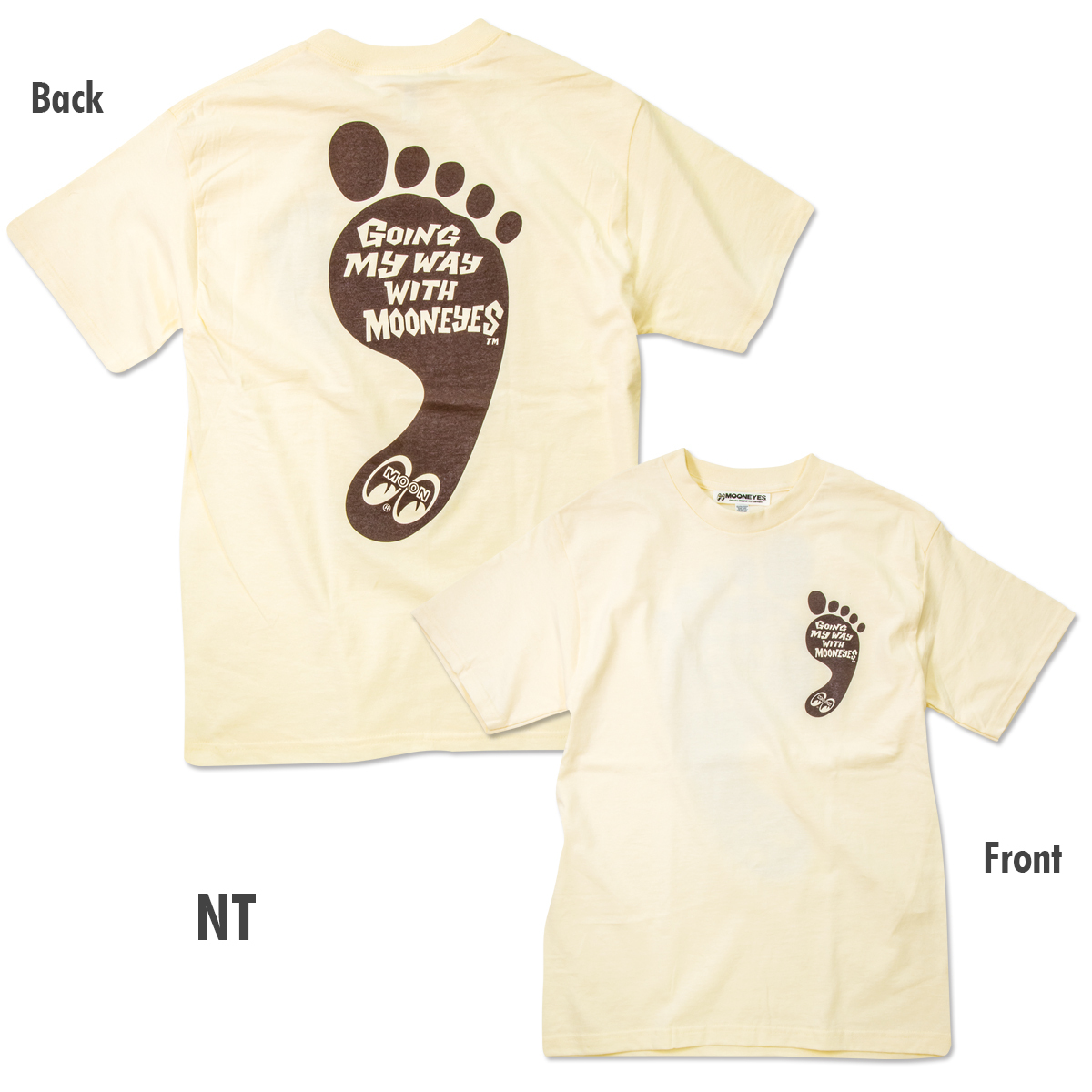 Michi NATQQ がデザインした ベアフットに「GOING MY WAY WITH MOONEYES」のメッセージが映えるT-shirt。