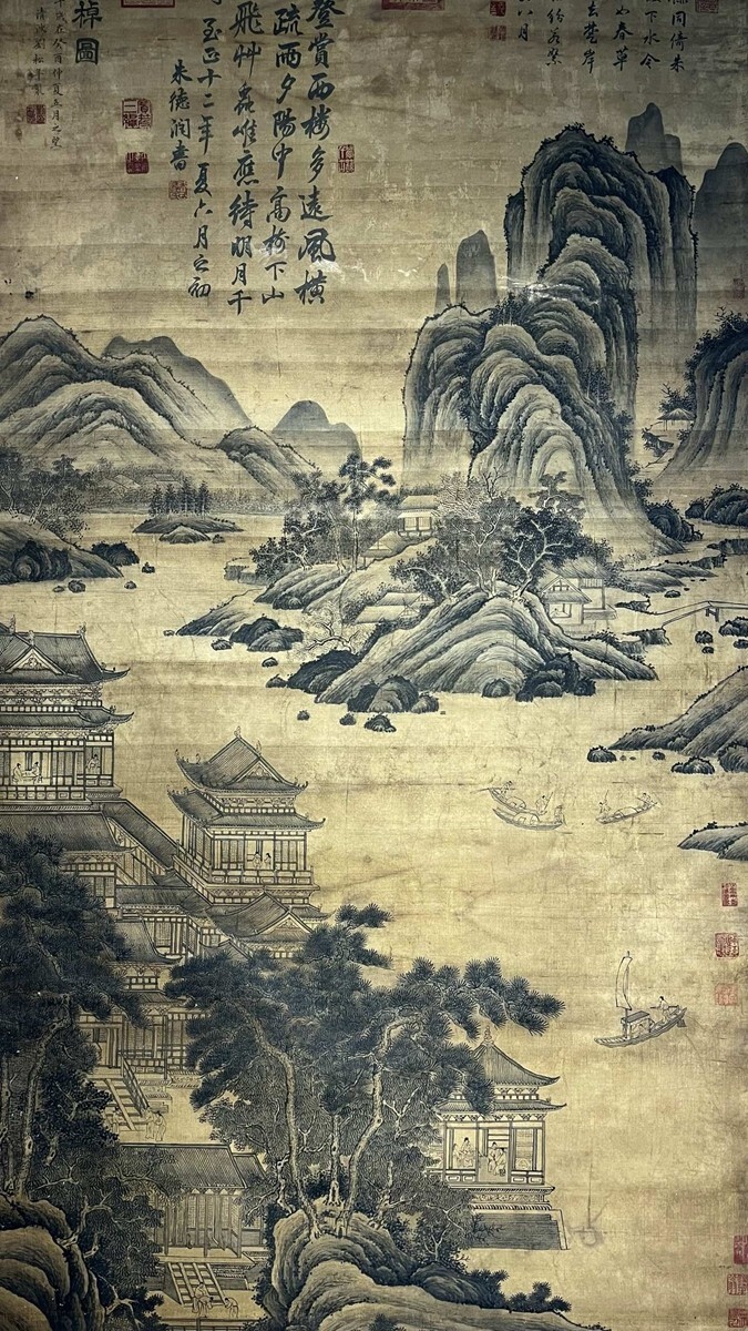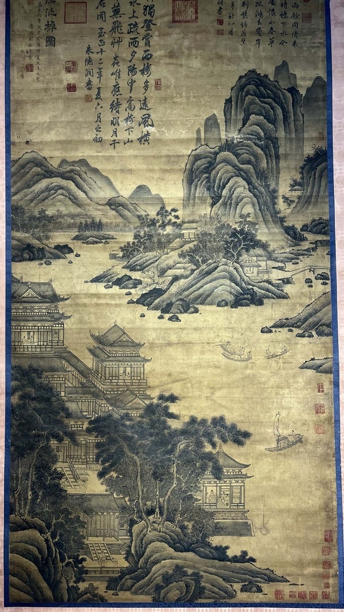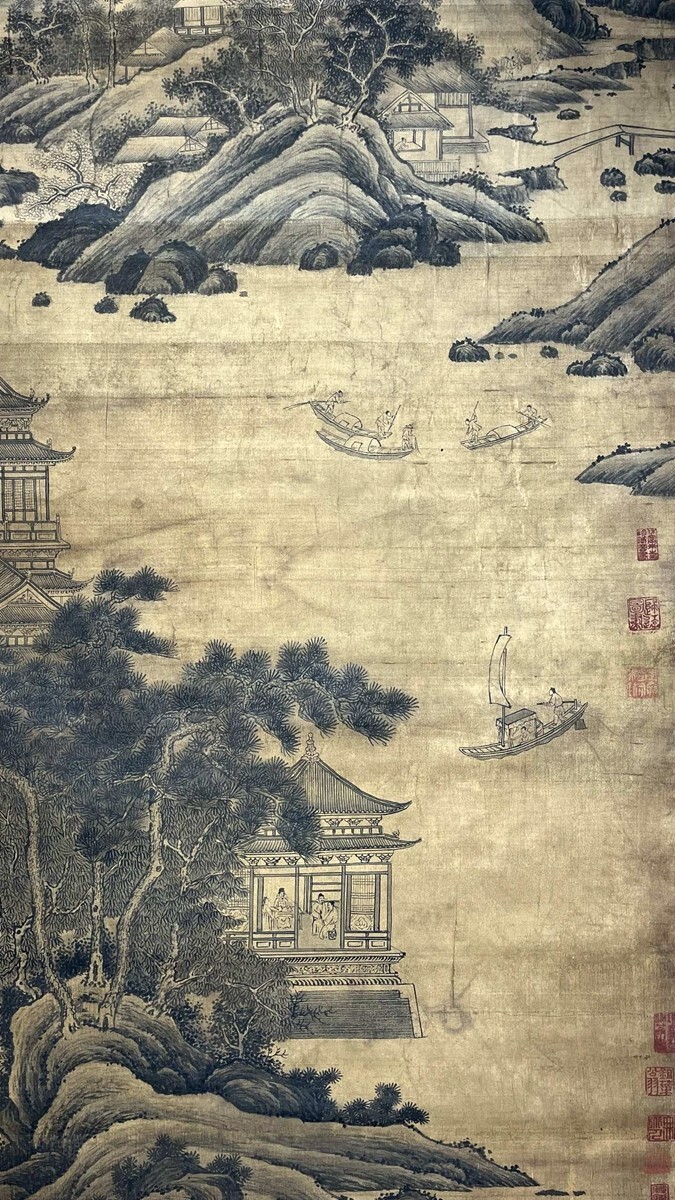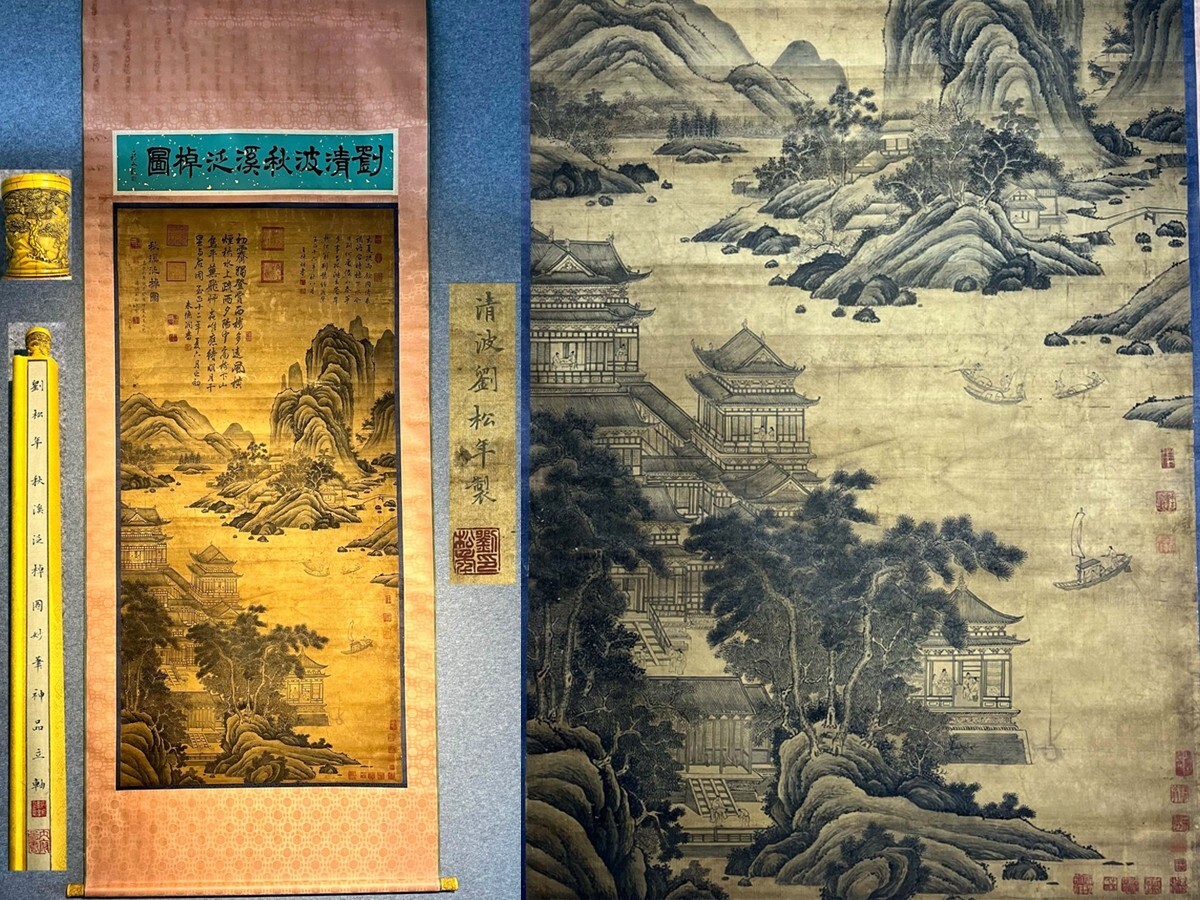 【瓏】「劉松年作 秋渓泛棹図」宋代画家 肉筆絹本 掛け軸 書画立軸 巻き物 中国書画 古美術 蔵出