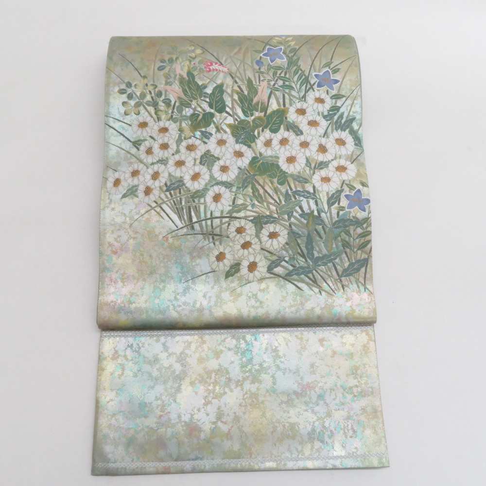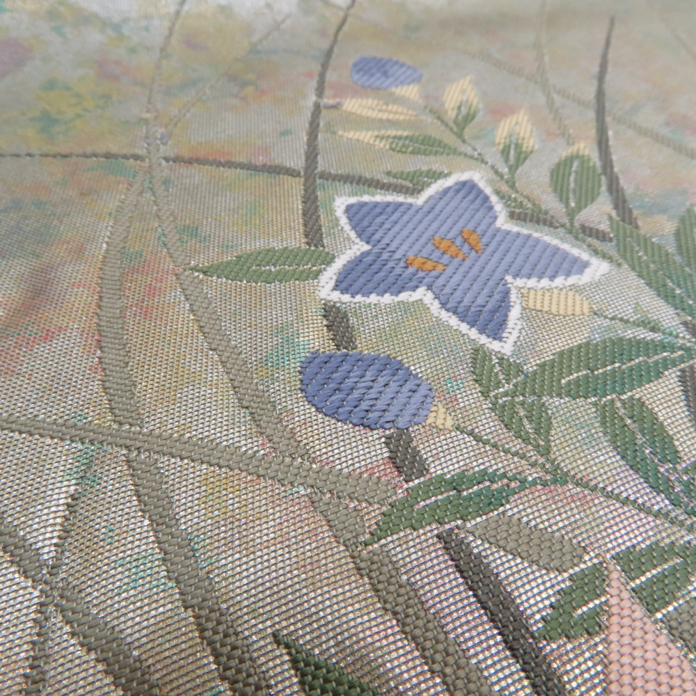 | 袋帯 金糸銀糸 お太鼓柄 オリーブグリーンx多色 草花文様 正絹 仕立て上がり 長さ440cm |