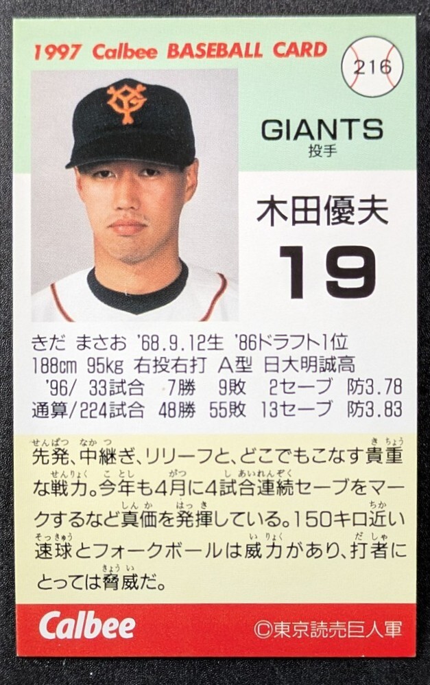 【1997 カルビー/Calbee】読売ジャイアンツ 木田優夫【カードNo.216】
