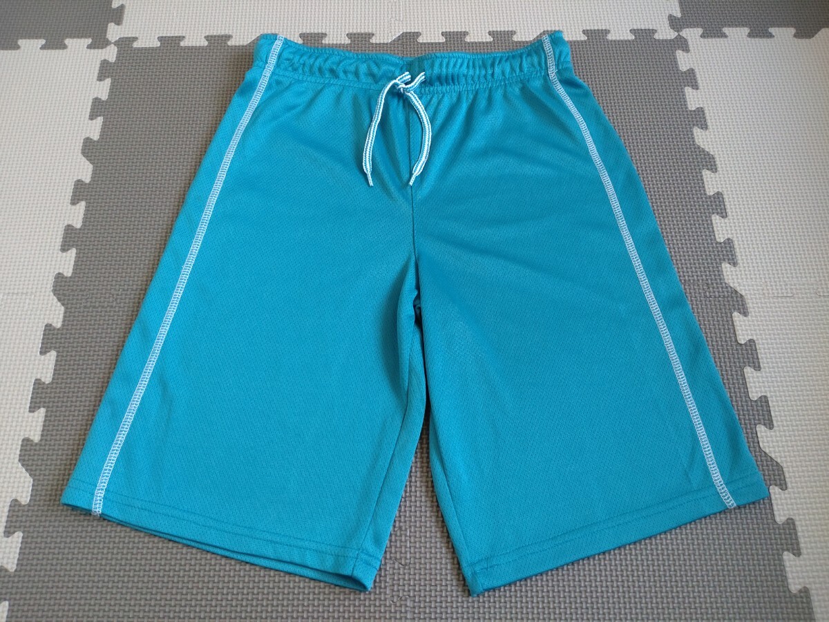 ターコイズのストライプ入りハーフパンツ、ゴムウエストで快適な着心地。