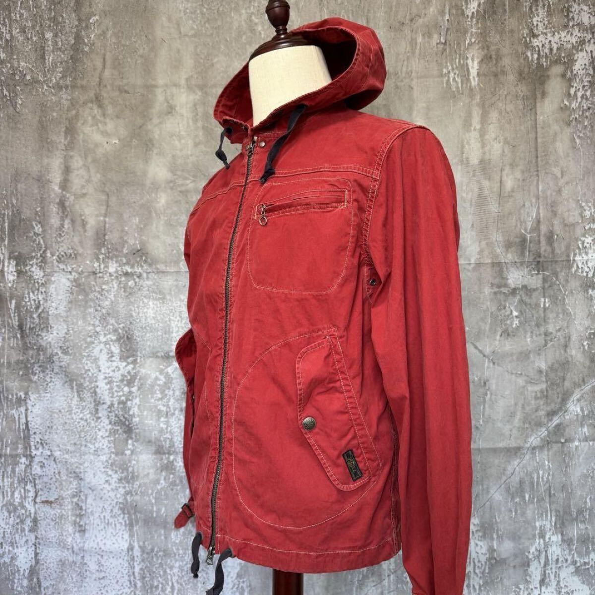 フェード感のある赤色、タロンジップ、バックル付きの袖口、背面ポケットなど、