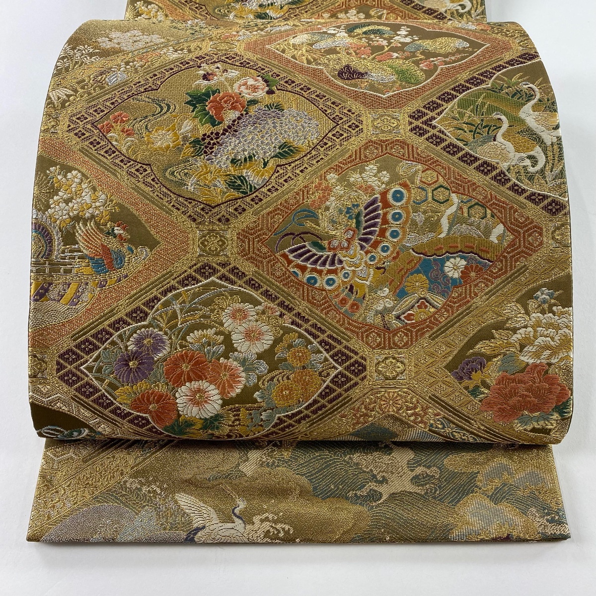 | 袋帯 美品 秀品 草花 蝶 金銀糸 箔 金色 六通 正絹 【中古】 |