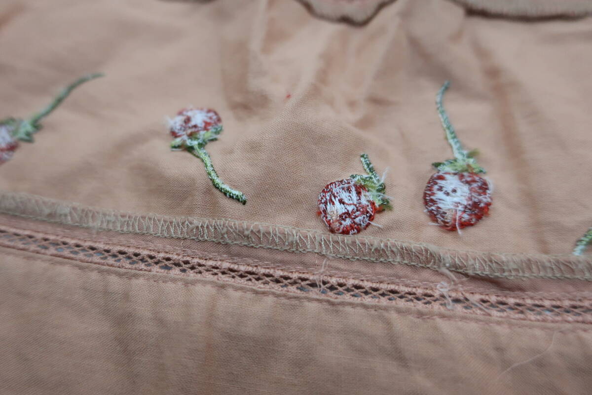 程度:全体的にシワ、ヨレ、擦れ、色褪せなど感じられ、裾内外に糸の飛び出しが見受けられます。